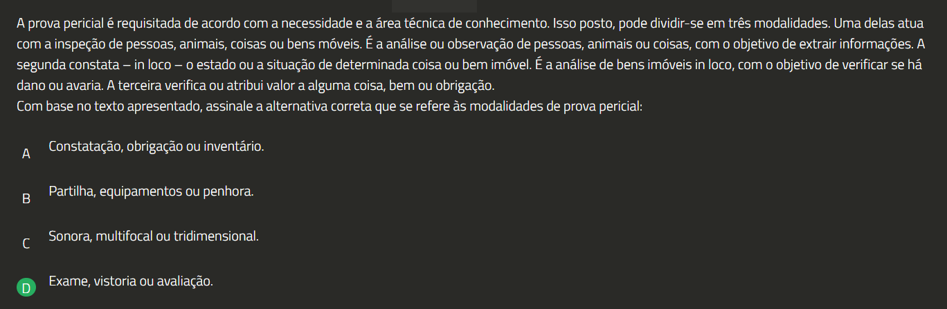 A prova pericial é requisitada de acordo com a necessidade e a área técnica de conhecimento. Isso posto, pode dividir-se em três modalidades. Uma delas atua com a inspeção de pessoas, animais, coisas ou bens móveis. É a análise ou observação de pessoas, animais ou coisas, com 0 objetivo de extrair informações. A segunda constata - in loco - 0 estado ou a situação de determinada coisa ou bem imóvel. É a análise de bens imóveis in loco, com 0 objetivo de verificar se há dano ou avaria. A terceira verifica ou atribui valor a alguma coisa, bem ou obrigação. Com base no texto apresentado, assinale a alternativa correta que se refere às modalidades de prova pericial: A Constatação, obrigação ou inventário. B Partilha, equipamentos ou penhora. Sonora, multifocal ou tridimensional. D Exame, vistoria ou avaliação.