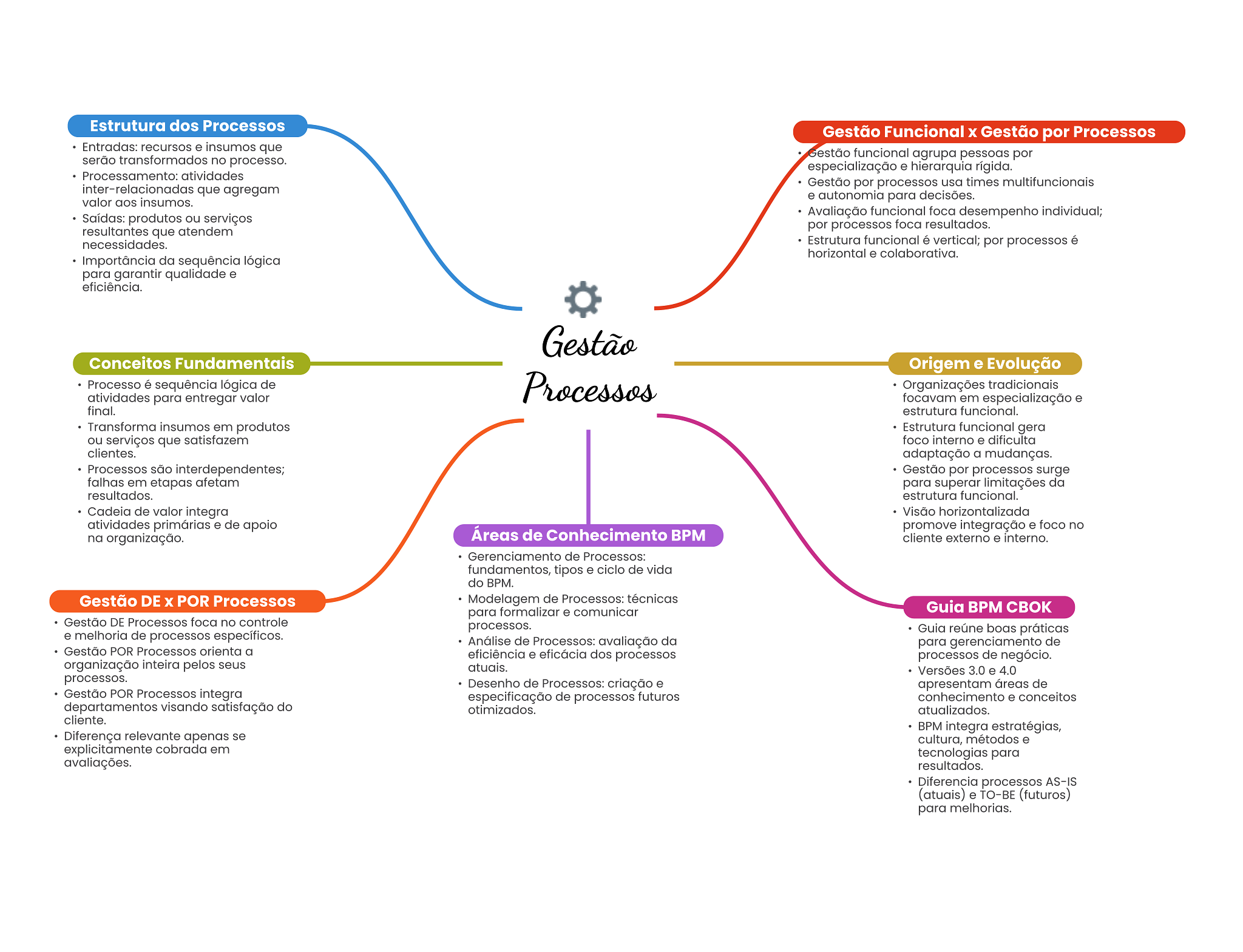 Estrutura dos Processos Gestão Funcional Gestão por Processos Entradas: recursos e insumos que Gestão funcional agrupa pessoas por serão transformados no processo. especialização e hierarquia rígida. Processamento: atividades Gestão por processos usa times multifuncionais inter-relacionadas que agregam valor aos insumos. e autonomia para decisões. Avaliação funcional foca desempenho individual; Saídas: produtos ou serviços por processos foca resultados. resultantes que atendem necessidades. Estrutura funcional é vertical; por processos é horizontal e colaborativa. Importância da sequência lógica para garantir qualidade e eficiência. Gestão Conceitos Fundamentais Origem e Evolução Processo é sequência lógica de Processos Organizações tradicionais atividades para entregar valor focavam em especialização e final. estrutura funcional. Transforma insumos em produtos Estrutura funcional gera ou serviços que satisfazem foco interno e dificulta clientes. adaptação a mudanças. Processos são interdependentes; Gestão por processos surge falhas em etapas afetam para superar limitações da resultados. estrutura funcional. Cadeia de valor integra Visão horizontalizada atividades primárias e de apoio promove integração e foco no na organização. Áreas de Conhecimento BPM cliente externo e interno. Gerenciamento de Processos: fundamentos, tipos e ciclo de vida do BPM. Gestão DE POR Processos Modelagem de Processos: técnicas para formalizar e comunicar Guia BPM CBOK Gestão DE Processos foca no controle processos. Guia reúne boas práticas e melhoria de processos específicos. Análise de Processos: avaliação da para gerenciamento de Gestão POR Processos orienta a eficiência e eficácia dos processos processos de negócio. organização inteira pelos seus atuais. Versões 3.0 e 4.0 processos. Desenho de Processos: criação e apresentam áreas de Gestão POR Processos integra especificação de processos futuros conhecimento e conceitos departamentos visando satisfação do otimizados. atualizados. cliente. BPM integra estratégias, Diferença relevante apenas se cultura, métodos e explicitamente cobrada em tecnologias para avaliações. resultados. Diferencia processos AS-IS (atuais) e TO-BE (futuros) para melhorias.
