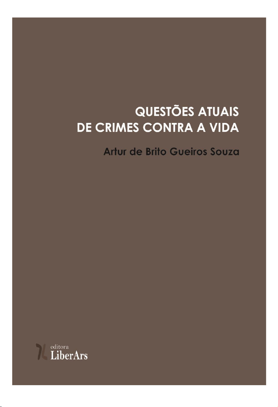 QUESTÕES ATUAIS DOS CRIMES CONTRA A VIDA Comitê Científico Ary Baddini Tavares (UNIMESP) Andrés Falcone (Universidad Nacional de Mar del Plata, Argentina) Alessandro Octaviani (USP-SP) Daniel Arruda Nascimento (UFF-RJ) Eduardo Saad-Diniz (USP, Ribeirão Preto) Isabel Lousada (Universidade Nova de Lisboa, Portugal) Jorge Miranda de Almeida (UESB-BA) Marcia Tiburi Marcelo Martins Bueno (Mackenzie) Miguel Polaino-Orts (Universidade de Sevilha, Espanha) Maurício Cardoso (FFLCH – USP) Maria J. Binetti (CONICET, ARG) Michelle Vasconcelos de Oliveira Nascimento (FURG-RS) Paulo Roberto Monteiro Araújo (Mackenzie-SP) Patricio Sabadini (Universidad Cuenca del Plata, ARG) Rodrigo Santos de Oliveira (FURG-RS) Sandra Caponi (UFSC-SC) Sandro Luiz Bazzanella (Universidade do Contestado - UnC) Tiago Almeida (USP-SP) Saly Wellausen (USP-SP) ARTUR DE BRITO GUEIROS SOUZA QUESTÕES ATUAIS DOS CRIMES CONTRA A VIDA 1ª edição LiberArs São Paulo – 2016 Questões atuais de crimes contra a vida © 2016, Editora LiberArs Ltda. Direitos de edição reservados à Editora LiberArs Ltda ISBN 978-85-9459-025-1 Editores Fransmar Costa Lima Lauro Fabiano de Souza Carvalho Revisão técnica Cesar Lima Editoração e capa Simone Alauk Impressão e acabamento Gráfica Rotermund Dados Internacionais de Catalogação na Publicação – CIP Bibliotecária responsável Neuza Marcelino da Silva – CRB 8/8722 Todos os direitos reservados. A reprodução, ainda que parcial, por qualquer meio, das páginas que compõem este livro, para uso não individual, mesmo para fins didáticos, sem autorização escrita do editor, é ilícita e constitui uma contrafação danosa à cultura. Foi feito o depósito legal. Editora LiberArs Ltda www.liberars.com.br contato@liberars.com.br Processo isbn 025-1 mailto:contato@liberars.com.br Dedico esta obra a Milena Cursino Rodrigues, com todo meu Amor! SUMÁRIO APRESENTAÇÃO ...................................................................................................................... 11 Introdução ................................................................................................................................. 13 1. Considerações iniciais......................................................................... 13 2. Bem jurídico tutelado nos crimes contra a vida. ............................... 14 Capítulo Primeiro Do Homicídio ........................................................................................................................... 17 1. Introdução. ........................................................................................... 18 2. Bem jurídico protegido. ....................................................................... 20 3. Sujeito ativo. ......................................................................................... 21 4. Sujeito passivo. ..................................................................................... 21 5. Tipo objetivo......................................................................................... 22 6. Tipo subjetivo. ...................................................................................... 24 7. Consumação e tentativa. ...................................................................... 26 8. Homicídio privilegiado. ....................................................................... 28 8.1. Motivo de relevante valor social. ..................................................... 29 8.2. Motivo de relevante valor moral. Eutanásia e ortotanásia. ...................................................................................... 30 8.3. Domínio de violenta emoção, logo em seguida a injusta provocação da vítima. ..................................................................... 31 9. Homicídio qualificado. ......................................................................... 34 9.1 Homicídio praticado mediante paga ou promessa de recompensa ou por outro motivo torpe. ....................................... 35 9.2. Homicídio qualificado por motivo fútil. .......................................... 39 9.3. Homicídio qualificado pelo emprego de veneno, fogo, explosivo, asfixia, tortura ou outro meio insidioso, cruel ou que cause perigo comum. ................................................ 41 9.4. Homicídio cometido a traição, de emboscada, ou mediante dissimulação ou outro recurso que dificulte ou torne impossível a defesa do ofendido. .................................... 44 9.5. Homicídio cometido para assegurar a execução, a ocultação, a impunidade ou a vantagem de outro crime. ............................................................................................... 46 9.6. Feminicídio ........................................................................................ 49 9.7. Contra autoridades e agentes das Forças Armadas e de segurança pública, sistema prisional, Força Nacional e seus familiares. ................................................................................ 52 10. Premeditação e homicídio qualificado. ............................................ 54 11. Homicídio privilegiado-qualificado .................................................. 55 12. Homicídio culposo. ............................................................................ 57 12.1. Homicídio culposo e a teoria da imputação objetiva. .................. 59 12.2. Homicídio culposo na condução de veículo automotor. .............. 61 13. Causas de aumento de pena. ............................................................. 65 14. Perdão judicial ................................................................................... 68 15. Homicídio praticado por milícia privada ou por grupo de extermínio .................................................................................. 69 16. Aumento de pena no feminicídio. ..................................................... 70 17. Pena e ação penal. 