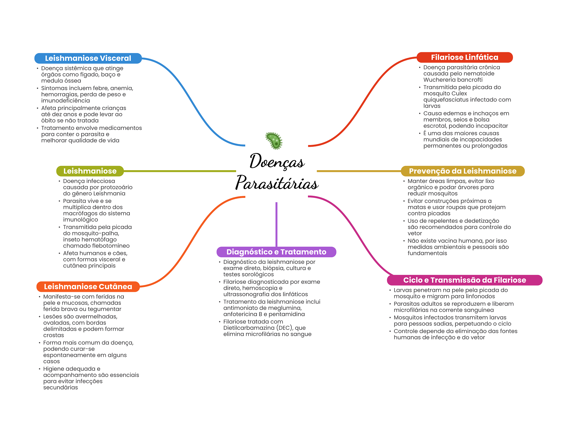 Leishmaniose Visceral Filariose Linfática Doença sistêmica que atinge Doença parasitária crônica órgãos como fígado, baço e causada pelo nematoide medula óssea Wuchereria bancrofti Sintomas incluem febre, anemia, Transmitida pela picada do hemorragias, perda de peso e mosquito Culex imunodeficiência quiquefasciatus infectado com Afeta principalmente crianças larvas até dez anos e pode levar ao Causa edemas e inchaços em óbito se não tratada membros, seios e bolsa Tratamento envolve medicamentos escrotal, podendo incapacitar para conter parasita e É uma das maiores causas melhorar qualidade de vida mundiais de incapacidades permanentes ou prolongadas Doenças Leishmaniose Prevenção da Leishmaniose Doença infecciosa causada por protozoário Parasitárias Manter áreas limpas, evitar lixo orgânico e podar árvores para do gênero Leishmania reduzir mosquitos Parasita vive e se Evitar construções próximas a multiplica dentro dos matas e usar roupas que protejam macrófagos do sistema contra picadas imunológico Uso de repelentes e dedetização Transmitida pela picada são recomendados para controle do do mosquito-palha, vetor inseto hematófago Não existe vacina humana, por isso chamado flebotomíneo medidas ambientais e pessoais são Afeta humanos e cães, Diagnóstico e Tratamento fundamentais com formas visceral e Diagnóstico da leishmaniose por cutânea principais exame direto, biópsia, cultura e testes sorológicos Filariose diagnosticada por exame Ciclo e Transmissão da Filariose Leishmaniose Cutânea direto, hemoscopia e Larvas penetram na pele pela picada do Manifesta-se com feridas na ultrassonografia dos linfáticos mosquito e migram para linfonodos pele e mucosas, chamadas Tratamento da leishmaniose inclui Parasitas adultos se reproduzem e liberam ferida brava ou tegumentar antimoniato de meglumina, microfilárias na corrente sanguínea Lesões são avermelhadas, anfotericina e pentamidina Mosquitos infectados transmitem larvas ovaladas, com bordas Filariose tratada com para pessoas sadias, perpetuando O ciclo delimitadas e podem formar Dietilcarbamazina (DEC), que crostas elimina microfilárias no sangue Controle depende da eliminação das fontes humanas de infecção e do vetor Forma mais comum da doença, podendo curar-se espontaneamente em alguns casos Higiene adequada e acompanhamento são essenciais para evitar infecções secundárias