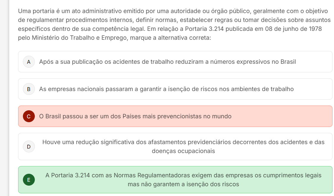 Uma portaria é um ato administrativo emitido por uma autoridade ou órgão público, geralmente com O objetivo de regulamentar procedimentos internos, definir normas, estabelecer regras ou tomar decisões sobre assuntos específicos dentro de sua competência legal. Em relação a Portaria 3.214 publicada em 08 de junho de 1978 pelo Ministério do Trabalho e Emprego, marque a alternativa correta: A Após a sua publicação acidentes de trabalho reduziram a números expressivos no Brasil B As empresas nacionais passaram a garantir a isenção de riscos nos ambientes de trabalho Brasil passou a ser um dos Países mais prevencionistas no mundo Houve uma redução significativa dos afastamentos previdenciários decorrentes dos acidentes e das D doenças ocupacionais A Portaria 3.214 com as Normas Regulamentadoras exigem das empresas os cumprimentos legais E mas não garantem a isenção dos riscos