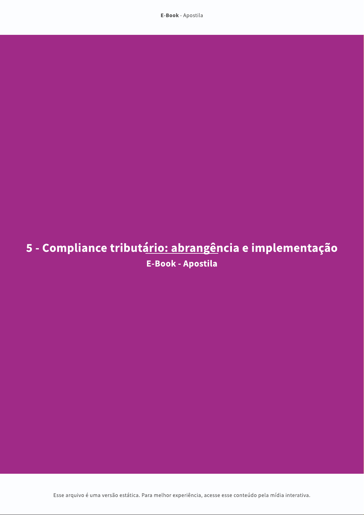 E-Book Apostila 5 - Compliance tributário: abrangência e implementação E-Book - Apostila Esse arquivo é uma versão estática. Para melhor experiência, acesse esse conteúdo pela mídia interativa.E-Book Apostila Compliance tributário: abrangência e implementação Vídeo Clique aqui para abrir vídeo sistema tributário brasileiro não apenas tem uma carga tributária elevadíssima como também é extremamente complexo, o que abre espaço para divergências na interpretação da norma tributária e para um enorme volume de contencioso administrativo e judicial. Diante dessa realidade, a adoção de uma adequada política de compliance tem se revelado uma necessidade no cenário tributário brasileiro. 2 - 32E-Book Apostila Isso porque, às vezes, não basta o interesse da empresa de estar em conformidade com a legislação, é necessária a criação de procedimentos internos e externos para auxiliar na decisão do contribuinte sobre qual conduta adotar, entre as várias possíveis, para cumprir suas obrigações tributárias, principais e acessórias, bem como para detectar e remediar qualquer desvio de conformidade que possa ocorrer. Esse é, portanto, verdadeiro significado de compliance tributário. Reflita De imediato, surge a questão: como os contribuintes devem proceder para implementar um compliance tributário efetivo? Leia a Parte II, capitulo 5 'PROGRAMAS DE COMPLIANCE: PROGRAMA DE INTEGRIDADE" da página 97 a 113. Acesse com seu login através do Ulife: https://integrada.minhabiblioteca.com.br/reader/b ooks/9786559640898/epubcfi/6/2[%3Bvnd.vst.idref%3Dcover]!/4/2/2%40512 CARVALHO, ANDRÉ, ET AL. MANUAL DE COMPLIANCE. DISPONÍVEL EM: MINHA BIBLIOTECA, (3RD EDIÇÃO). GRUPO GEN, 2021. Para implementar um compliance tributário efetivo, os contribuintes devem seguir um conjunto de etapas e medidas importantes. Aqui estão algumas orientações para esse processo. Análise e avaliação inicial Realizar uma análise abrangente da situação tributária da empresa é primeiro passo. Para tanto, é necessário identificar e entender as obrigações fiscais aplicáveis, a legislação relevante e os riscos fiscais associados às operações da empresa. Comprometimento da alta direção Considerar que o apoio e o comprometimento da alta direção são fundamentais para o sucesso do programa de compliance tributário. A liderança deve estabelecer uma cultura de conformidade e fornecer os recursos necessários para sua implementação.E-Book Apostila Estrutura organizacional Designar uma equipe responsável pela gestão do compliance tributário é essencial. Isso pode incluir profissionais especializados em tributação, contabilidade e área jurídica. Mapeamento de processos Identificar todos os processos que envolvem questões tributárias na empresa, que inclui desde a apuração de impostos até o preenchimento e envio de declarações fiscais. Políticas e procedimentos Desenvolver políticas e procedimentos claros que estabeleçam diretrizes para o cumprimento das obrigações tributárias. Essas políticas devem ser comunicadas a todos os colaboradores envolvidos e atualizadas conforme necessário. Monitoramento contínuo Implementar um sistema de monitoramento contínuo para verificar se os processos estão sendo executados conforme as políticas estabelecidas. Isso pode incluir auditorias internas regulares. Treinamento e conscientização Promover treinamentos e programas de conscientização sobre questões tributárias para funcionários. É fundamental garantir que todos entendam suas responsabilidades fiscais e os riscos associados ao não cumprimento das leis. Automação e tecnologia Utilizar soluções tecnológicas, como softwares de gestão tributária, para automatizar processos e melhorar a precisão na apuração e declaração de impostos. Atualização constanteE-Book Apostila Manter todos os envolvidos atualizados sobre as mudanças na legislação tributária e ajustar o programa de compliance de acordo com as novas exigências legais. Consultoria especializada Lembrar de que, em caso de dúvidas complexas ou situações específicas, é recomendável buscar aconselhamento de consultorias especializadas em questões tributárias. Ao final deste conteúdo, você será capaz de: Identificar os conceitos fundamentais de compliance tributário. Reconhecer as principais legislações e regulamentações relacionadas ao compliance tributário. Descrever os riscos e consequências do não cumprimento das obrigações fiscais exigidas por lei. Explicar a importância do compliance tributário para as empresas relação com a sustentabilidade dos negócios. Estudaremos agora as boas práticas de compliance tributário e medidas que rotina fiscal das empresas para melhorar a relação entre Fisco e contribuinte. Conheceremos alguns programas de compliance cooperativos, implementados por administrações fazendárias brasileiras, cujo cumprimento não apenas permitirá uma maior aderência à legislação tributária, mas implicará uma série de benefícios ao contribuinte, inclusive por intermédio de procedimentos mais simplificados e "alertas de inconformidade", com o objetivo de promover a autorregularização. Contudo, a verdadeira implementação de um compliance tributário na empresa depende fundamentalmente de uma transformação substancial na sua mentalidade e no aspecto cultural da corporação, sobretudo dos profissionais da área de tributos, os quais precisarão investir em capacitação para lidar adequadamente com cumprimento da legislação tributária (cada vez mais integrada digitalmente aos bancos de dados do Fisco) e desenvolver seu relacionamento com todas as áreas da empresa. Tudo isso porque o bom relacionamento com os setores de RH, Financeiro, Contábil e Jurídico, juntamente aos sistemas informatizados, garantirá a consistência e a qualidade da informação entregue em livros e declarações digitais. Essa qualidade das infor