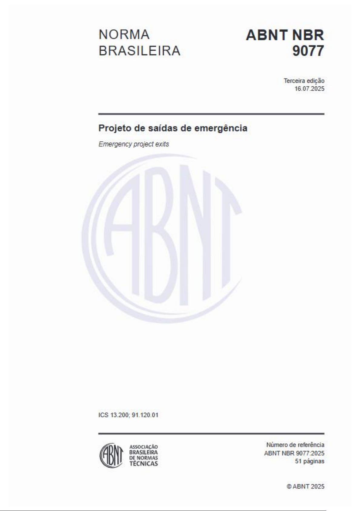 NORMA ABNT NBR BRASILEIRA 9077 Terceira edição 16.07.2025 Projeto de saídas de emergência Emergency project exits ICS 13.200; 91.120.01 ASSOCIAÇÃO Número de referência BRASILEIRA ABNT NBR 9077:2025 DE NORMAS TÉCNICAS 51 páginas © ABNT 2025ABNT NBR 9077:2025 ABNT © ABNT 2025 Todos os direitos reservados. A menos que especificado de outro modo, nenhuma parte desta publicação pode ser reproduzida ou utilizada por qualquer meio, eletrônico ou mecânico, incluindo fotocópia e microfilme, sem permissão por escrito da ABNT. ABNT Av. Treze de Maio, 13 andar 20031-901 Rio de Janeiro - RJ Tel.: + Fax: + 55 21 3974-2346 abnt@abnt.org.br www.abnt.org.br ii ABNT 2025 Todos os direitos reservadosABNT NBR 9077:2025 Sumário Página Prefácio vii Introdução viii 1 Escopo 1 2 Referências normativas 1 3 Termos e definições 2 4 Princípios gerais 7 4.1 Premissas para dimensionamento 7 4.2 Requisitos gerais 7 4.3 Características da população ocupante 7 4.4 Classificação das edificações quanto ao risco de vida 8 4.5 Perfil de risco de vida 9 5 Cálculo da população 10 5.1 Metodologia de cálculo 10 5.2 Densidade populacional por atividade 11 5.3 Locais com assentos fixos 14 6 Estratégias de abandono 15 6.1 Geral 15 6.2 Abandono simultâneo total 15 6.2.1 Geral 15 6.2.2 Estágios 15 6.2.3 Investigação 16 6.2.4 Emergência 16 6.3 Abandono horizontal progressivo 16 6.4 Abandono faseado 17 6.4.1 Geral 17 6.4.2 Requisitos 17 7 Rotas horizontais de saída 17 7.1 Dimensionamento das rotas de saída 17 7.2 Número de saídas nas rotas horizontais 17 7.2.2 Número mínimo de rotas horizontais de saída independentes 18 7.3 Rotas horizontais de saída alternativas 18 Rota única de saída horizontal 19 7.5 Condições aplicadas às rotas de saída horizontais 20 7.5.6 Larguras das rotas de saída horizontais 23 7.5.8 Requisitos adicionais para rotas horizontais 25 8 Subdivisão de corredores 26 8.1 Geral 26 8.2 Disposição de assentos fixos para efeito de saída 28 8.2.1 Requisitos gerais 28 8.2.2 Arranjo e dimensionamento 28 9 Rotas verticais de saída 29 © ABNT 2025 Todos os direitos reservadosABNT NBR 9077:2025 9.1 Requisitos gerais 29 9.2 Número de rotas verticais de saída 30 9.3 Saída única vertical 30 9.4 Largura das saídas verticais 30 9.4.2 Critérios para determinação da largura mínima 30 9.4.3 Largura para abandono simultâneo 30 9.4.4 Largura para abandono faseado 31 9.5 Escadas e rampas 31 9.5.1 Requisitos gerais 31 9.5.2 Tipos de escadas e rampas 32 9.5.3 Escolha do tipo de escada ou rampa 32 9.5.4 Escadas protegidas (EP) 33 9.5.5 Escadas protegidas com ventilação em seu acesso 35 9.5.6 Escada enclausurada com antecâmara ventilada diretamente para 0 exterior 36 9.5.7 Escadas e rampas enclausuradas à prova de fumaça (EPF) pressurizadas mecanicamente 37 9.5.8 Escada externa à prova de fumaça 37 9.5.9 Condições especiais de escadas 38 9.5.10 Condições especiais de rampas 38 9.6 Elevadores de emergência 39 Características construtivas e de operação 39 10 Descarga 39 10.1 Generalidades 39 10.2 Percurso das descargas 40 10.3 Dimensionamento 40 10.4 Catraca em rota de fuga 41 11 Áreas de refúgio 41 11.1 Generalidades 41 11.2 Requisitos 41 11.3 Exigibilidade 41 12 Portas em rotas de saída 42 12.1 Sentido de abertura 42 12.2 Barra antipânico 42 12.3 Acessibilidade 42 12.4 Largura mínima 42 12.4.1 Critérios para dimensionamento da largura mínima 42 12.4.2 Corredores e acesso de caixas de escadas 42 12.5 Porta vertical ou tipologia de giro 42 12.6 Portas especiais 43 12.6.1 Portas de enrolar 43 12.6.2 Portas de correr com sistema de abertura automática 43 Ferragens e acessórios 43 13 Sistemas complementares 43 iv © ABNT 2025 Todos direitos reservadosABNT NBR 9077:2025 13.1 de emergência 43 13.2 Sinalização de saídas de emergência 43 13.3 Sistema de detecção e alarme de incêndio 43 Anexo A (normativo) Sistema de abandono 44 A.1 Gestão do sistema de abandono 44 A.2 Responsabilidades 44 A.3 Treinamentos 45 A.4 Controle de documentos 45 Anexo (informativo) Cálculo de largura de rota de saída 46 B.1 Exemplos de cálculo de largura de rota de saída 46 B.2 Abandono simultâneo 46 B.3 Exemplo de cálculo reverso 47 B.4 Cálculo da população máxima possível de ser atendida para abandono faseado da mesma edificação 47 Anexo C (informativo) Cálculo de distância a ser percorrida 48 C.1 Cálculo de ganhos adicionais da distância máxima a ser percorrida 48 C.2 Ganho de distância de caminhamento em geral 48 C.3 Ganho de caminhamento com rota de saída em uma só direção 48 Bibliografia 51 Figuras Figura 1 Exemplo de conformação de rotas de fuga com ângulo igual ou superior a 45° 19 Figura 2 Exemplos de posicionamento de rotas alternativas 19 Figura 3 Exemplo de compartimentação horizontal compondo áreas de refúgio adequadas ao abandono horizontal progressivo 25 Figura 4 Medidas da largura em saídas horizontais e reduções admissíveis 26 Figura 5 Exemplos de subdivisão de corredores 27 Figura 6 Setores e fileiras de assentos fixos 28 Figura 7 Exemplo de escada protegida 34 Figura 8 Distâncias mínimas entre as venezianas da escada EP e outro tipo de abertura no mesmo plano 34 Figura 9 Distâncias mínimas entre as venezianas da escada EP e outro tipo de abertura em planos distintos 35 Figura 10 Exemplo de escada protegida com ventilação em seu acesso 36 Figura 11 Escada protegida com ventilação em seu acesso 37 Figura 12 Escada externa 38 Figura 13 Exemplo de situação de dimensionamento de saídas no piso de descarga 40 © ABNT 2025 Todos os direitos reservados VABNT NBR 9077:2025 Tabelas Tabela 1 - Características dos ocupantes 8 Tabela 2 - Velocidade característica ou predominante de crescimento do incêndio 9 Tabela 3 - Classificação do perfil de risco de vida pelas características do ocupante e pela velocidade de desenvolvimento do incêndio 10 Tabela 4 - Densidade populacional por atividade 11 Tabela 5 - Númer