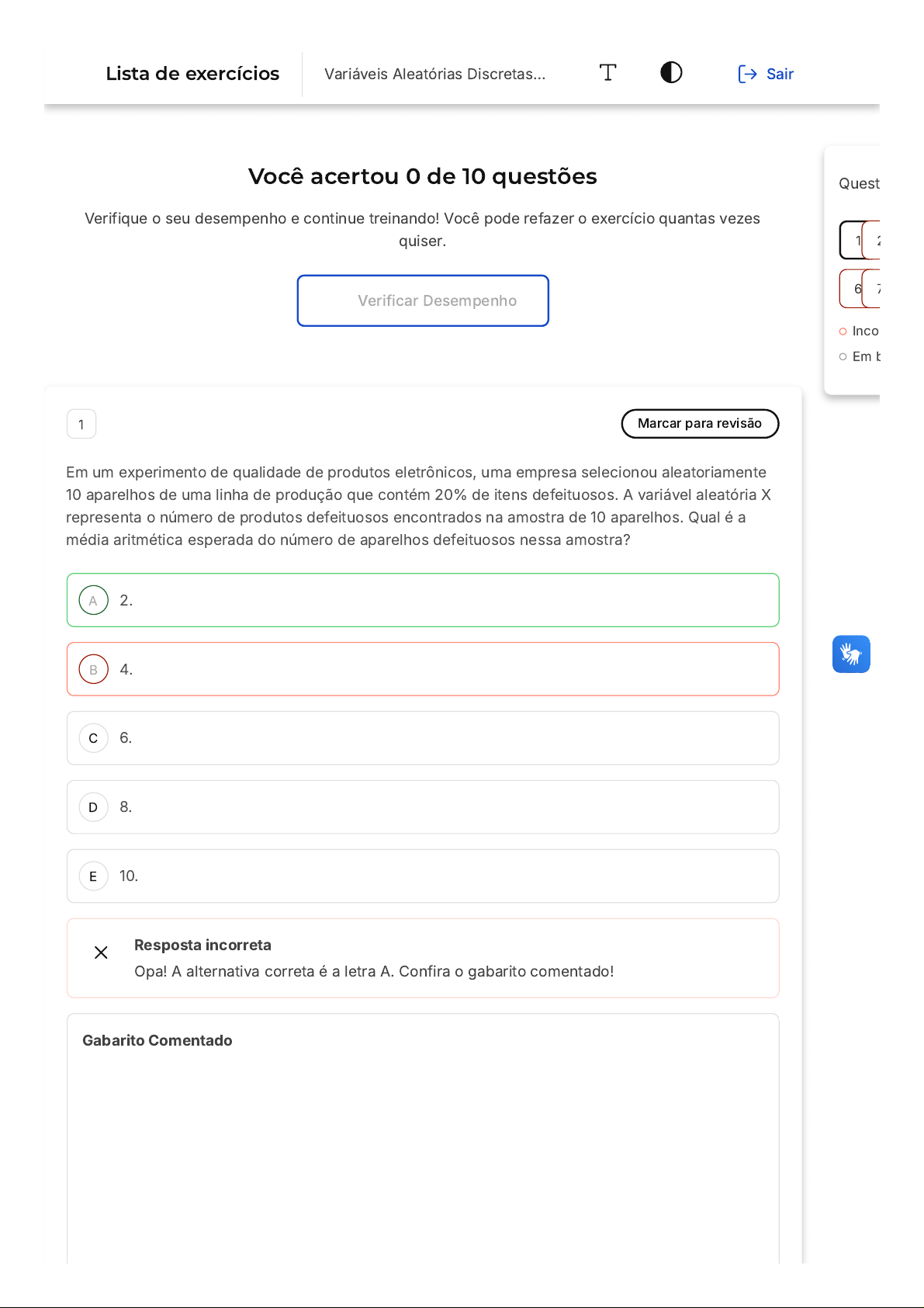 Você acertou 0 de 10 questões Verifique o seu desempenho e continue treinando! Você pode refazer o exercício quantas vezes quiser. Verificar Desempenho A B C D E 1 Marcar para revisão Em um experimento de qualidade de produtos eletrônicos, uma empresa selecionou aleatoriamente 10 aparelhos de uma linha de produção que contém 20% de itens defeituosos. A variável aleatória X representa o número de produtos defeituosos encontrados na amostra de 10 aparelhos. Qual é a média aritmética esperada do número de aparelhos defeituosos nessa amostra? 2. 4. 6. 8. 10. Resposta incorreta Opa! A alternativa correta é a letra A. Confira o gabarito comentado! Gabarito Comentado Quest Inco Em b 1 2 6 7 Lista de exercícios Variáveis Aleatórias Discretas… Sair A B C D E A distribuição hipergeométrica é aplicada quando há uma amostra retirada sem reposição de uma população finita com diferentes características. Neste caso, a população consiste em todos os aparelhos da linha de produção, com 20% de itens defeituosos. A média aritmética do número de aparelhos defeituosos na amostra pode ser calculada utilizando a fórmula da média da distribuição hipergeométrica, que é dada por (n x K) / N, onde n é o tamanho da amostra, K é o número de itens com a característica desejada na população e N é o tamanho da população. Substituindo os valores, temos (10 x 0,2) / 1 = 2. Portanto, a média esperada do número de aparelhos defeituosos na amostra é 2. 2 Marcar para revisão Uma empresa de entrega deseja estudar o comportamento dos pedidos em determinada região. Foi definida uma variável aleatória X, que representa o número de entregas realizadas por dia em um único bairro. Com base nessa definição, assinale a alternativa que melhor descreve a natureza da variável aleatória X: X é uma variável contínua, pois o número de entregas pode variar em qualquer intervalo real. X é uma estatística descritiva, pois representa um valor médio observado em um período. X é uma variável aleatória discreta, pois assume apenas valores inteiros e contáveis. X é um parâmetro populacional, pois representa um valor fixo conhecido. X é uma probabilidade condicional, pois depende de eventos anteriores. Resposta incorreta Opa! A alternativa correta é a letra C. Confira o gabarito comentado! Gabarito Comentado A variável X representa o número de entregas por dia, ou seja, valores inteiros e contáveis: 0, 1, 2, 3, ... Isso caracteriza uma variável aleatória discreta. Ela não é contínua, não é estatística, não é parâmetro fixo e não é probabilidade. 3 Marcar para revisão A B C D E A B C Um empresário, investindo em um determinado empreendimento, espera ter os seguintes lucros em função dos cenários "Bom", "Médio" e "Ruim": A expectância e a variância do respectivo lucro são, em R ) , respectivamente:e(R 2 5.500,00 e 3.160.000 5.300,00 e 3.510.000 5.300,00 e 3.160.000 5.000,00 e 3.510.000 5.000,00 e 3.160.000 Resposta incorreta Opa! A alternativa correta é a letra B. Confira o gabarito comentado! Gabarito Comentado A resposta correta é: 5.300,00 e 3.510.000 4 Marcar para revisão Uma empresa de delivery de pizzas recebe uma média de 4 pedidos por hora durante a noite. A empresa está interessada em analisar a ocorrência de um determinado evento: o número de pedidos recebidos em um intervalo contínuo de 2 horas. Qual das seguintes afirmações sobre a distribuição de Poisson é correta para esse contexto? A média e a variância do número de pedidos recebidos em 2 horas são iguais a 4. A distribuição de Poisson é adequada para modelar o número de pedidos recebidos em um intervalo contínuo de tempo. O parâmetro λ, que representa a taxa média de ocorrência de eventos, é igual a 8. D E A B C D E Os eventos de pedidos são dependentes entre si. A distribuição de Poisson é aplicada somente a eventos frequentes. Resposta incorreta Opa! A alternativa correta é a letra B. Confira o gabarito comentado! Gabarito Comentado A afirmação “A distribuição de Poisson é adequada para modelar o número de pedidos recebidos em um intervalo contínuo de tempo.” é correta, pois a distribuição de Poisson é adequada para modelar o número de eventos raros em um intervalo contínuo de tempo. No contexto dado, a média de pedidos por hora é 4, portanto, a média e a variância do número de pedidos recebidos em 2 horas seriam iguais a 4 x 2 = 8. O parâmetro λ, que representa a taxa média de ocorrência de eventos, é igual à média, ou seja, λ = 4. Os eventos de pedidos são considerados independentes entre si. A distribuição de Poisson não é aplicada apenas a eventos frequentes, mas também a eventos raros. 5 Marcar para revisão O retorno mensal de certo investimento de risco pode ser modelado pela variável aleatória W, com função de probabilidade dada a seguir. W -5% 0% 5% 10% 15% P(W=w) 0,4 0,15 0,25 0,15 0,05 O retorno esperado é: -0,5%. 0,5%. 1,5%. 5%. 7,5%. A B C D E Resposta incorreta Opa! A alternativa correta é a letra C. Confira o gabarito comentado! Gabarito Comentado O retorno esperado é calculado multiplicando-se cada valor possível da variável aleatória (neste caso, os possíveis retornos do investimento) pela sua respectiva probabilidade e somando-se todos esses produtos. Neste caso, o cálculo seria: Portanto, o retorno esperado é de 1,5%. E(W) = (−5% X 0, 4) + (0% X 0, 15) + (5% X 0, 25) + (10% X 0, 15) + (15% X 0, 05) E(W) = (−0, 02) + (0) + (0, 0125) + (0, 015) + (0, 0075) E(W) = −0, 02 + 0, 0125 + 0, 015 + 0, 0075 E(W) = 0, 015 6 Marcar para revisão Um restaurante popular em uma cidade recebe diariamente um grande número de clientes para suas refeições. A administração está interessada em estudar a ocorrência de um evento específico: o número de vezes que um cliente derruba um utensílio durante o horário do almoço. O processo de Poisson é utilizado para modelar esse evento, co