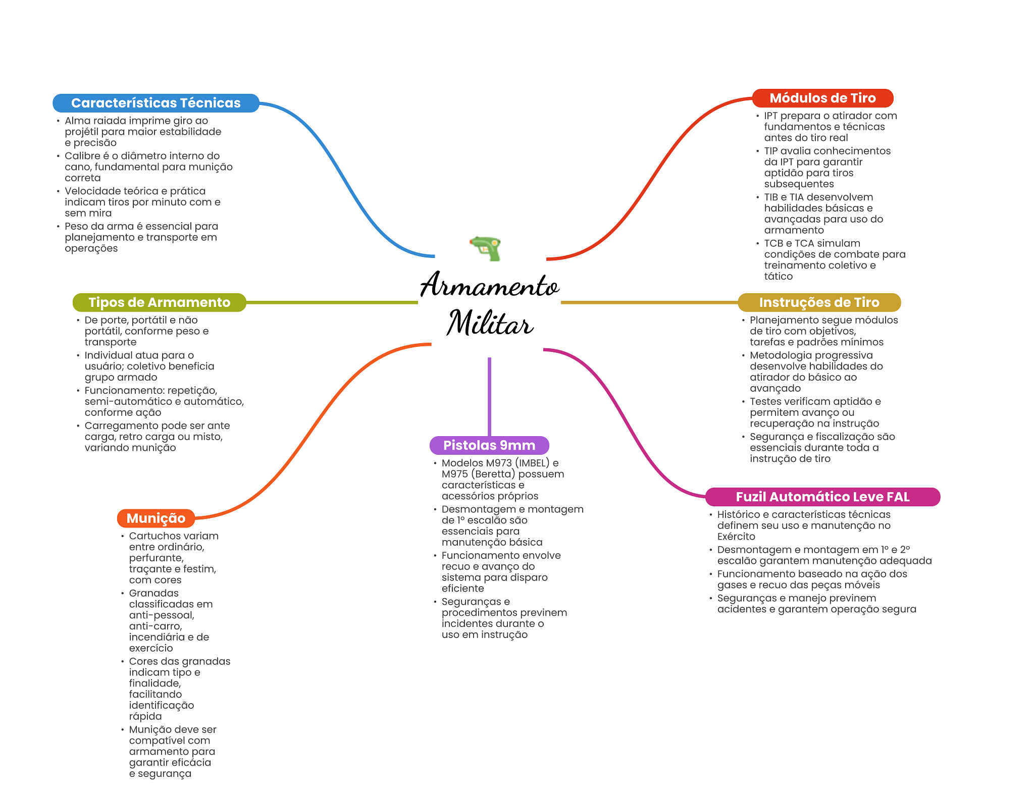Características Técnicas Módulos de Tiro Alma raiada imprime giro ao IPT prepara atirador com fundamentos e técnicas projétil para maior estabilidade antes do tiro real e precisão TIP avalia conhecimentos Calibre é diâmetro interno do cano, fundamental para munição da IPT para garantir correta aptidão para tiros subsequentes Velocidade teórica e prática TIB e TIA desenvolvem indicam tiros por minuto com e habilidades básicas e sem mira avançadas para uso do Peso da arma é essencial para armamento planejamento e transporte em TCB e TCA simulam operações condições de combate para treinamento coletivo e Armamento tático Tipos de Armamento Instruções de Tiro De porte, portátil e não Militar Planejamento segue módulos portátil, conforme peso e de tiro com objetivos, transporte tarefas e padrões mínimos Individual atua para Metodologia progressiva usuário; coletivo beneficia desenvolve habilidades do grupo armado atirador do básico ao Funcionamento: repetição, avançado semi-automático e automático, Testes verificam aptidão e conforme ação permitem avanço ou Carregamento pode ser ante recuperação na instrução carga, retro carga ou misto, Segurança e fiscalização são variando munição Pistolas 9mm essenciais durante toda a Modelos M973 (IMBEL) e instrução de tiro M975 (Beretta) possuem características e acessórios próprios Fuzil Automático Leve FAL Desmontagem e montagem Munição Histórico e características técnicas de 1° escalão são Cartuchos variam essenciais para definem seu uso e manutenção no Exército entre ordinário, manutenção básica perfurante, Funcionamento envolve Desmontagem e montagem em 1° e 2° recuo e avanço do escalão garantem manutenção adequada traçante e festim, sistema para disparo Funcionamento baseado na ação dos com cores Granadas eficiente gases e recuo das peças móveis classificadas em Seguranças e Seguranças e manejo previnem anti-pessoal, procedimentos previnem acidentes e garantem operação segura anti-carro, incidentes durante incendiária e de uso em instrução exercício Cores das granadas indicam tipo e finalidade, facilitando identificação rápida Munição deve ser compatível com armamento para garantir eficácia e segurança