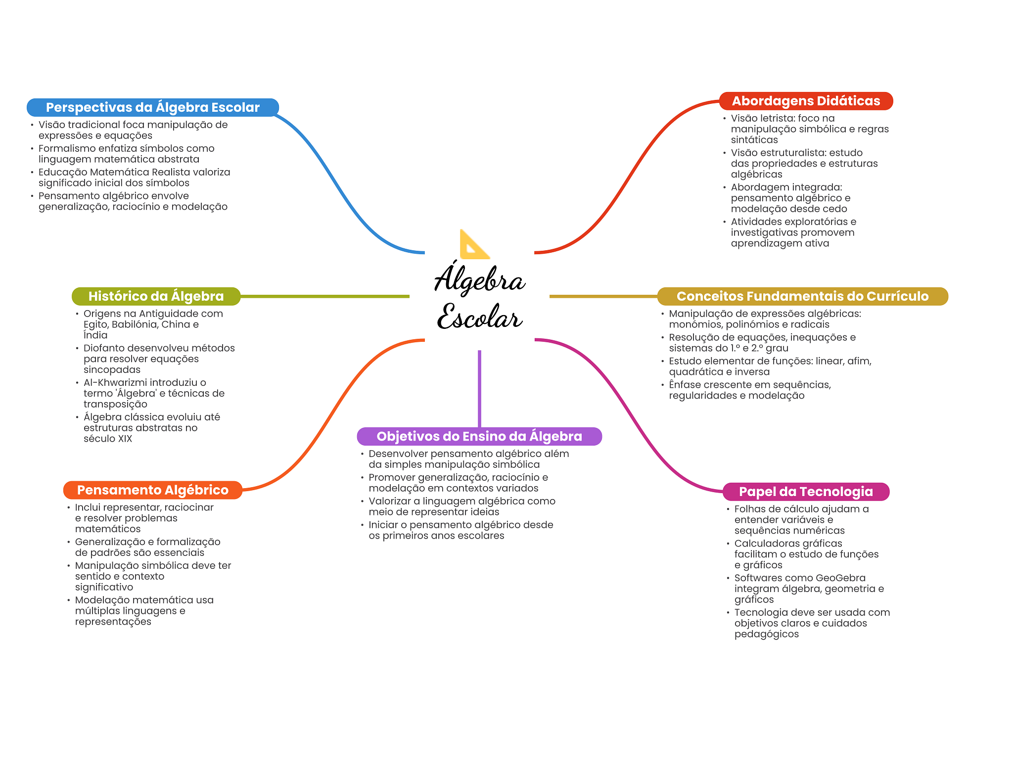 Perspectivas da Álgebra Escolar Abordagens Didáticas Visão letrista: foco na Visão tradicional foca manipulação de manipulação simbólica e regras expressões e equações sintáticas Formalismo enfatiza símbolos como Visão estruturalista: estudo linguagem matemática abstrata das propriedades e estruturas Educação Matemática Realista valoriza algébricas significado inicial dos símbolos Abordagem integrada: Pensamento algébrico envolve pensamento algébrico e generalização, raciocínio e modelação modelação desde cedo Atividades exploratórias e investigativas promovem aprendizagem ativa Álgebra Histórico da Álgebra Conceitos Fundamentais do Currículo Origens na Antiguidade com Egito, Babilónia, China e Escolar Manipulação de expressões algébricas: monómios, polinómios e radicais India Resolução de equações, inequações e Diofanto desenvolveu métodos sistemas do e 2.° grau para resolver equações Estudo elementar de funções: linear, afim, sincopadas quadrática e inversa Al-Khwarizmi introduziu Ênfase crescente em sequências, termo e técnicas de regularidades e modelação transposição Álgebra clássica evoluiu até estruturas abstratas no século XIX Objetivos do Ensino da Álgebra Desenvolver pensamento algébrico além da simples manipulação simbólica Promover generalização, raciocínio e Pensamento Algébrico modelação em contextos variados Papel da Tecnologia Valorizar a linguagem algébrica como Inclui representar, raciocinar meio de representar ideias Folhas de cálculo ajudam a e resolver problemas entender variáveis e matemáticos Iniciar pensamento algébrico desde OS primeiros anos escolares sequências numéricas Generalização e formalização Calculadoras gráficas de padrões são essenciais facilitam estudo de funções Manipulação simbólica deve ter e gráficos sentido e contexto Softwares como GeoGebra significativo integram álgebra, geometria e Modelação matemática usa gráficos múltiplas linguagens e Tecnologia deve ser usada com representações objetivos claros e cuidados pedagógicos