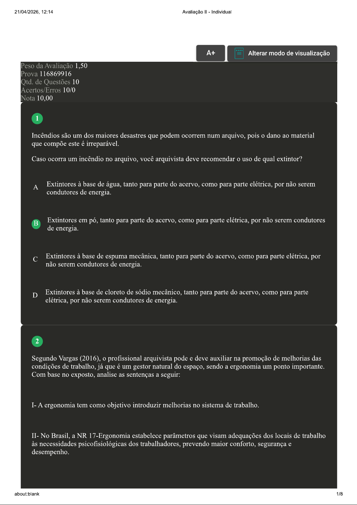 21/04/2026, 12:14 Avaliação Individual A+ Alterar modo de visualização Peso da Avaliação 1,50 Prova 116869916 Qtd. de Questões 10 Acertos/Erros 10/0 Nota 10,00 1 Incêndios são um dos maiores desastres que podem ocorrem num arquivo, pois o dano ao material que compõe este é irreparável. Caso ocorra um incêndio no arquivo, você arquivista deve recomendar o uso de qual extintor? A Extintores à base de água, tanto para parte do acervo, como para parte elétrica, por não serem condutores de energia. Extintores em pó, tanto para parte do acervo, como para parte elétrica, por não serem condutores de energia. Extintores à base de espuma mecânica, tanto para parte do acervo, como para parte elétrica, por não serem condutores de energia. D Extintores à base de cloreto de sódio mecânico, tanto para parte do acervo, como para parte elétrica, por não serem condutores de energia. 2 Segundo Vargas (2016), o profissional arquivista pode e deve auxiliar na promoção de melhorias das condições de trabalho, já que é um gestor natural do espaço, sendo a ergonomia um ponto importante. Com base no exposto, analise as sentenças a seguir: I- A ergonomia tem como objetivo introduzir melhorias no sistema de trabalho. II- No Brasil, a NR 17-Ergonomia estabelece parâmetros que visam adequações dos locais de trabalho às necessidades psicofisiológicas dos trabalhadores, prevendo maior conforto, segurança e desempenho. about:blank 1/821/04/2026, 12:14 Avaliação Individual III- A ergonomia ambiental é o ramo da ergonomia que se ocupa das questões ambientais artificiais do ambiente de trabalho, como ruído, vibrações, clima, iluminação. Assinale a alternativa CORRETA: FONTE: VARGAS. G. M. Proposta Arquivística para um programa de necessidades do arquivo histórico do estado do Rio Grande do Sul. 2016. 78f. Trabalho de Conclusão (Curso de em Arquivologia). Universidade Federal do Rio Grande do Sul, Porto Alegre. A Somente a sentença III está correta. Somente a sentença II está correta. Somente a sentença I está correta. D As sentenças I, II e III estão corretas. 3 Os arquivos intermediários possuem especificidades por ser um local de guarda transitória dos documentos. Sobre os arquivos intermediários, analise as sentenças a seguir: I- Deve ser previsto o crescimento do espaço dos arquivos para 200 anos. II- Um prédio de arquivo deve ser planejado para atender a todos os trabalhos arquivísticos, tais como recolhimento, organização, arranjo, guarda, preservação e atividades de pesquisa, educativas e culturais. III- As áreas de trabalho técnico e o depósito devem ser vedados ao público e com controles rigorosos de clima e segurança. Assinale a alternativa CORRETA: A As sentenças I e III estão corretas. B Somente a sentença III está correta. about:blank 2/821/04/2026, 12:14 Avaliação Individual As sentenças II e III estão corretas. D Somente a sentença II está correta. 4 Os arquivos intermediários armazenam diversos documentos, independendo do seu suporte. Sobre os arquivos intermediários e os documentos, classifique V para as sentenças verdadeiras e F para as falsas: Para o acondicionamento de mapas, plantas e cartazes, é indicado que o móvel possibilite o armazenamento na horizontal. Para o acondicionamento de mapas, plantas e cartazes, é indicado que o móvel possibilite o armazenamento na vertical. móvel ideal para se armazenar os mapas e as plantas é a mapoteca. É indicado armazenar vários mapas, plantas e cartazes em uma única gaveta da mapoteca para economia de espaço. Assinale a alternativa que apresenta a sequência CORRETA: A F-V-V-F. V-V-F-V. V-F-V-F. D F-F-F-V. 5 Os arquivos intermediários necessitam de algumas especificidades na sua construção, layouts, mobiliários e equipamentos de guarda e organização (CONARQ, 2000). Sobre os arquivos intermediários, classifique V para as sentenças verdadeiras e F para as falsas: about:blank 3/821/04/2026, 12:14 Avaliação Individual Para a construção de um arquivo, é necessário prever espaço para ao menos três áreas distintas, sendo: sala para uso do depósito/acervo, sala para atendimento ao público e sala para trabalhos A sala para trabalhos técnicos/administrativos é de uso do público também conhecida como sala de pesquisa. CONARQ (2000) recomenda que a divisão ideal do espaço deve ser aproximadamente 60% da área construída para os depósitos, 15% para os trabalhos técnicos e administrativos e 25% para a utilização do público. Assinale a alternativa que apresenta a sequência CORRETA: FONTE: CONARQ. Recomendações para a construção de arquivos. Rio de Janeiro: CONARQ, 2000. A B F - V - V. D 6 Quando falamos de conservação, destacamos os procedimentos e as medidas específicas e preventivas que visam preservar as informações contidas nos documentos e prolongar a vida útil de seus suportes. Sobre a conservação, classifique V para as sentenças verdadeiras e F para as falsas: É nas fases intermediárias e permanentes que a preocupação de conservação e preservação são mais latentes, devido ao tempo de guarda dos documentos. Podemos dividir os fatores de deterioração dos documentos em papel em: intrínsecos/internos e extrínsecos/externos. about:blank 4/821/04/2026, 12:14 Avaliação Individual Os fatores extrínsecos são os agentes físicos e biológicos que influenciam na umidade e temperatura, nas radiações luminosas, na poeira e poluição atmosférica, nos ataques biológicos, nas catástrofes e no manuseio e acondicionamento inadequados. Assinale a alternativa que apresenta a sequência CORRETA: A B D 7 A proteção de um acervo inicia-se com o planejamento de sua sede, o prédio do arquivo deve proteger seu acervo e demais estruturas. Boas estruturas prediais podem evitar diversos danos causados por eventos adversos da natureza ou de problemas conhecidos na região do edifício. Sobre a proteção do acervo e a construçã