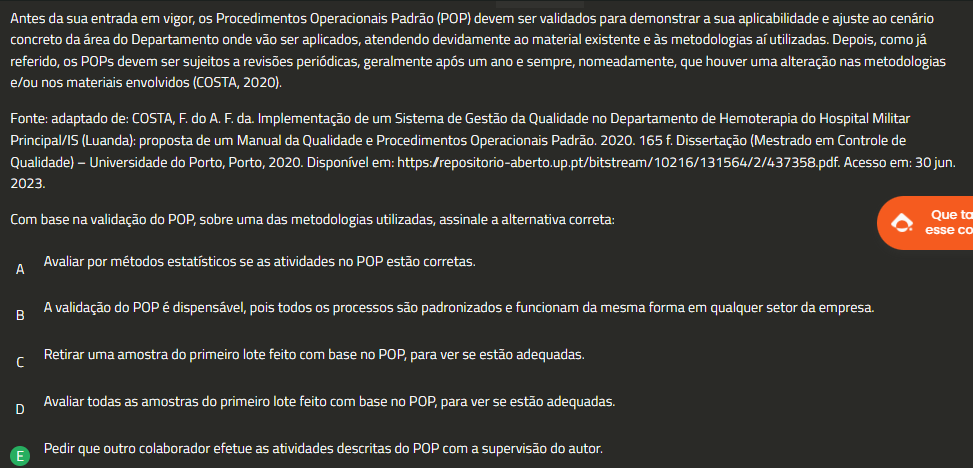 Antes da sua entrada em vigor, Procedimentos Operacionais Padrão (POP) devem ser validados para demonstrar a sua aplicabilidade e ajuste ao cenário concreto da área do Departamento onde vão ser aplicados, atendendo devidamente ao material existente e às metodologias aí utilizadas. Depois, como já referido, POPs devem ser sujeitos a revisões periódicas, geralmente após um ano e sempre, nomeadamente, que houver uma alteração nas metodologias e/ou nos materiais envolvidos (COSTA, 2020). Fonte: adaptado de: COSTA, F. do A.F. da. Implementação de um Sistema de Gestão da Qualidade no Departamento de Hemoterapia do Hospital Militar Principal/IS (Luanda): proposta de um Manual da Qualidade e Procedimentos Operacionais Padrão. 2020. 165 f. Dissertação (Mestrado em Controle de Qualidade) Universidade do Porto, Porto, 2020. Disponível em: https:/repositorio-aberto.up.pt/bitstream/10216/131564/2/437358.pdf. Acesso em: 30 jun. 2023. Com base na validação do POP, sobre uma das metodologias utilizadas, assinale a alternativa correta: Que ta esse A Avaliar por métodos estatísticos se as atividades no POP estão corretas. A validação do POP é dispensável, pois todos processos são padronizados e funcionam da mesma forma em qualquer setor da empresa. C Retirar uma amostra do primeiro lote feito com base no POP, para ver se estão adequadas. D Avaliar todas as amostras do primeiro lote feito com base no POP, para ver se estão adequadas. E Pedir que outro colaborador efetue as atividades descritas do POP com a supervisão do autor.