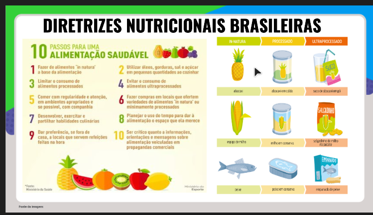 DIRETRIZES NUTRICIONAIS BRASILEIRAS IN-NATURA PROCESSADO ULTRAPROCESSADO 10 PASSOS PARA UMA ALIMENTAÇÃO SAUDÁVEL 1 Fazer de alimentos 2 Utilizar gorduras, sal a base da alimentação em pequenas quantidades cozinhar 3 Limitar 0 consumo de 4 Evitar 0 consumo de alimentos processados alimentos ultraprocessades 5 Comer com regularidade e atenção, em ambientes apropriados e 6 Fazer compras em que ofertem variedades de alimentos natura' ou se com companhia minimamente processados 7 Desenvolver, exercitar e 8 Planejar 0 tempo para dar à partilhar habilidades culinárias alimentação 0 espaço que merece 9 Dar preferência, se fora de casa, a locals que servem refeições 10 Ser critico quanto a informações, orientações e mensagens sobre feitas na hora alimentação veiculadas em propagandas comercials EMPANADO do da Saúde Esporte in