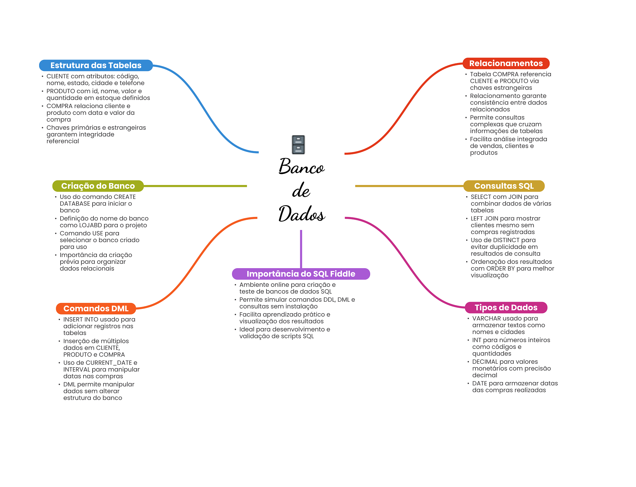 Estrutura das Tabelas Relacionamentos CLIENTE com atributos: código, Tabela COMPRA referencia nome, estado, cidade e telefone CLIENTE e PRODUTO via PRODUTO com id, nome, valor e chaves estrangeiras quantidade em estoque definidos Relacionamento garante consistência entre dados COMPRA relaciona cliente e relacionados produto com data e valor da Permite consultas compra Chaves primárias e estrangeiras complexas que cruzam garantem integridade informações de tabelas referencial Facilita análise integrada de vendas, clientes e produtos Banco Criação do Banco de Consultas SQL Uso do comando CREATE SELECT com JOIN para DATABASE para iniciar combinar dados de várias banco Definição do nome do banco Dados tabelas LEFT JOIN para mostrar como LOJABD para O projeto clientes mesmo sem Comando USE para compras registradas selecionar banco criado Uso de DISTINCT para para uso evitar duplicidade em Importância da criação resultados de consulta prévia para organizar Ordenação dos resultados dados relacionais com ORDER BY para melhor Importância do SQL Fiddle visualização Ambiente online para criação e teste de bancos de dados SQL Permite simular comandos DDL, DML e Comandos DML consultas sem instalação Tipos de Dados Facilita aprendizado prático e INSERT INTO usado para visualização dos resultados VARCHAR usado para adicionar registros nas armazenar textos como tabelas Ideal para desenvolvimento e nomes e cidades validação de scripts SQL Inserção de múltiplos INT para números inteiros dados em CLIENTE, como códigos e PRODUTO e COMPRA quantidades Uso de CURRENT_DATE e DECIMAL para valores INTERVAL para manipular monetários com precisão datas nas compras decimal DML permite manipular DATE para armazenar datas dados sem alterar das compras realizadas estrutura do banco