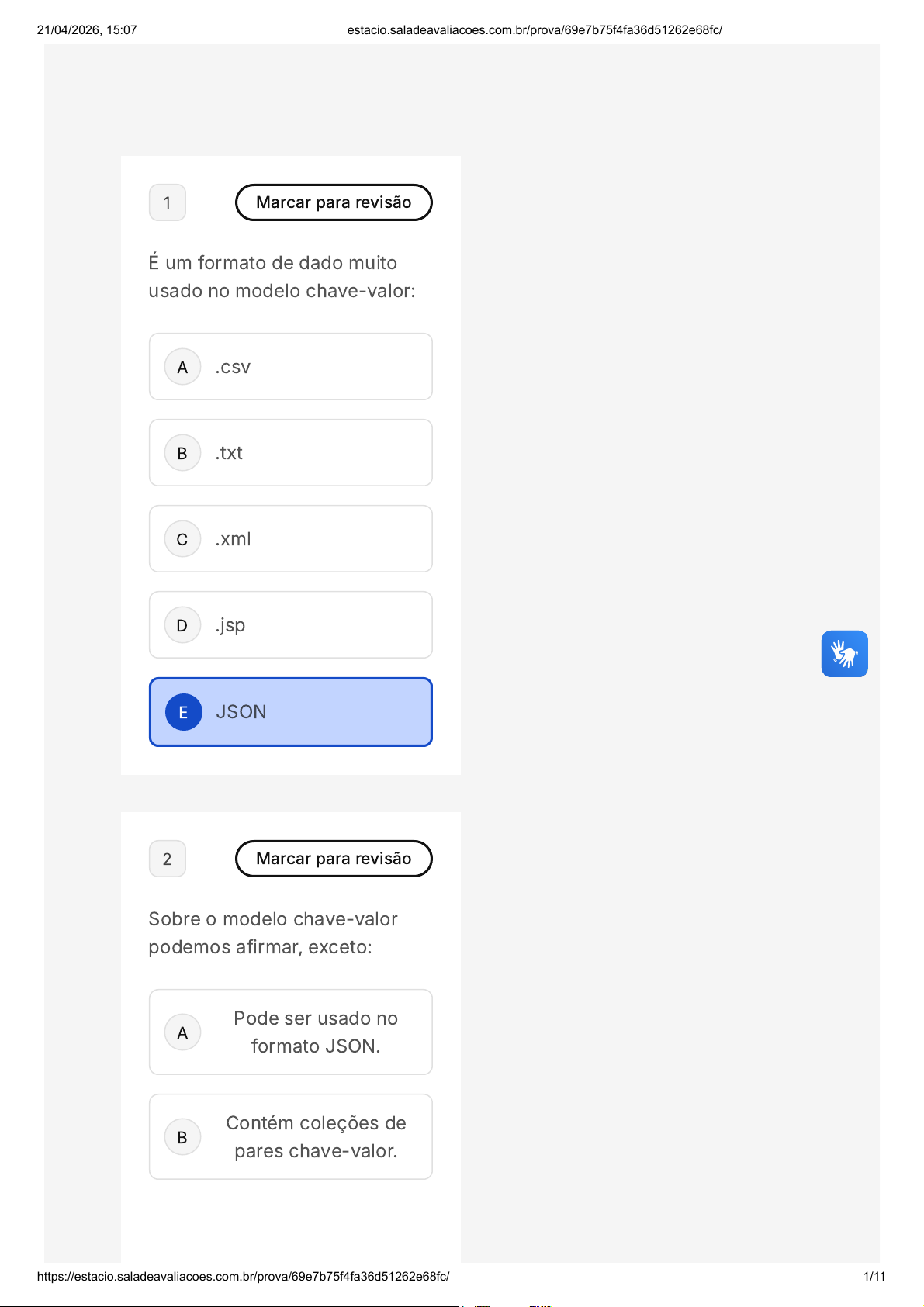 A B C D E A B 1 Marcar para revisão É um formato de dado muito usado no modelo chave-valor: .csv .txt .xml .jsp JSON 2 Marcar para revisão Sobre o modelo chave-valor podemos afirmar, exceto: Pode ser usado no formato JSON. Contém coleções de pares chave-valor. 21/04/2026, 15:07 estacio.saladeavaliacoes.com.br/prova/69e7b75f4fa36d51262e68fc/ https://estacio.saladeavaliacoes.com.br/prova/69e7b75f4fa36d51262e68fc/ 1/11 C D E A B C Não exige um esquema prévio para seu uso. Apresenta bom desempenho e é indicado para uso na web. É usado no Neo4J. 3 Marcar para revisão Os bancos de dados orientados a grafos são uma poderosa ferramenta para lidar com dados altamente relacionados e interconectados, oferecendo flexibilidade, desempenho e escalabilidade para uma variedade de aplicações e casos de uso. É um exemplo de um SGBD orientado a grafos: MONGODB. COUCHDB. NEO4J. 21/04/2026, 15:07 estacio.saladeavaliacoes.com.br/prova/69e7b75f4fa36d51262e68fc/ https://estacio.saladeavaliacoes.com.br/prova/69e7b75f4fa36d51262e68fc/ 2/11 D E A B C MARIADB. MYSQL. 4 Marcar para revisão Ao longo da evolução dos modelos de bancos de dados, diversos formatos surgiram para atender necessidades específicas. Considerando essa evolução, qual das características abaixo está associada ao modelo relacional? Estrutura hierárquica rígida com registros interligados por ponteiros. Uso de tabelas com atributos atômicos e suporte a propriedades ACID. Armazenamento baseado em documentos flexíveis e escalonamento horizontal. 21/04/2026, 15:07 estacio.saladeavaliacoes.com.br/prova/69e7b75f4fa36d51262e68fc/ https://estacio.saladeavaliacoes.com.br/prova/69e7b75f4fa36d51262e68fc/ 3/11 D E A B Organização de dados em grafos para modelar relacionamentos complexos Ausência de esquema pré-definido e uso exclusivo de linguagens não-SQL 5 Marcar para revisão Quanto aos tipos de dados, que abrangem dados estruturados, semiestruturados e não estruturados, qual das seguintes descrições melhor corresponde aos dados semiestruturados? Dados organizados em tabelas com formato fixo e campos atômicos Dados irregulares e incompletos, cuja estrutura pode variar, como arquivos XML. 21/04/2026, 15:07 estacio.saladeavaliacoes.com.br/prova/69e7b75f4fa36d51262e68fc/ https://estacio.saladeavaliacoes.com.br/prova/69e7b75f4fa36d51262e68fc/ 4/11 C D E Dados sem formato pré-definido, como imagens, vídeos e mensagens em redes sociais. Dados armazenados exclusivamente em bancos de dados relacionais tradicionais. Dados que exigem pré-definição rígida do esquema antes da inserção. 6 Marcar para revisão Considerando o controle transacional em bancos de dados relacionais e NoSQL, qual das afirmações abaixo apresenta corretamente a diferença principal entre esses dois modelos? 21/04/2026, 15:07 estacio.saladeavaliacoes.com.br/prova/69e7b75f4fa36d51262e68fc/ https://estacio.saladeavaliacoes.com.br/prova/69e7b75f4fa36d51262e68fc/ 5/11 A B C D E Ambos seguem rigorosamente as propriedades ACID para garantir consistência. Bancos relacionais adotam o Teorema CAP, enquanto NoSQL seguem propriedades ACID NoSQL priorizam a consistência e disponibilidade seguindo o Teorema CAP, enquanto relacionais seguem propriedades ACID Bancos relacionais não possuem controle de transações, enquanto NoSQL têm controle rigoroso NoSQL não oferecem nenhum mecanismo para controle de transações 7 Marcar para revisão Sobre a utilização do modelo NoSQL chave-valor, qual das alternativas representa um 21/04/2026, 15:07 estacio.saladeavaliacoes.com.br/prova/69e7b75f4fa36d51262e68fc/ https://estacio.saladeavaliacoes.com.br/prova/69e7b75f4fa36d51262e68fc/ 6/11 A B C D E desafio que o desenvolvedor deve considerar ao optar por essa tecnologia? A necessidade de codificar rotinas para controle de transações e tolerância a falhas, pois o modelo não oferece suporte ACID completo A impossibilidade de realizar consultas baseadas em partes específicas das chaves armazenadas. A obrigatoriedade de definir um esquema rígido para garantir a consistência dos dados. A limitação no uso de dados do tipo JSON para o armazenamento dos valores. A ausência de escalabilidade horizontal para grandes volumes de dados. 00 hora : 27 min : 23 seg Ocultar Questão 10 de 10 Respondidas (10) Em branco (0) Finalizar prova 1 2 3 4 5 6 7 8 9 10 SM1 Banco De Dados Nosql 21/04/2026, 15:07 estacio.saladeavaliacoes.com.br/prova/69e7b75f4fa36d51262e68fc/ https://estacio.saladeavaliacoes.com.br/prova/69e7b75f4fa36d51262e68fc/ 7/11 A B C 8 Marcar para revisão Em bancos de dados NoSQL chave-valor, quando se utiliza a extensão HSTORE do PostgreSQL, qual das afirmações abaixo descreve corretamente uma vantagem dessa tecnologia? Permite armazenar os dados em colunas rígidas, com tipos de dados fixos e predefinidos. Facilita o armazenamento de atributos flexíveis e sem esquema, permitindo pares chave-valor dentro de uma única coluna Impede a escalabilidade horizontal devido à limitação do formato relacional. 21/04/2026, 15:07 estacio.saladeavaliacoes.com.br/prova/69e7b75f4fa36d51262e68fc/ https://estacio.saladeavaliacoes.com.br/prova/69e7b75f4fa36d51262e68fc/ 8/11 D E A B C Exige a definição da estrutura exata dos dados antes da inserção. Não suporta a manipulação de dados em formato JSON. 9 Marcar para revisão A criação de índices no tipo JSONB é uma vantagem significativa no PostgreSQL para acelerar buscas por chaves e valores. Suponha que a tabela filmes armazene a chave publicado dentro do campo dados. Qual seria a forma correta de criar um índice que otimize buscas por esse campo? CREATE INDEX idx_pub ON filmes (dados->>'publicado'); CREATE INDEX idx_pub ON filmes (dados->'publicado'); CREATE INDEX idx_pub ON filmes USING BTREE ((dados->'publicado')); 21/04/2026, 15:07 estacio.saladeavaliacoes.com.br/prova/69e7b75f4fa36d51262e68fc/ https://estacio.saladeavaliacoes.com.br/prova/69e7b75f4fa36d51262e68fc/ 9/11 D E CREATE INDEX idx_publicados ON filme