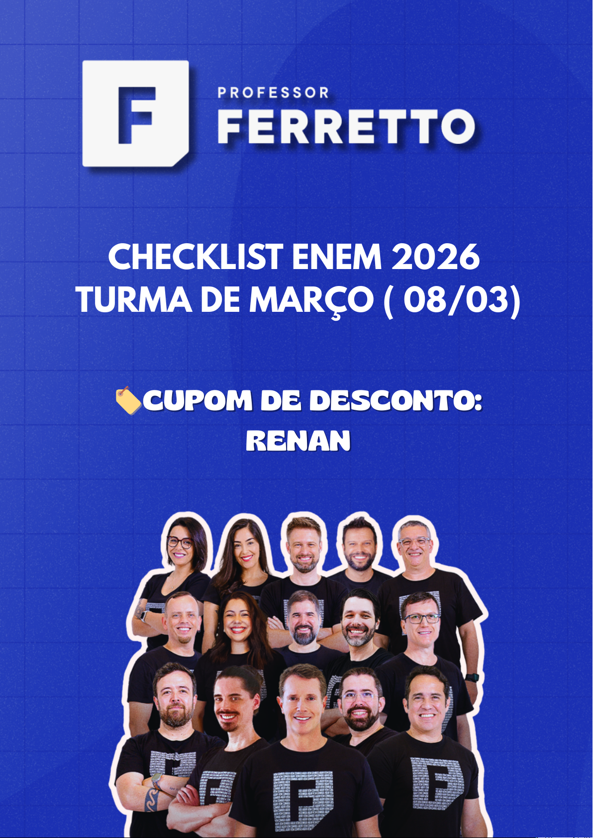 CHECKLIST ENEM 2026 TURMA DE MARÇO ( 08/03) 🏷CUPOM DE DESCONTO: RENAN 🏷CUPOM DE DESCONTO: RENAN @RENANMOF Matemática: Operações básicas, expressões e revisão de frações. Física: Grandezas físicas, unidades e notação científica. Química: Matéria, corpo e objeto, estados físicos e mudanças de estado. Biologia: Características dos seres vivos, célula e origem da vida. Geografia: Rotação, translação e orientação geográfica. História: Pré-história e primeiras sociedades humanas. Filosofia: Início da filosofia, ruptura com o mito e primeiros pensadores. Gramática: Acentuação e casos especiais. Interpretação: O que é texto e camadas de interpretação. Literatura: O que é literatura e seus gêneros. SEMANA 1 SEMANA 2 Matemática: Potenciação, radiciação e racionalização. Física: Teorema de Pitágoras e trigonometria no triângulo retângulo. Química: Tipos de misturas e técnicas de separação. Biologia: Biomoléculas – carboidratos, lipídios e proteínas. História: Antigo Egito e expansão marítima. Geografia: Escala, mapas temáticos e curvas de nível. Filosofia: Sofistas e relativismo. Gramática: Emprego do hífen. Interpretação: Três níveis de compreensão. Literatura: Prosa e poesia – diferenças. SEMANA 3 Matemática: Produtos notáveis e fatoração. Física: Cinemática – deslocamento, velocidade e aceleração. Química: Modelos atômicos – Dalton a Bohr. Biologia: DNA, RNA e síntese proteica. História: Grécia – cidade-estado, democracia e cultura. Geografia: Estrutura da atmosfera e elementos do clima. Filosofia: Sócrates e ética do diálogo. Gramática: Ortografia e escrita correta. Interpretação: Explícito × implícito. Literatura: Romance e conto. SEMANA 4 Matemática: Equações do 1º e 2º grau e sistemas. Física: Movimento uniforme e gráficos. Química: Números quânticos e distribuição eletrônica. Biologia: Código genético e engenharia genética. História: Império Persa, hebreus e fenícios. Geografia: Fenômenos climáticos e massas de ar. Filosofia: Aristóteles e teoria política. Gramática: Formação de palavras. Interpretação: Pressupostos e subentendidos. Literatura: Crônica e novela. @RENANMOF SEMANA 5 Matemática: Divisibilidade, primos, MMC e MDC. Física: Movimento uniformemente variado. Química: Tabela periódica, grupos e tendências. Biologia: Membrana plasmática e transporte. História: Roma Antiga – sociedade e república. Geografia: Tectonismo, terremotos e vulcões. Filosofia: Ética em Aristóteles. Gramática: Derivação e composição. Interpretação: Variações linguísticas. Literatura: Estrutura narrativa completa. Matemática: Razão e proporção e problemas contextualizados. Física: Vetores – soma e decomposição. Química: Ligações químicas – iônicas, covalentes e metálicas. Biologia: Citoplasma e respiração celular anaeróbica. História: Feudalismo e sociedade medieval. Geografia: Formação dos solos e agentes externos. Filosofia: Neoplatonismo e Plotino. Gramática: Substantivos – classificação e emprego. Interpretação: Dialetos e usos sociais da língua. Literatura: Estilo de época × estilo de autor. SEMANA 6 @RENANMOF SEMANA 7 Matemática: Regra de três simples e composta; escalas. Física: Movimentos verticais e velocidade vetorial. Química: Geometria molecular, polaridade e hibridação. Biologia: Fotossíntese, fatores limitantes e quimiossíntese. História: Império Bizantino e Sacro Império Romano-Germânico. Geografia: Relevo brasileiro e formas de modelagem. Filosofia: Santo Agostinho e filosofia cristã. Gramática: Plural de substantivos e adjetivos compostos. Interpretação: Linguagem verbal e não verbal. Literatura: Quinhentismo e sua linguagem. SEMANA 8 Matemática: Porcentagem, juros simples e compostos. Física: Movimento circular e lançamentos inclinados. Química: NOX, oxirredução e forças intermoleculares. Biologia: Cariótipo, clonagem e ciclo celular. História: Islã, expansão e cultura árabe. Geografia: Biomas do mundo e do Brasil. Filosofia: São Tomás de Aquino – razão e fé. Gramática: Pronomes pessoais. Interpretação: Linguagem corporal e expressão. Literatura: Barroco e seus principais temas. @RENANMOF SEMANA 9 Matemática: Conjuntos, subconjuntos e intervalos. Física: Leis de Newton e aplicações práticas. Química: Teorias modernas de ácidos e bases. Biologia: Mitose, meiose e gametogênese. História: Baixa Idade Média e renascimento comercial. Geografia: Poluição atmosférica, inversão térmica e ilhas de calor. Filosofia: Humanismo renascentista. Gramática: Pronomes possessivos e relativos. Interpretação: Tirinhas, cartuns e humor gráfico. Literatura: Sermões e Padre Vieira. SEMANA 10 Matemática: Progressões aritméticas e geométricas. Física: Força elástica, energia e molas. Química: Ácidos, bases e sais – propriedades e nomenclatura. Biologia: Embriologia – anexos e fecundação. História: Formação dos Estados Nacionais europeus. Geografia: Problemas ambientais globais. Filosofia: Montaigne e a valorização da experiência. Gramática: Pronomes demonstrativos. Interpretação: Estrutura da narrativa. Literatura: Arcadismo e obras principais. @RENANMOF SEMANA 11 Matemática: Ângulos, polígonos e triângulos notáveis. Física: Atrito e força centrípeta. Química: Reações de síntese, decomposição e simples troca. Biologia: Tecidos epiteliais e sistemas de proteção. História: Período Regencial no Brasil. Geografia: Estrutura populacional e pirâmides etárias. Filosofia: Descartes e o racionalismo. Gramática: Revisão dos pronomes. Interpretação: Narrativas literárias e pedagógicas. Literatura: Romantismo no Brasil. SEMANA 12 Matemática: Relações trigonométricas e Teorema de Tales. Física: Trabalho, potência e sistemas conservativos. Química: Cálculo estequiométrico aplicado. Biologia: Tecidos conjuntivos e sanguíneos