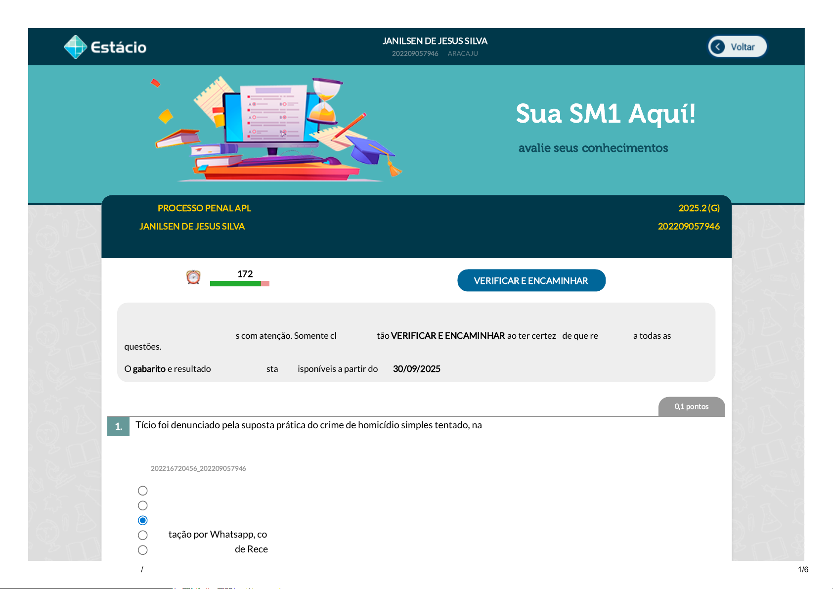 JANILSEN DE JESUS SILVA Sua SM1 Aquí! 202209057946 ARACAJU avalie seus conhecimentos 0,1 pontos Tício foi denunciado pela suposta prática do crime de homicídio simples tentado, na forma prevista no CP. Recebida a acusação, o juiz constatou, nos autos do inquérito policial, que o réu encontra-se residindo nos Estados Unidos, porém não sendo determinado o endereço exato. Neste caso, conforme disposto no CPP, qual seria a modalidade correta de citação? Ref.: 202216720456_202209057946 TMS0970 - PROCESSO PENAL APL 2025.2 (G) Aluno: JANILSEN DE JESUS SILVA 202209057946 Início: Faltam 172 min. VERIFICAR E ENCAMINHAR Prezado(a) Aluno(a), Responda a todas as questões com atenção. Somente clique no botão VERIFICAR E ENCAMINHAR ao ter certeza de que respondeu a todas as questões. O gabarito e resultado da avaliação estarão disponíveis a partir do dia 30/09/2025. 1. Citação Por carta rogatória. Citação por Carta Precatória. Citação Por Edital. Citação por Whatsapp, com comprovação da identidade por foto. Citação por Aviso de Recebimento. 29/09/2025, 14:04 EPS https://simulado.estacio.br/alunos/ 1/6 javascript:voltar(); javascript:voltar(); 0,1 pontos (FMP - Juiz de Direito - MT/2014 - adaptada) Sabemos que a liberdade probatória não é absoluta, sendo certo que a persecução penal não pode se dar a qualquer preço, os fins não justificam os meios. Nesse sentido, é correto dizer que o Código de Processo Penal: Ref.: 202216660606_202209057946 0,1 pontos O interrogatório do acusado está disciplinado nos arts. 185 a 196, do Código de Processo Penal. A respeito do tema no processo penal, aponte a proposição correta. Ref.: 202216660680_202209057946 0,1 pontos Tício está preso na Penitenciária de Presidente Venceslau, cumprindo pena por crimes de homicídio e sequestro, e responde a outro processo por crime de latrocínio na comarca de São Paulo, Capital. Há prova, nos autos, de que o agente integra uma facção criminosa e notícia de uma 2. Considera lícita a prova obtida por fonte(s) independente(s) da ilícita, porque entre uma e outra não há nexo de causalidade. Confere valor absoluto à delação premiada, se o juiz participar das negociações realizadas entre as partes para a formalização do acordo de colaboração. Prevê que o juiz que receber a denúncia ou queixa ficará vinculado ao processo e será o componente para a sentença, por causa do comando normativo do princípio da identidade física . Proíbe que o juiz requisite provas, porque essa iniciativa contraria o modelo acusatório e dá causa à nulidade absoluta do processo. Admite, ao livre critério do juiz, utilização do sistema de videoconferência para a coleta apenas do interrogatório. 3. A regra no processo penal é o interrogatório do réu preso por sistema de videoconferência ou outro recurso tecnológico de transmissão de sons e imagens em tempo real. O acusado que comparecer perante a autoridade judiciária, no curso do processo penal, não será qualificado e interrogado na presença de seu defensor, constituído ou nomeado. O juiz não garantirá ao réu o direito de entrevista prévia e reservada com o seu defensor no interrogatório por videoconferência. O interrogatório do réu preso será realizado, em sala própria, no estabelecimento em que estiver recolhido, desde que estejam garantidas a segurança do juiz, do membro do Ministério Público e dos auxiliares bem como a presença do defensor e a publicidade do ato. Não é possível a realização do interrogatório do réu preso por sistema de videoconferência ou outro recurso tecnológico de transmissão de sons e imagens em tempo real, ainda que para responder à gravíssima questão de ordem pública. 4. 29/09/2025, 14:04 EPS https://simulado.estacio.br/alunos/ 2/6 tentativa de resgate do detento durante o seu deslocamento até a cidade de São Paulo para participar de um determinado ato processual. Designada audiência de instrução, interrogatório, debates e julgamento, o Juiz que preside o processo que tramita contra Tício pelo delito de latrocínio, em decisão fundamentada, Ref.: 202216817655_202209057946 0,1 pontos Ano: 2014 Banca: FGV Órgão: OAB Prova: FGV - 2014 - OAB - Exame de Ordem Unificado - XIV - Primeira Fase O Delegado de Polícia, desconfiado de que Fabiano é o líder de uma quadrilha que realiza assaltos à mão armada na região, decide, com a sua equipe, realizar uma interceptação telefônica sem autorização judicial. Durante algumas semanas, escutaram diversas conversas, por meio das quais descobriram o local onde a res furtiva era armazenada para posterior revenda. Com essa informação, o Delegado de Polícia representou pela busca e apreensão a ser realizada na residência suspeita, sendo tal diligência autorizada pelo Juízo competente. Munidos do mandado de busca e apreensão, ingressam na residência encontrando diversos objetos fruto de roubo, como joias, celulares, documentos de identidade etc., tudo conforme indicou a interceptação telefônica. Assim, Fabiano foi conduzido à Delegacia, onde se registrou a ocorrência. Acerca do caso narrado, assinale a opção correta. Ref.: 202216903875_202209057946 poderá, em caráter excepcional, realizar o interrogatório de Tício por meio de videoconferência, intimando-se as partes com cinco dias de antecedência, assegurando ao preso a entrevista prévia e reservada com seu defensor, sendo dispensável o acompanhamento pelo preso de todos os atos da audiência única de instrução e julgamento, pela presença física de seu defensor no ato processual deverá necessariamente realizar o interrogatório de Tício por meio de videoconferência, intimando-se as partes com cinco dias de antecedência, assegurando ao preso a entrevista prévia e reservada com seu defensor, sendo dispensável o acompanhamento pelo preso de todos os atos da audiência única de instrução e julgamento, pela presença física de seu de