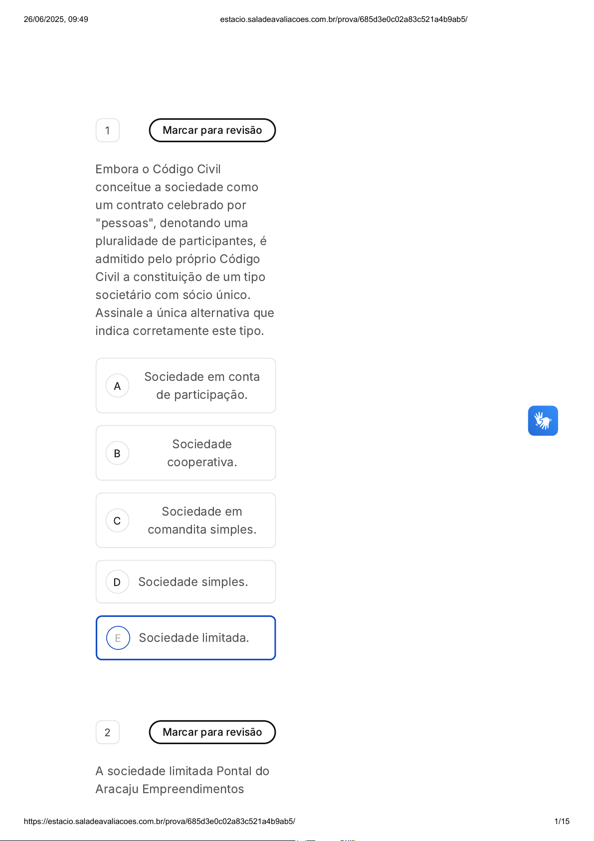 A B C D E 1 Marcar para revisão Embora o Código Civil conceitue a sociedade como um contrato celebrado por "pessoas", denotando uma pluralidade de participantes, é admitido pelo próprio Código Civil a constituição de um tipo societário com sócio único. Assinale a única alternativa que indica corretamente este tipo. Sociedade em conta de participação. Sociedade cooperativa. Sociedade em comandita simples. Sociedade simples. Sociedade limitada. 2 Marcar para revisão A sociedade limitada Pontal do Aracaju Empreendimentos 26/06/2025, 09:49 estacio.saladeavaliacoes.com.br/prova/685d3e0c02a83c521a4b9ab5/ https://estacio.saladeavaliacoes.com.br/prova/685d3e0c02a83c521a4b9ab5/ 1/15 A B C Imobiliários Ltda., enquadrada como empresa de pequeno porte, pretende constituir outra sociedade limitada sem agregar ao quadro social nenhum outro sócio. Sobre esta situação, assinale a única alternativa correta. Não é possível a constituição de sociedade limitada unipessoal por pessoa jurídica, pois deve o sócio único ser pessoa natural. É possível a constituição de sociedade limitada unipessoal indistintamente por pessoa natural ou por pessoa jurídica. Não é possível a constituição de sociedade limitada unipessoal por pessoa jurídica, pois apenas na sociedade anônima é possível tal intento. 26/06/2025, 09:49 estacio.saladeavaliacoes.com.br/prova/685d3e0c02a83c521a4b9ab5/ https://estacio.saladeavaliacoes.com.br/prova/685d3e0c02a83c521a4b9ab5/ 2/15 D E É possível a constituição de sociedade limitada unipessoal por pessoa jurídica eis que ela está enquadrada como empresa de pequeno porte. Não é possível a constituição de sociedade limitada unipessoal tanto por pessoa natural quanto jurídica, eis que deve haver pluralidade de sócios. 3 Marcar para revisão Três sociedades limitadas pretendem constituir uma sociedade anônima fechada cujo objeto será a indústria de cimentos. Na denominação social da futura companhia será homenageado o fundador de uma das sociedades, Antenor Navarro. De acordo com as regras que disciplinam a formação da denominação da sociedade anônima, assinale a única denominação correta e que poderá ser utilizada. 26/06/2025, 09:49 estacio.saladeavaliacoes.com.br/prova/685d3e0c02a83c521a4b9ab5/ https://estacio.saladeavaliacoes.com.br/prova/685d3e0c02a83c521a4b9ab5/ 3/15 A B C D E Antenor Navarro. Antenor Navarro & Companhia. Cimentos Antenor Navarro & Companhia. Companhia de Cimentos Antenor Navarro Cimentos Antenor Navarro. 4 Marcar para revisão Aladim e Mustafá são diretores de uma sociedade em comandita por ações falida. Além dos bens sociais, os bens particulares dos diretores foram arrecadados no processo falimentar. Antes do encerramento da liquidação dos bens da sociedade, o administrador judicial pleiteou ao juiz que autorizasse a venda dos bens particulares dos administradores para acelerar o encerramento da falência. Considerando a regra do Código Civil sobre a responsabilidade dos administradores da sociedade em comandita por ações, 26/06/2025, 09:49 estacio.saladeavaliacoes.com.br/prova/685d3e0c02a83c521a4b9ab5/ https://estacio.saladeavaliacoes.com.br/prova/685d3e0c02a83c521a4b9ab5/ 4/15 A B C assinale a única alternativa correta. Está correto o administrador judicial em razão da responsabilidade ilimitada dos administradores da sociedade em comandita por ações, que é sem benefício de ordem. Não está correto o administrador judicial, pois ainda que a responsabilidade dos administradores seja ilimitada e solidária, ela é subsidiária e não foram esgotados os bens sociais. Está correto o administrador judicial em razão da responsabilidade ilimitada e solidária dos administradores das sociedades por ações. 26/06/2025, 09:49 estacio.saladeavaliacoes.com.br/prova/685d3e0c02a83c521a4b9ab5/ https://estacio.saladeavaliacoes.com.br/prova/685d3e0c02a83c521a4b9ab5/ 5/15 D E Não está correto o administrador judicial, pois a responsabilidade dos administradores pelas obrigações sociais não é solidária e há benefício de ordem. Está correto o administrador judicial em razão da responsabilidade ilimitada e solidária de todos os sócios da sociedade em comandita por ações. 5 Marcar para revisão A sociedade empresária Empreendimentos Imobiliários Valparaíba S/A, em recuperação judicial, foi descapitalizada injustificadamente por um de seus administradores, Macedo Costa, que também realizou operações prejudiciais ao seu funcionamento regular. Tomando ciência do fato e das provas dos atos atribuídos ao administrador, o juiz da recuperação, a pedido de sócios minoritários, determinou sua destituição. Com base nas disposições da Lei nº 11.101/2005, o juiz deverá: 00 hora : 34 min : 34 seg Ocultar Questão 9 de 10 Respondidas (10) Em branco (0) Finalizar prova 1 2 3 4 5 6 7 8 9 10 Prova AVS Sociedades 26/06/2025, 09:49 estacio.saladeavaliacoes.com.br/prova/685d3e0c02a83c521a4b9ab5/ https://estacio.saladeavaliacoes.com.br/prova/685d3e0c02a83c521a4b9ab5/ 6/15 A B C D E determinar ao Comitê de Credores que indique o nome do novo administrador da sociedade empresária. determinar a convocação de assembleia-geral de credores para deliberar sobre o nome do gestor judicial. determinar a assunção imediata da administração da sociedade empresária pelo maior credor quirografário. determinar ao acionista controlador que indique o nome do substituto do administrador destituído para que o juiz o nomeie. determinar a substituição do administrador na forma prevista nos atos constitutivos da sociedade empresária. 26/06/2025, 09:49 estacio.saladeavaliacoes.com.br/prova/685d3e0c02a83c521a4b9ab5/ https://estacio.saladeavaliacoes.com.br/prova/685d3e0c02a83c521a4b9ab5/ 7/15 A B C 6 Marcar para revisão Ao se pronunciar a pedido do juiz sobre a modalidade de realização do ativo, o administrador judicial Sr. Albuquerque Lins manifestou- se pelo leilão presencial para alienação do