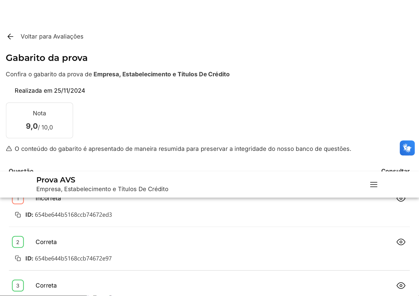 Voltar para Avaliações Gabarito da prova Confira o gabarito da prova de Empresa, Estabelecimento e Títulos De Crédito Realizada em 25/11/2024 Nota 9,0/ 10,0 O conteúdo do gabarito é apresentado de maneira resumida para preservar a integridade do nosso banco de questões. Questão Consultar Incorreta ID: 654be644b5168ccb74672ed3 Correta ID: 654be644b5168ccb74672e97 Correta 1 2 3 Prova AVS Empresa, Estabelecimento e Títulos De Crédito https://estacio.saladeavaliacoes.com.br/avaliacoes/ ID: 654be6bbb5168ccb7467b20b Correta ID: 654be644b5168ccb74672efd Correta ID: 65c419bd92547b2a79438b0c Correta ID: 654be6a4b5168ccb746798a7 Correta ID: 654be644b5168ccb74672ea9 Correta ID: 65c4bf0792547b2a79489830 Correta ID: 665e05ca57bde06794df74a6 4 5 6 7 8 9 Correta ID: 654be6bbb5168ccb7467b319 10 Encontrou algum problema? Você pode copiar o ID da questão e abrir um requerimento. Na tela inicial do Campus Virtual �SIA�, acesse "Atendimento > Requerimento > Novo > Currículo/Aula/horário > Analisar ambiente de avaliação/exercícios"