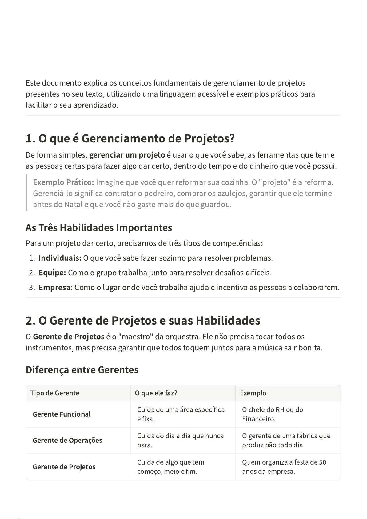Guia Simplificado: Gerenciamento de Projetos Este documento explica os conceitos fundamentais de gerenciamento de projetos presentes no seu texto, utilizando uma linguagem acessível e exemplos práticos para facilitar o seu aprendizado. 1. O que é Gerenciamento de Projetos? De forma simples, gerenciar um projeto é usar o que você sabe, as ferramentas que tem e as pessoas certas para fazer algo dar certo, dentro do tempo e do dinheiro que você possui. As Três Habilidades Importantes Para um projeto dar certo, precisamos de três tipos de competências: 1. Individuais: O que você sabe fazer sozinho para resolver problemas. 2. Equipe: Como o grupo trabalha junto para resolver desafios difíceis. 3. Empresa: Como o lugar onde você trabalha ajuda e incentiva as pessoas a colaborarem. 2. O Gerente de Projetos e suas Habilidades O Gerente de Projetos é o "maestro" da orquestra. Ele não precisa tocar todos os instrumentos, mas precisa garantir que todos toquem juntos para a música sair bonita. Diferença entre Gerentes Exemplo Prático: Imagine que você quer reformar sua cozinha. O "projeto" é a reforma. Gerenciá-lo significa contratar o pedreiro, comprar os azulejos, garantir que ele termine antes do Natal e que você não gaste mais do que guardou. Tipo de Gerente O que ele faz? Exemplo Gerente Funcional Cuida de uma área específica e fixa. O chefe do RH ou do Financeiro. Gerente de Operações Cuida do dia a dia que nunca para. O gerente de uma fábrica que produz pão todo dia. Gerente de Projetos Cuida de algo que tem começo, meio e fim. Quem organiza a festa de 50 anos da empresa. Habilidades que o Gerente precisa ter: • Liderança: Inspirar as pessoas a seguirem o plano. • Comunicação: Saber falar e ouvir (é a habilidade mais importante!). • Negociação: Conseguir bons acordos com fornecedores e equipe. • Solução de Problemas: Não travar quando algo dá errado. 3. Projetos, Programas e Portfólios Esses nomes parecem complicados, mas a diferença é apenas o "tamanho" e o "objetivo": • Projeto: Uma tarefa única. (Ex: Construir uma casa). • Programa: Um grupo de projetos que têm relação entre si. (Ex: Construir um condomínio inteiro com várias casas, ruas e área de lazer). • Portfólio: Todos os projetos e programas de uma empresa para atingir uma meta maior. (Ex: Todos os prédios e casas que uma construtora está fazendo para ser a maior do Brasil). 4. Maturidade em Gestão: O quanto a empresa é "boa" nisso? A maturidade mede se a empresa faz projetos "de qualquer jeito" ou se ela tem um método organizado que funciona sempre. Existem modelos para medir isso, como o PMMM, que tem 5 níveis: 1. Nível 1 (Linguagem Comum): As pessoas começam a entender os termos básicos. 2. Nível 2 (Processos Comuns): A empresa começa a repetir o que deu certo. 3. Nível 3 (Metodologia Singular): A empresa cria o seu próprio jeito oficial de trabalhar. 4. Nível 4 (Benchmarking): A empresa olha para fora para ver como os melhores fazem. 5. Nível 5 (Melhoria Contínua): A empresa está sempre tentando ser ainda melhor. 5. Estruturas das Empresas Onde o Gerente de Projetos manda mais? Depende de como a empresa é organizada: A) Estrutura Funcional (Tradicional) É a empresa dividida por "caixinhas" (RH, TI, Marketing). • Vantagem: Você trabalha com pessoas que fazem a mesma coisa que você. • Desvantagem: O Gerente de Projeto quase não tem poder. Ele tem que "pedir favor" para os chefes dos departamentos. B) Estrutura Projetizada Aqui o foco total é no projeto. • Vantagem: O Gerente de Projeto manda em tudo. A equipe é dedicada só para aquilo. • Desvantagem: Quando o projeto acaba, as pessoas podem ficar "sem casa" na empresa. C) Estrutura Matricial É um meio-termo. Você tem o seu chefe do departamento e o seu chefe do projeto ao mesmo tempo. 6. Cultura Organizacional A cultura é o "jeito de ser" da empresa. Ela influencia muito se um projeto vai ser fácil ou difícil de tocar. Dica de Ouro: Stakeholders No texto, aparece a palavra Stakeholders. Pense neles como as "Partes Interessadas". São todas as pessoas que podem ser afetadas pelo projeto (para o bem ou para o mal). Tipo de Cultura Como funciona? Clã (Grupal) Parece uma família. Todos participam e se ajudam. Inovativa Liberdade total. Gostam de mudanças e ideias novas. Mercado Foco total em resultados e em ganhar da concorrência. Hierárquica Muitas regras, burocracia e processos rígidos. • Exemplo: Numa reforma de apartamento, os stakeholders são: você, o pedreiro, o vizinho (que vai ouvir o barulho) e o síndico. Você precisa gerenciar a expectativa de todos eles! Elaborado por: Manus AI Referências: Baseado no texto acadêmico fornecido (PMI, Gido & Clements, Schein, etc).