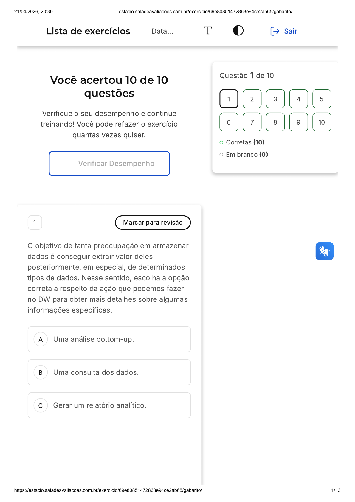 Você acertou 10 de 10 questões Verifique o seu desempenho e continue treinando! Você pode refazer o exercício quantas vezes quiser. Verificar Desempenho A B C 1 Marcar para revisão O objetivo de tanta preocupação em armazenar dados é conseguir extrair valor deles posteriormente, em especial, de determinados tipos de dados. Nesse sentido, escolha a opção correta a respeito da ação que podemos fazer no DW para obter mais detalhes sobre algumas informações específicas. Uma análise bottom-up. Uma consulta dos dados. Gerar um relatório analítico. Questão 1 de 10 Corretas (10) Em branco (0) 1 2 3 4 5 6 7 8 9 10 Lista de exercícios Data… Sair 21/04/2026, 20:30 estacio.saladeavaliacoes.com.br/exercicio/69e80851472863e94ce2ab65/gabarito/ https://estacio.saladeavaliacoes.com.br/exercicio/69e80851472863e94ce2ab65/gabarito/ 1/13 D E Uma análise top-down. Uma análise estratégica. Resposta correta Parabéns, você selecionou a alternativa correta. Confira o gabarito comentado! Gabarito Comentado Para obter mais detalhes sobre informações específicas em um DW, a ação mais adequada é realizar uma análise top- down. Esta análise permite uma visão geral do sistema, partindo do nível mais abstrato para o mais detalhado. As demais opções não são tão eficazes para este propósito. A "análise bottom-up", por exemplo, tem como objetivo agregar informações, e não detalhá-las. As opções "consulta dos dados" e "gerar relatório analítico" são ações mais gerais e não necessariamente proporcionam um detalhamento das informações. Por fim, a "análise estratégica" é mais voltada para a tomada de decisões e planejamento, não se focando no detalhamento de informações específicas. 2 Marcar para revisão A construção de um Data Warehouse envolve muitas decisões importantes, tanto do ponto de vista do negócio, como nos aspectos técnicos. 21/04/2026, 20:30 estacio.saladeavaliacoes.com.br/exercicio/69e80851472863e94ce2ab65/gabarito/ https://estacio.saladeavaliacoes.com.br/exercicio/69e80851472863e94ce2ab65/gabarito/ 2/13 A B C D E A respeito sobre o que é Data Warehouse (DW), marque a alternativa correta. São sistemas de apoio à decisão baseados em bancos de dados. São sistemas de dados relacionais e transacionais. São sistemas de otimização voltados para dar suporte à tomada de decisão. É um repositório de dados voltado para apoiar a tomada de decisão. São sistemas de banco de dados sem integridade referencial. Resposta correta Parabéns, você selecionou a alternativa correta. Confira o gabarito comentado! Gabarito Comentado Um Data Warehouse é simplesmente um repositório de dados que é utilizado como fonte de dados por aplicações analíticas. As demais opções estão erradas, pois um DW não é um banco de dados transacional e nem um apoio de sistema de apoio à decisão. 3 Marcar para revisão 21/04/2026, 20:30 estacio.saladeavaliacoes.com.br/exercicio/69e80851472863e94ce2ab65/gabarito/ https://estacio.saladeavaliacoes.com.br/exercicio/69e80851472863e94ce2ab65/gabarito/ 3/13 A B C D E O esquema estrela é a forma mais comum de estruturar os dados de um Data Warehouse (DW). A respeito do tipo de relacionamento do esquema estrela, marque a alternativa correta. Um-para-Um. Um-para-Muitos. Muitos-para-Muitos. Desconectado. Agregado. Resposta correta Parabéns, você selecionou a alternativa correta. Confira o gabarito comentado! Gabarito Comentado No esquema estrela, o tipo de relacionamento é caracterizado como "Um- para-Muitos". Isso ocorre porque a tabela Fato, que é o centro do esquema estrela, se relaciona com várias tabelas de dimensões através de chaves estrangeiras. As alternativas "Um-para-Um" e "Muitos- para-Muitos" não são aplicáveis ao esquema estrela. Ademais, "Desconectado" e "Agregado" não representam tipos de relacionamentos válidos neste contexto. 21/04/2026, 20:30 estacio.saladeavaliacoes.com.br/exercicio/69e80851472863e94ce2ab65/gabarito/ https://estacio.saladeavaliacoes.com.br/exercicio/69e80851472863e94ce2ab65/gabarito/ 4/13 A B C D E 4 Marcar para revisão A arquitetura de uma solução é um aspecto essencial que influencia o uso, manutenção, segurança e crescimento. Com base nessas informações e do seu conhecimento, escolha a opção correta a respeito da característica da arquitetura do DW que atua na garantia de crescimento estável de uma solução. Integração dos dados. Redução de espaço. Escalabilidade. Redução de operações de escrita. Governança dos dados. Resposta correta Parabéns, você selecionou a alternativa correta. Confira o gabarito comentado! Gabarito Comentado A característica da arquitetura do DW que atua no crescimento estável de uma solução é a escalabilidade. Já as demais características não são associadas diretamente com a arquitetura do DW. 21/04/2026, 20:30 estacio.saladeavaliacoes.com.br/exercicio/69e80851472863e94ce2ab65/gabarito/ https://estacio.saladeavaliacoes.com.br/exercicio/69e80851472863e94ce2ab65/gabarito/ 5/13 A B C D E 5 Marcar para revisão Um Data Mart (DM) é um repositório de dados históricos focado em determinado tema. Em relação aos diferentes tipos de Data Mart, qual é o tipo que se caracteriza por ser um subconjunto dos dados do Data Warehouse (DW)? Independente. Híbrido. Homogêneo. Analítico. Dependente. Resposta correta Parabéns, você selecionou a alternativa correta. Confira o gabarito comentado! Gabarito Comentado O tipo de Data Mart que se caracteriza por ser um subconjunto dos dados do Data Warehouse é o tipo dependente. Este tipo de Data Mart é alimentado diretamente a partir dos dados do Data Warehouse. Por outro lado, os tipos independente e híbrido possuem outras finalidades e não são subconjuntos diretos do Data Warehouse. As opções "Analítico" e "Homogêneo" não 21/04/2026, 20:30 estacio.saladeavaliacoes.com.br/exercicio/69e80851472863e94ce2ab65/gabarito/ https://estacio.saladeavaliacoes.com.br/exercicio/69e