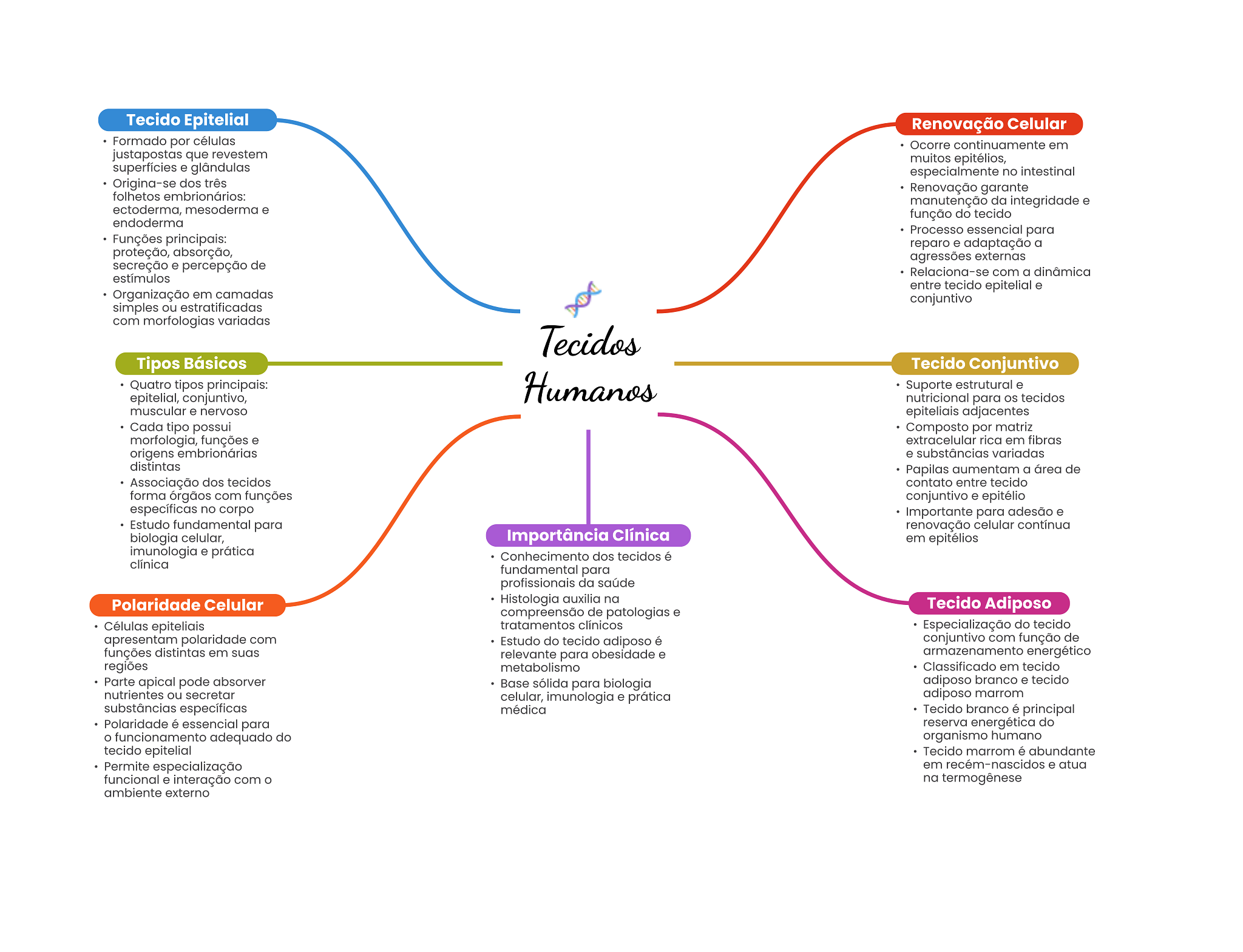 Tecido Epitelial Renovação Celular Formado por células Ocorre continuamente em justapostas que revestem muitos epitélios, superfícies e glândulas especialmente no intestinal Origina-se dos três Renovação garante folhetos embrionários: manutenção da integridade e ectoderma, mesoderma e função do tecido endoderma Processo essencial para Funções principais: reparo e adaptação a proteção, absorção, agressões externas secreção e percepção de Relaciona-se com a dinâmica estímulos entre tecido epitelial e Organização em camadas conjuntivo simples ou estratificadas com morfologias variadas Tecidos Tipos Básicos Tecido Conjuntivo Quatro tipos principais: Humanos Suporte estrutural e epitelial, conjuntivo, nutricional para tecidos muscular e nervoso epiteliais adjacentes Cada tipo possui Composto por matriz morfologia, funções e extracelular rica em fibras origens embrionárias e substâncias variadas distintas Papilas aumentam a área de Associação dos tecidos contato entre tecido forma órgãos com funções conjuntivo e epitélio específicas no corpo Importante para adesão e Estudo fundamental para renovação celular contínua biologia celular, Importância Clínica em epitélios imunologia e prática Conhecimento dos tecidos é clínica fundamental para profissionais da saúde Polaridade Celular Histologia auxilia na Tecido Adiposo compreensão de patologias e Células epiteliais tratamentos clínicos Especialização do tecido apresentam polaridade com Estudo do tecido adiposo é conjuntivo com função de funções distintas em suas relevante para obesidade e energético regiões metabolismo Classificado em tecido Parte apical pode absorver Base sólida para biologia adiposo branco e tecido nutrientes ou secretar celular, imunologia e prática adiposo marrom substâncias específicas médica Tecido branco é principal Polaridade é essencial para reserva energética do funcionamento adequado do organismo humano tecido epitelial Tecido marrom é abundante Permite especialização em e atua funcional e interação com na termogênese ambiente externo