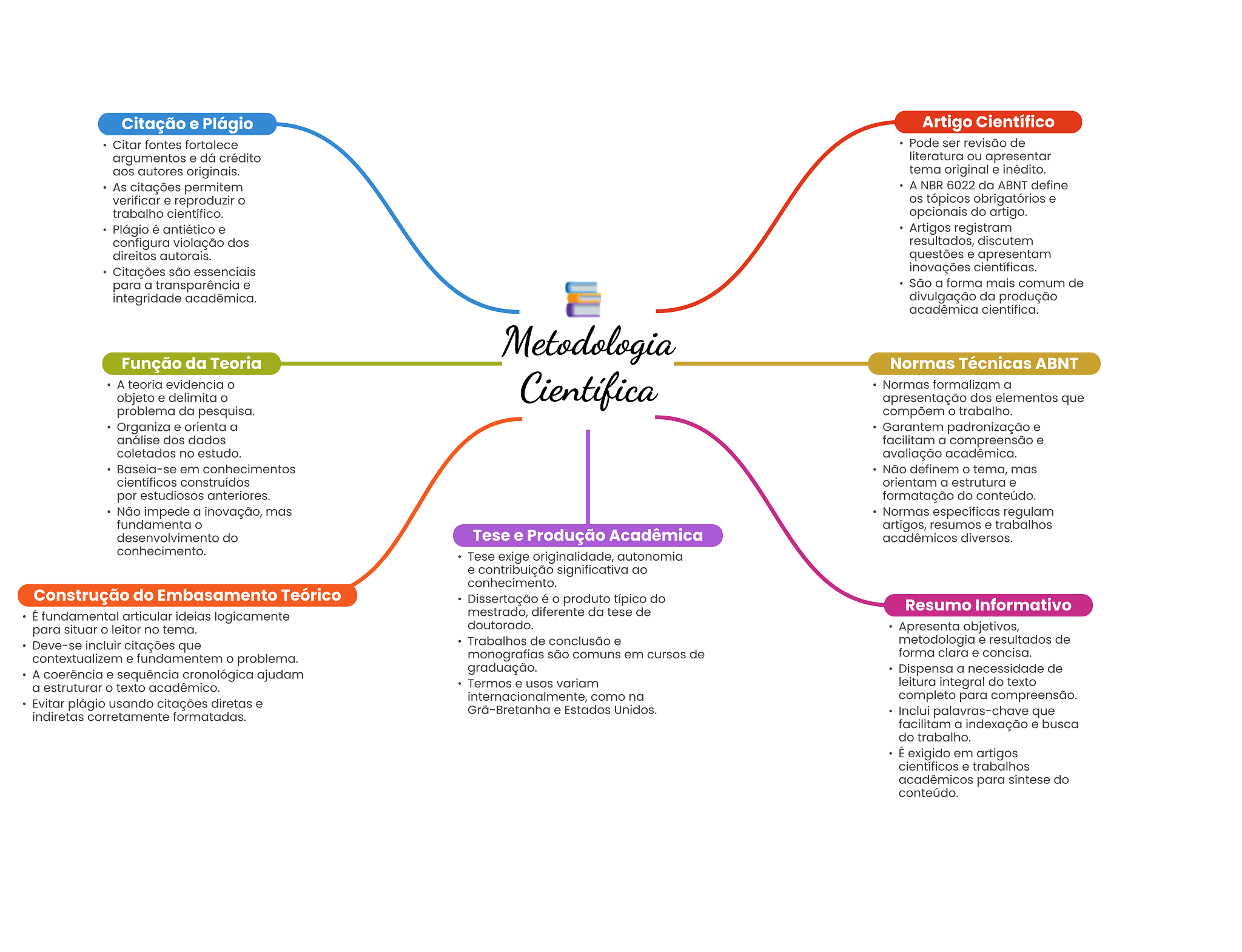 Citação e Plágio Artigo Científico Citar fontes fortalece Pode ser revisão de argumentos e dá crédito literatura ou apresentar aos autores originais. tema original e inédito. As citações permitem A NBR 6022 da ABNT define verificar e reproduzir tópicos obrigatórios e trabalho científico. opcionais do artigo. Plágio é antiético e Artigos registram configura violação dos resultados, discutem direitos autorais. questões e apresentam Citações são essenciais inovações científicas. para a transparência e São a forma mais comum de integridade acadêmica. divulgação da produção acadêmica científica. Metodologia Função da Teoria Normas Técnicas ABNT A teoria evidencia objeto e delimita Científica Normas formalizam a apresentação dos elementos que problema da pesquisa. compõem trabalho. Organiza e orienta a Garantem padronização e análise dos dados facilitam a compreensão e coletados no estudo. avaliação acadêmica. Baseia-se em conhecimentos Não definem tema, mas científicos construídos orientam a estrutura e por estudiosos anteriores. formatação do conteúdo. Não impede a inovação, mas Normas específicas regulam fundamenta artigos, resumos e trabalhos desenvolvimento do Tese e Produção Acadêmica acadêmicos diversos. conhecimento. Tese exige originalidade, autonomia e contribuição significativa ao conhecimento. Construção do Embasamento Teórico Dissertação é produto típico do Resumo Informativo É fundamental articular ideias logicamente mestrado, diferente da tese de para situar leitor no tema. doutorado. Apresenta objetivos, Deve-se incluir citações que Trabalhos de conclusão e metodologia e resultados de monografias são comuns em cursos de forma clara e concisa. contextualizem e fundamentem problema. A coerência e sequência cronológica ajudam graduação. Dispensa a necessidade de a estruturar texto acadêmico. Termos e usos variam leitura integral do texto internacionalmente como na completo para compreensão. Evitar plágio usando citações diretas e Grã-Bretanha e Estados Unidos. indiretas corretamente formatadas. Inclui palavras-chave que facilitam a indexação e busca do trabalho. É exigido em artigos científicos e trabalhos acadêmicos para síntese do conteúdo.
