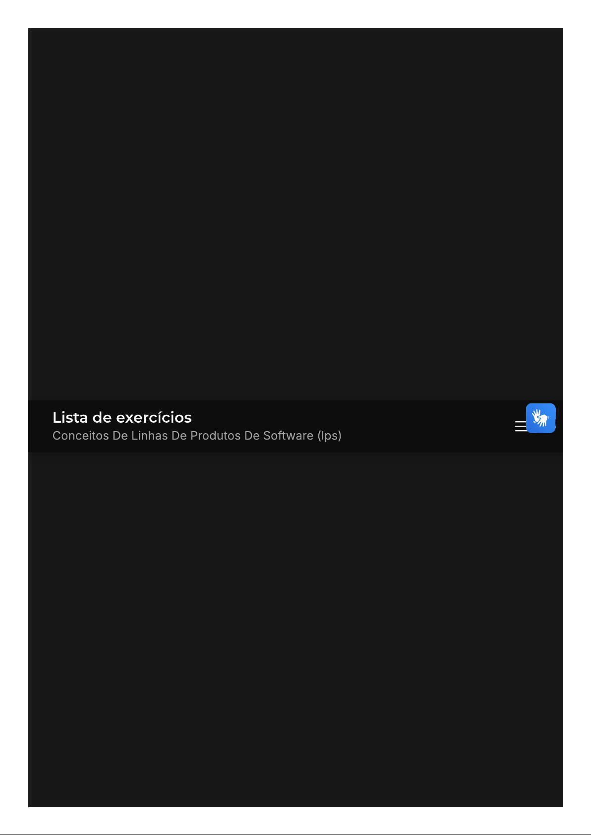 Lista de exercícios Conceitos De Linhas De Produtos De Software (Ips)Você acertou 9 de 10 questões Verifique seu desempenho e continue treinando! Você pode refazer exercício quantas vezes quiser. Verificar Desempenho 1 Marcar para revisão A avaliação da qualidade em Linhas de Produtos de Software (LPS) apresenta uma complexidade maior do que no desenvolvimento de software tradicional. Este fato ocorre devido a: Produtos diferentes, em uma mesma LPS, podem requerer níveis de A qualidade distintos B Devido ao tamanho do produto final c sistema ter sido desenvolvido há muito tempo D A linguagem de programação utilizada ser obsoleta E Aos diferentes clientes que irão utilizá-lo Resposta correta Parabéns, você selecionou a alternativa correta. Confira gabarito comentado! Gabarito Comentado31, caua desenvolvido é único e personalizado para atender às necessidades específicas de cada cliente ou stakeholder. Isso significa que, embora os produtos possam ser similares, cada um deles é diferente do outro devido às customizações realizadas. Como resultado, cada produto pode requerer níveis de qualidade distintos, que aumenta a complexidade da avaliação da qualidade em LPS em comparação com desenvolvimento de software tradicional. Portanto, a alternativa correta é "A", que afirma que "Produtos diferentes, em uma mesma LPS, podem requerer níveis de qualidade distintos". 2 Marcar para revisão Um dos conceitos fortes da Engenharia de Software é reuso de software. Sabendo disso, assinale a alternativa que apresenta corretamente conceito de engenharia de software baseada em reuso. Fonte: INSTITUTO AOCP, Órgão: EBSERH, Prova: INSTITUTO AOCP 2016 EBSERH Analista de Tecnologia da Informação Processos (CH-UFPA) É um atalho para economizar tempo e custo por meio da reutilização A de linhas de componentes. É um repositório de componentes de software que podem ser utilizados a qualquer instante do desenvolvimento. É um processo de preparação de equipes para que software seja c todo desenvolvido com componentes comuns. É o compartilhamento de conhecimento nas equipes de D desenvolvimento para evitar esforço duplicado. É uma estratégia em que processo de desenvolvimento é voltado E para a reutilização do software existente. Resposta correta Parabéns, você selecionou a alternativa correta. Confira gabaritocomentado! Gabarito Comentado O conceito de reuso na Engenharia de Software é uma estratégia em que processo de desenvolvimento é voltado para a reutilização do software existente, conforme apresentado na alternativa Este processo envolve várias etapas, como a análise da unidade de reuso, teste, catalogação e Para uso efetivo da unidade de reuso, é necessário uma análise e documentação da sua utilização. O reuso é fortemente indicado nas empresas de desenvolvimento, já que os artefatos gerados para produzir software são altamente reutilizáveis. Portanto, a alternativa E é a correta, pois ela apresenta de maneira precisa conceito de reuso na Engenharia de Software. 3 Marcar para revisão A engenharia de software baseada em reuso é uma estratégia da engenharia em que processo de desenvolvimento é orientado para reuso de softwares existentes e isso traz benefícios as empresas de de software. Nesse contexto, analise as afirmativas sobre seus benefícios a seguir: I. Reuso aumenta a Produtividade II. Com reuso temos um aumento no tempo de e validação III. Com reuso temos maior Qualidade dos Produtos IV. reuso apoia na manutenibilidade do produto Assinale a opção correta: A Apenas as opções e estão corretas Apenas as opções e III estão corretas c Apenas as opções e IV estão corretas D Apenas as opções III e IV estão corretasE Apenas as opções le III estão corretas Resposta correta Parabéns, você selecionou a alternativa correta. Confira gabarito comentado! Gabarito Comentado O reuso, de acordo com as premissas da Engenharia de Software, é um processo na qual envolve várias etapas, como a análise da unidade de reuso, teste, catalogação e Para uso efetivo da unidade de reuso é necessário uma análise e documentação da sua utilização. O reuso é fortemente indicado nas empresas de desenvolvimento, já que os artefatos gerados para produzir software são altamente reutilizáveis, dessa forma, as empresas estão mais preparadas para atender as demandas de mercado. 4 Marcar para r revisão O Framework para Linha de Produto de Software (LPS) é uma estrutura para engenharia do produto na qual fazem parte todos os conceitos centrais da engenharia de LPS, com uso de plataformas que oferecem a capacidade de fornecer personalização em massa. Dois processos compõem esse Framework e um deles é a Engenharia de Aplicação, que dentro dele outros subprocessos são realizados. A seguir, são apresentados os subprocessos. Relacione a primeira coluna com a segunda, indicando a descrição correta de cada subprocesso: Coluna 1 Coluna 2 A Engenharia de engloba todas as atividades para Requisitos de desenvolvimento da especificação de requisitos de Aplicação aplicação Projeto de cria a aplicação em questão Aplicação envolve as atividades para produzir a arquitetura c Realização da do aplicativo Aplicação compreende as atividades necessárias paraD Aplicação validar e verificar um aplicativo em relação a sua especificação Assinale a alternativa correta, que indica a sequência de letras da Coluna 2, de acordo com a correta descrição dos subprocessos da coluna 1: A C-A-E-D B c D E X Resposta incorreta Opa! A alternativa correta é a letra B. Confira gabarito comentado! Gabarito Comentado processo de Engenharia de Aplicação é um componente crucial do Framework para Linha de Produto de Software (LPS). Este processo é responsável por derivar aplicações concretas a partir da plataforma estabelecida na engenharia de domínio. Ele explora a variabilidade da linha de produtos e assegura sua correta instanc