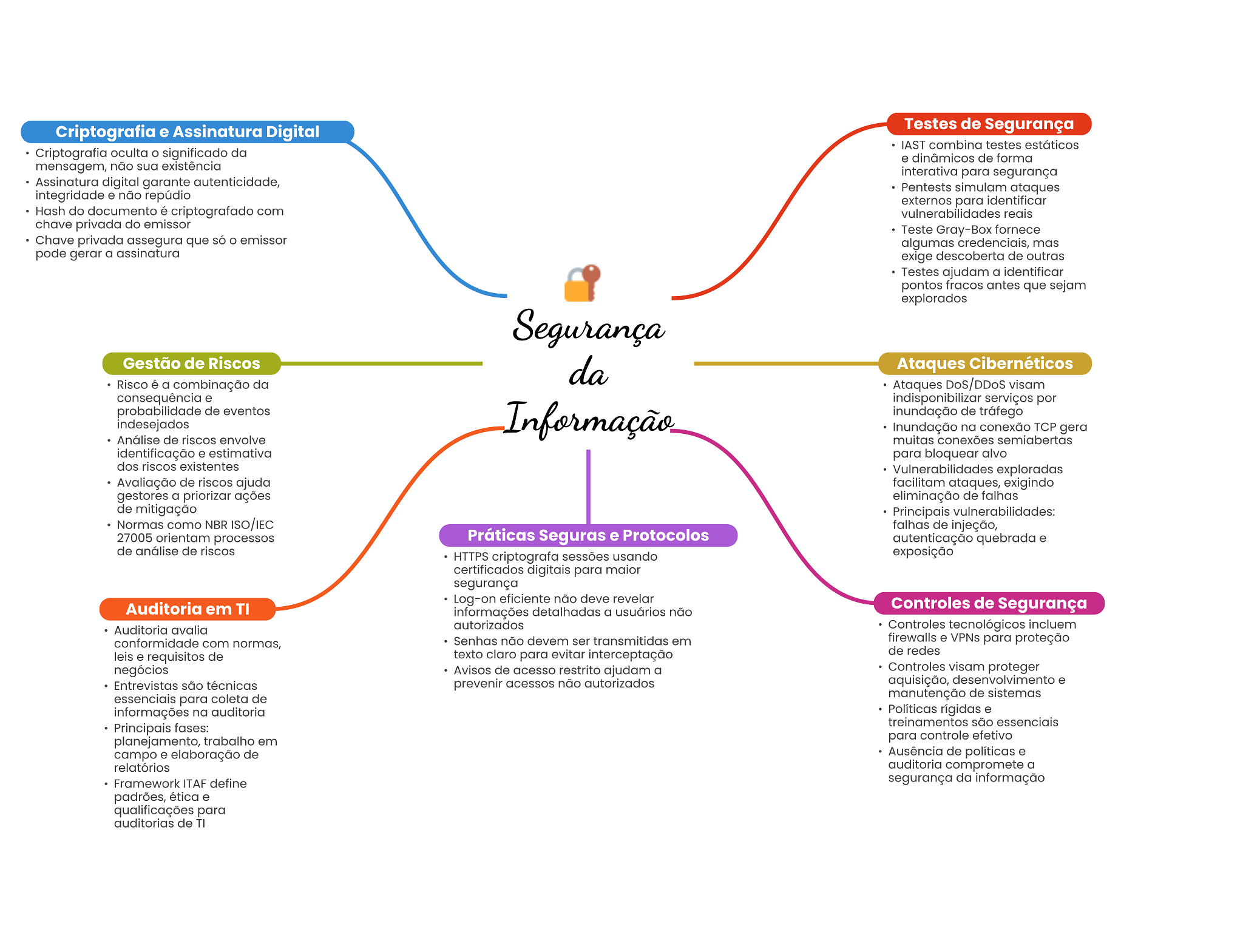 Criptografia e Assinatura Digital Testes de Segurança IAST combina testes estáticos Criptografia oculta significado da e dinâmicos de forma mensagem, não sua existência interativa para segurança Assinatura digital garante autenticidade, Pentests simulam ataques integridade e não repúdio externos para identificar Hash do documento é criptografado com vulnerabilidades reais chave privada do emissor Teste Gray-Box fornece Chave privada assegura que só emissor algumas credenciais, mas pode gerar a assinatura exige descoberta de outras Testes ajudam a identificar pontos fracos antes que sejam explorados Segurança Gestão de Riscos da Ataques Cibernéticos Risco é a combinação da Ataques visam consequência e indisponibilizar serviços por probabilidade de eventos indesejados Informação inundação de tráfego Inundação na conexão TCP gera Análise de riscos envolve muitas conexões semiabertas identificação e estimativa para bloquear alvo dos riscos existentes Vulnerabilidades exploradas Avaliação de riscos ajuda facilitam ataques, exigindo gestores a priorizar ações eliminação de falhas de mitigação Principais vulnerabilidades: Normas como NBR ISO/IEC falhas de injeção, 27005 orientam processos Práticas Seguras e Protocolos autenticação quebrada e de análise de riscos HTTPS criptografa sessões usando exposição certificados digitais para maior segurança Log-on eficiente não deve revelar Auditoria em TI Controles de Segurança informações detalhadas a usuários não Auditoria avalia autorizados Controles tecnológicos incluem conformidade com normas, Senhas não devem ser transmitidas em firewalls e VPNs para proteção leis e requisitos de texto claro para evitar interceptação de redes negócios Avisos de acesso restrito ajudam a Controles visam proteger Entrevistas são técnicas prevenir acessos não autorizados aquisição, desenvolvimento e essenciais para coleta de manutenção de sistemas informações na auditoria Políticas rígidas e treinamentos são essenciais Principais fases: planejamento, trabalho em para controle efetivo campo e elaboração de Ausência de políticas e relatórios auditoria compromete a Framework ITAF define segurança da informação padrões, ética e qualificações para auditorias de TI