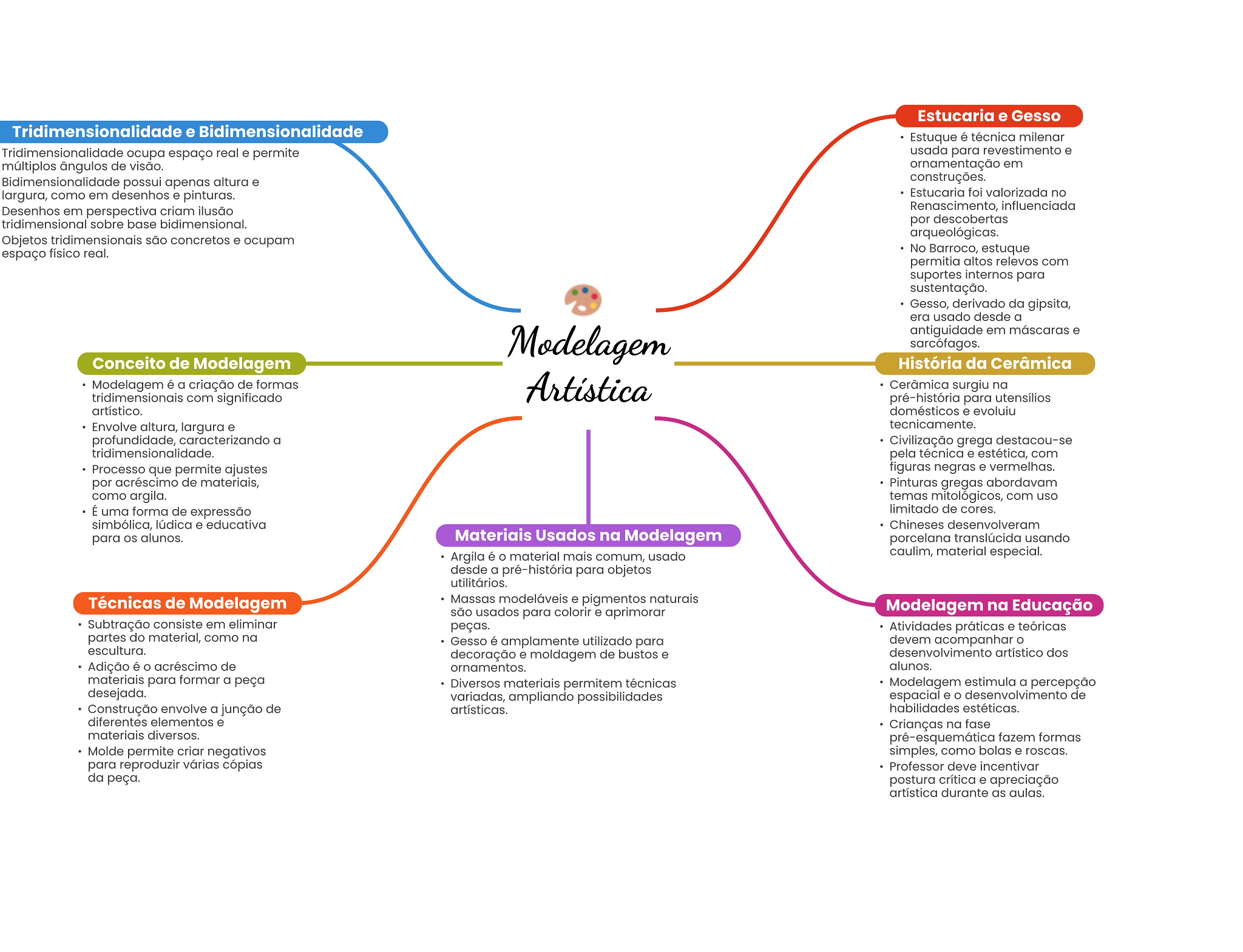 Estucaria e Gesso Tridimensionalidade e Bidimensionalidade Estuque é técnica milenar Tridimensionalidade ocupa espaço real e permite usada para revestimento e múltiplos ângulos de visão. ornamentação em possui apenas altura e construções. largura, como em desenhos e pinturas. Estucaria foi valorizada no Desenhos em perspectiva criam ilusão Renascimento, influenciada tridimensional sobre base bidimensional. por descobertas arqueológicas. Objetos tridimensionais são concretos e ocupam espaço físico real. No Barroco, estuque permitia altos relevos com suportes internos para sustentação. Gesso, derivado da gipsita, era usado desde a Modelagem antiguidade em máscaras e sarcófagos. Conceito de Modelagem História da Cerâmica Modelagem é a criação de formas tridimensionais com significado Artística Cerâmica surgiu na pré-história para utensílios artístico. domésticos e evoluiu Envolve altura, largura e tecnicamente. profundidade, caracterizando a Civilização grega destacou-se tridimensionalidade. pela técnica e estética, com Processo que permite ajustes figuras negras e vermelhas. por acréscimo de materiais, Pinturas gregas abordavam como argila. temas mitológicos, com uso É uma forma de expressão limitado de cores. simbólica, lúdica e educativa Chineses desenvolveram para alunos. Materiais Usados na Modelagem porcelana translúcida usando Argila é material mais comum, usado caulim, material especial. desde a pré-história para objetos utilitários. Técnicas de Modelagem Massas modeláveis e pigmentos naturais são usados para colorir e aprimorar Modelagem na Educação Subtração consiste em eliminar peças. Atividades práticas e teóricas partes do material, como na Gesso é amplamente utilizado para devem acompanhar escultura. decoração e moldagem de bustos e desenvolvimento artístico dos Adição é acréscimo de ornamentos. alunos. materiais para formar a peça Diversos materiais permitem técnicas Modelagem estimula a percepção desejada. variadas, ampliando possibilidades espacial e de Construção envolve a junção de artísticas. habilidades estéticas. diferentes elementos e Crianças na fase materiais diversos. pré-esquemática fazem formas Molde permite criar negativos simples, como bolas e roscas. para reproduzir várias cópias Professor deve incentivar da peça. postura crítica e apreciação artística durante as aulas.