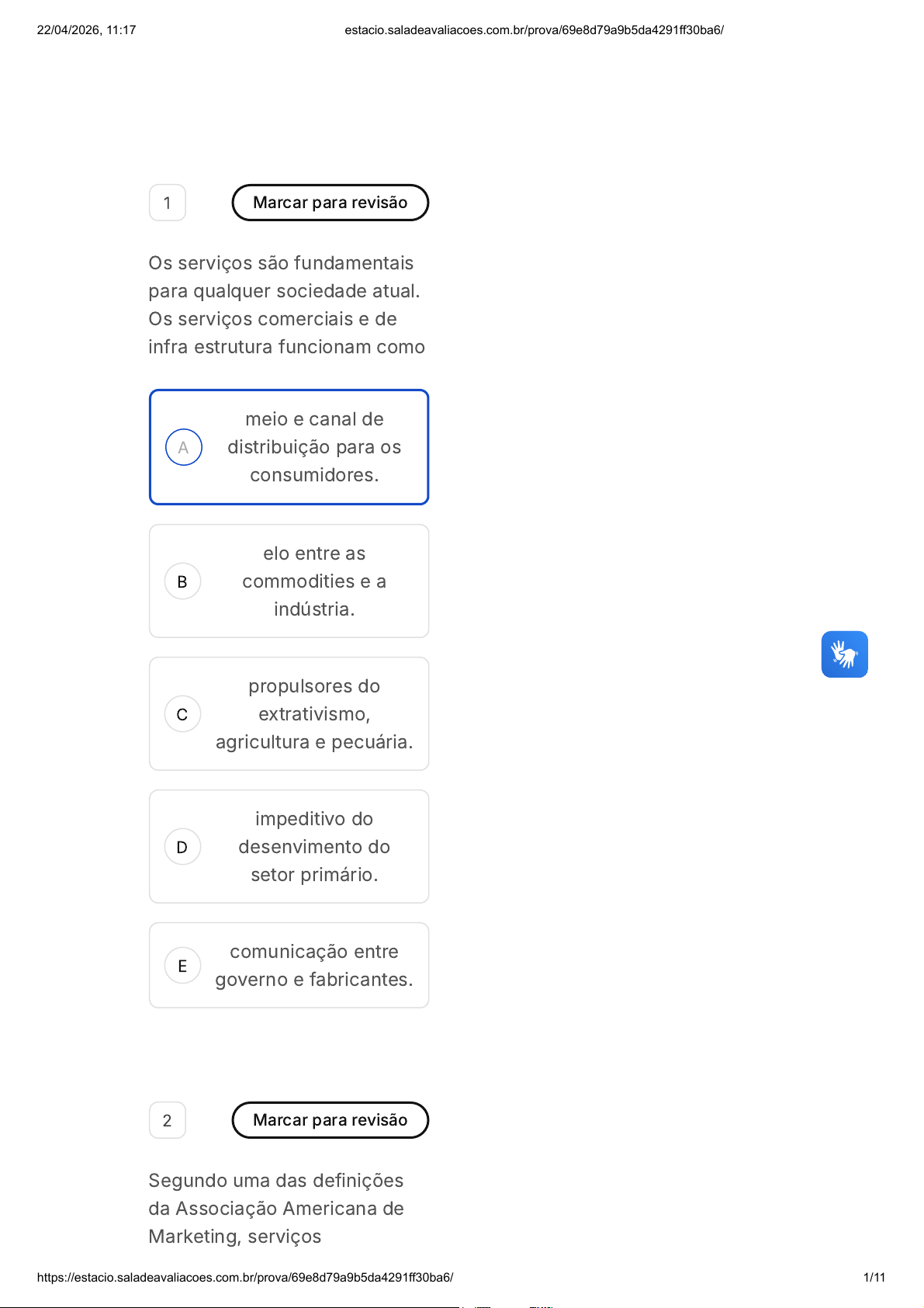 A B C D E 1 Marcar para revisão Os serviços são fundamentais para qualquer sociedade atual. Os serviços comerciais e de infra estrutura funcionam como meio e canal de distribuição para os consumidores. elo entre as commodities e a indústria. propulsores do extrativismo, agricultura e pecuária. impeditivo do desenvimento do setor primário. comunicação entre governo e fabricantes. 2 Marcar para revisão Segundo uma das definições da Associação Americana de Marketing, serviços 22/04/2026, 11:17 estacio.saladeavaliacoes.com.br/prova/69e8d79a9b5da4291ff30ba6/ https://estacio.saladeavaliacoes.com.br/prova/69e8d79a9b5da4291ff30ba6/ 1/11 A B C D E compreendem atividades, vantagens ou mesmo satisfações que são colocadas à venda ou que são proporcionadas em conexão com a venda de mercadorias. O setor de serviços torna-se cada dia mais importante na economia dos países. Segundo o IBGE, existem vários tipos de serviço, que podem ser: alojamento, alimentação, reparação, confecção, manutenção, de higiene pessoal, entre outros. São características específicas dos serviços, exceto: Intangibilidade. Promoção. Heterogeneidade. Perecibilidade. Simultaneidade. 3 Marcar para revisão A economia de uma sociedade se divide em três setores produtivos. Arquitetos, manicures e professores estão no mesmo setor. Aponte a 22/04/2026, 11:17 estacio.saladeavaliacoes.com.br/prova/69e8d79a9b5da4291ff30ba6/ https://estacio.saladeavaliacoes.com.br/prova/69e8d79a9b5da4291ff30ba6/ 2/11 A B C D E alternativa que indica corretamente a qual setor essas atividades estão vinculadas. Setor primário. Setor secundário. Setor terciário. Terceiro setor. Setor industrial. 4 Marcar para revisão Em um plano de negócios bem estruturado, a análise de mercado é fundamental. Ela permite identificar o público- alvo, as tendências de mercado e a concorrência. Esta seção é crítica para entender como posicionar o produto no mercado. Qual é o principal objetivo da análise de mercado em um plano de negócios? SM1 Direito, Tecnologia e Empreendimento 22/04/2026, 11:17 estacio.saladeavaliacoes.com.br/prova/69e8d79a9b5da4291ff30ba6/ https://estacio.saladeavaliacoes.com.br/prova/69e8d79a9b5da4291ff30ba6/ 3/11 A B C D E Definir a estratégia de preços do produto. Identificar as melhores práticas de gestão empresarial. Determinar o público- alvo e a posição do produto no mercado. Estabelecer metas de vendas a longo prazo. Desenvolver uma estratégia de marketing digital. 5 Marcar para revisão Empreendedores enfrentam inúmeras incertezas ao lançar ou expandir seus negócios. Qual é o papel do Plano de Negócios na redução de riscos? 00 hora : 46 min : 26 seg Ocultar Questão 6 de 10 Respondidas (10) Em branco (0) Finalizar prova 1 2 3 4 5 6 7 8 9 10 22/04/2026, 11:17 estacio.saladeavaliacoes.com.br/prova/69e8d79a9b5da4291ff30ba6/ https://estacio.saladeavaliacoes.com.br/prova/69e8d79a9b5da4291ff30ba6/ 4/11 A B C D E Eliminar completamente todos os riscos associados ao negócio. Identificar antecipadamente possíveis obstáculos e desafios. Garantir sucesso em todas as iniciativas empresariais. Aumentar os lucros de forma significativa. Substituir a necessidade de um seguro empresarial. 6 Marcar para revisão A gestão de riscos é uma parte vital do plano de negócios. Ela envolve a identificação, análise e resposta a riscos potenciais, garantindo que o negócio esteja preparado para desafios e incertezas. Qual é a função principal da gestão de riscos em um plano de negócios? 22/04/2026, 11:17 estacio.saladeavaliacoes.com.br/prova/69e8d79a9b5da4291ff30ba6/ https://estacio.saladeavaliacoes.com.br/prova/69e8d79a9b5da4291ff30ba6/ 5/11 A B C D E Definir metas de crescimento a longo prazo. Identificar e responder a riscos potenciais. Estabelecer uma cultura organizacional. Desenvolver um plano de marketing. Analisar tendências de mercado. 7 Marcar para revisão O setor de serviços é composto de vários tipos de serviços, como os serviços profissionais e os serviços de informática. Assinale a alternativa que não corresponde a um dos tipos de serviço que compõem esse setor: I. Pesquisa e desenvolvimento. II. Produção de alimentos. III. Comunicação. IV. Vendas. 22/04/2026, 11:17 estacio.saladeavaliacoes.com.br/prova/69e8d79a9b5da4291ff30ba6/ https://estacio.saladeavaliacoes.com.br/prova/69e8d79a9b5da4291ff30ba6/ 6/11 A B C D E Está correto o que se afirmar em: I, II e III II, III e IV I, II e III I, III e IV II, somente. 8 Marcar para revisão Ao enfrentar uma situação de crise em um projeto de segurança cibernética, o documento sugere que a criatividade pode ser uma aliada poderosa. Em momentos críticos, qual abordagem refletiria uma solução criativa e de longo prazo? 22/04/2026, 11:17 estacio.saladeavaliacoes.com.br/prova/69e8d79a9b5da4291ff30ba6/ https://estacio.saladeavaliacoes.com.br/prova/69e8d79a9b5da4291ff30ba6/ 7/11 A B C D E Aplicar técnicas tradicionais sem ajustes. Implementar novas técnicas que combinem inteligência artificial e análise comportamental. Focar na resolução imediata, independentemente do risco futuro. Evitar qualquer alteração nos processos atuais para minimizar o esforço. Limitar a solução a medidas pré- estabelecidas e mais seguras. 9 Marcar para revisão Carlos trabalha em uma empresa de tecnologia que incentiva o desenvolvimento de soluções criativas para problemas complexos. Recentemente, ele foi encarregado de criar uma ferramenta que proteja os 22/04/2026, 11:17 estacio.saladeavaliacoes.com.br/prova/69e8d79a9b5da4291ff30ba6/ https://estacio.saladeavaliacoes.com.br/prova/69e8d79a9b5da4291ff30ba6/ 8/11 A B C dados de clientes contra invasões cibernéticas cada vez mais sofisticadas. Carlos sabe que as soluções convencionais podem não ser suficientes, mas, devido ao prazo curto, ele considera seguir um método conhecido e seguro para garantir a entrega no tempo estimado. Qual estratégia de Carlos provavelmente tra