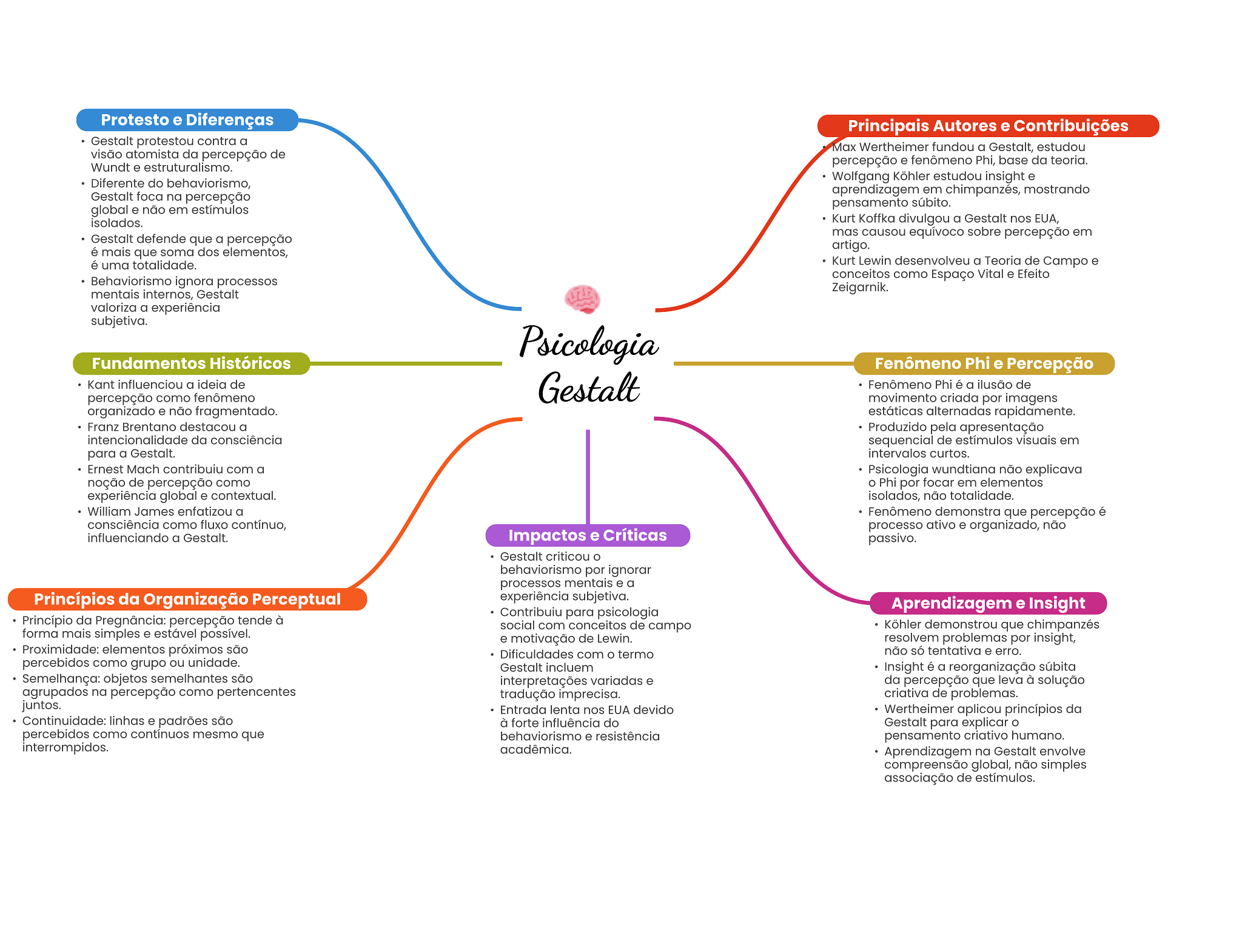 Protesto e Diferenças Principais Autores e Contribuições Gestalt protestou contra a Max Wertheimer fundou a Gestalt, estudou visão atomista da percepção de Wundt e estruturalismo. percepção e fenômeno Phi, base da teoria. Diferente do behaviorismo, Wolfgang Köhler estudou insight e Gestalt foca na percepção aprendizagem em chimpanzés, mostrando pensamento súbito. global e não em estímulos isolados. Kurt Koffka divulgou a Gestalt nos EUA, Gestalt defende que a percepção mas causou equívoco sobre percepção em é mais que soma dos elementos, artigo. é uma totalidade. Kurt Lewin desenvolveu a Teoria de Campo e Behaviorismo ignora processos conceitos como Espaço Vital e Efeito mentais internos, Gestalt Zeigarnik. valoriza a experiência subjetiva. Psicologia Fundamentos Históricos Fenômeno Phi e Percepção Kant influenciou a ideia de Gestalt Fenômeno Phi é a ilusão de percepção como fenômeno movimento criada por imagens organizado e não fragmentado. estáticas alternadas rapidamente. Franz Brentano destacou a - Produzido pela apresentação intencionalidade da consciência sequencial de estímulos visuais em para a Gestalt. intervalos curtos. Ernest Mach contribuiu com a Psicologia wundtiana não explicava noção de percepção como Phi por focar em elementos experiência global e contextual. isolados, não totalidade. William James enfatizou a Fenômeno demonstra que percepção é consciência como fluxo contínuo, processo ativo e organizado, não influenciando a Gestalt. Impactos e Críticas passivo. Gestalt criticou behaviorismo por ignorar processos mentais e a Princípios da Organização Perceptual experiência subjetiva. Aprendizagem e Insight Contribuiu para psicologia Princípio da Pregnância: percepção tende à social com conceitos de campo Köhler demonstrou que chimpanzés forma mais simples e estável possível. e motivação de Lewin. resolvem problemas por insight, Proximidade: elementos próximos são Dificuldades com termo não só tentativa e erro. percebidos como grupo ou unidade. Gestalt incluem Insight é a reorganização súbita Semelhança: objetos semelhantes são interpretações variadas e da percepção que leva à solução agrupados na percepção como pertencentes tradução imprecisa. criativa de problemas. juntos. Entrada lenta nos EUA devido Wertheimer aplicou princípios da Continuidade: linhas e padrões são à forte influência do Gestalt para explicar percebidos como contínuos mesmo que behaviorismo e resistência pensamento criativo humano. interrompidos. acadêmica. Aprendizagem na Gestalt envolve compreensão global, não simples associação de estímulos.