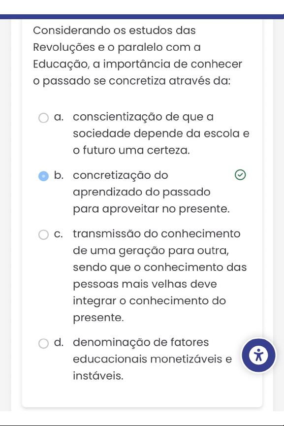 Considerando estudos das Revoluções e paralelo com a Educação, a importância de conhecer passado se concretiza através da: a. conscientização de que a sociedade depende da escola e futuro uma certeza. b. concretização do aprendizado do passado para aproveitar no presente. C. transmissão do conhecimento de uma geração para outra, sendo que conhecimento das pessoas mais velhas deve integrar conhecimento do presente. d. denominação de fatores educacionais monetizáveis e instáveis.Relacione as colunas de modo a identificar as Revoluções Industriais com a Evolução da Educação: (1) Máquinas a vapor (A) Educação bancária (2) Máquinas inteligentes (B) Cultura Maker (3) Controladores lógicos de programação (c) Escolas Paroquiais (4) Linha de montagem (D) Pedagogia Relacional a. 1-A; 2-C; 3-C; 4-D b. 1-C; 2-B; 3-D; C. 1-D; 2-A; 3-B; 4-B d. 1-B; 2-D; 3-A; 4-C ? HelpQuestão 3 Correto Atingiu 10,00 de 10,00 Marcar questão A educação bancária representa: a. criticar a atuação do sistema financeiro nacional. b. incentivar estudo da administração financeira desde as séries iniciais. C. ensinar como bancos operam nas escolas. d. depositar, transferir e transmitir valores e conhecimentos.Para Mello (2002), há sete áreas profissionais que terão acesso no mundo VUCA. São elas: a. Economia, Administração, Jurídico, Medicina, Inteligência Artificial, TI e Marketing. b. Assistência, engenharia da computação, marketing de vendas, dados, Inteligência Artificial, empregos verdes, gerentes de projetos especializados. C. Advocacia, docência, engenharia mecatrônica, engenharia aeroespacial, medicina, psicologia e nutrição d. Cultura, Sociedade, Habitação, Transporte, Entretenimento, Educação e Alimentação.Questão 5 Correto Atingiu 10,00 de 10,00 Marcar questão A Educação 5.0 propõe que alunos se tornem: a. Pioneiros do nascer de um novo mundo. b. Experimentadores da tecnologia e justifiquem resultados errados. C. Protagonistas da solução dos problemas. d. Representantes das atividades voltadas para controle das máquinas.
