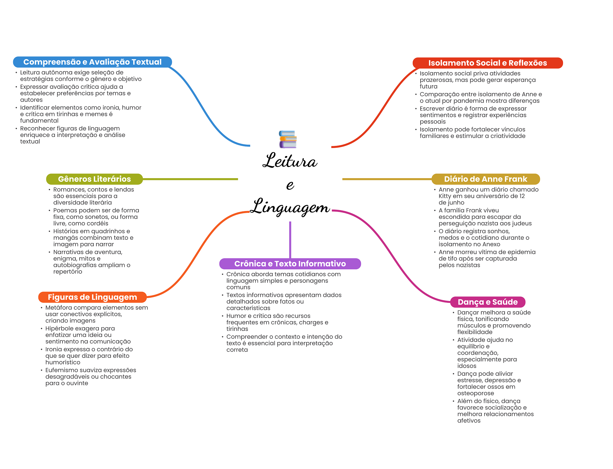 Compreensão e Avaliação Textual Isolamento Social e Reflexões Leitura autônoma exige seleção de Isolamento social priva atividades estratégias conforme gênero e objetivo prazerosas, mas pode gerar esperança Expressar avaliação crítica ajuda a futura estabelecer preferências por temas e Comparação entre isolamento de Anne e autores atual por pandemia mostra diferenças Identificar elementos como ironia, humor Escrever diário é forma de expressar e crítica em tirinhas e memes é sentimentos e registrar experiências fundamental pessoais Reconhecer figuras de linguagem Isolamento pode fortalecer vínculos enriquece a interpretação e análise familiares e estimular a criatividade textual Leitura Gêneros Literários Diário de Anne Frank e Romances, contos e lendas Anne ganhou um diário chamado são essenciais para a Kitty em seu aniversário de 12 diversidade literária Linguagem de junho Poemas podem ser de forma A família Frank viveu fixa, como sonetos, ou forma escondida para escapar da livre, como cordéis perseguição nazista aos judeus Histórias em quadrinhos e O diário registra sonhos, mangás combinam texto e medos e O cotidiano durante imagem para narrar isolamento no Anexo Narrativas de aventura, Anne morreu vítima de epidemia enigma, mitos e de tifo após ser capturada autobiografias ampliam Crônica e Texto Informativo pelos nazistas repertório Crônica aborda temas cotidianos com linguagem simples e personagens comuns Figuras de Linguagem Textos informativos apresentam dados detalhados sobre fatos ou Dança e Saúde Metáfora compara elementos sem características usar conectivos explícitos, Humor e crítica são recursos Dançar melhora a saúde criando imagens física, tonificando frequentes em crônicas, charges e Hipérbole exagera para tirinhas músculos e promovendo flexibilidade enfatizar uma ideia ou Compreender contexto e intenção do sentimento na comunicação texto é essencial para interpretação Atividade ajuda no Ironia expressa contrário do correta e que se quer dizer para efeito coordenação, humorístico especialmente para idosos Eufemismo suaviza expressões desagradáveis ou chocantes Dança pode aliviar para ouvinte estresse, depressão e fortalecer em osteoporose Além do físico, dança favorece socialização e melhora relacionamentos afetivos