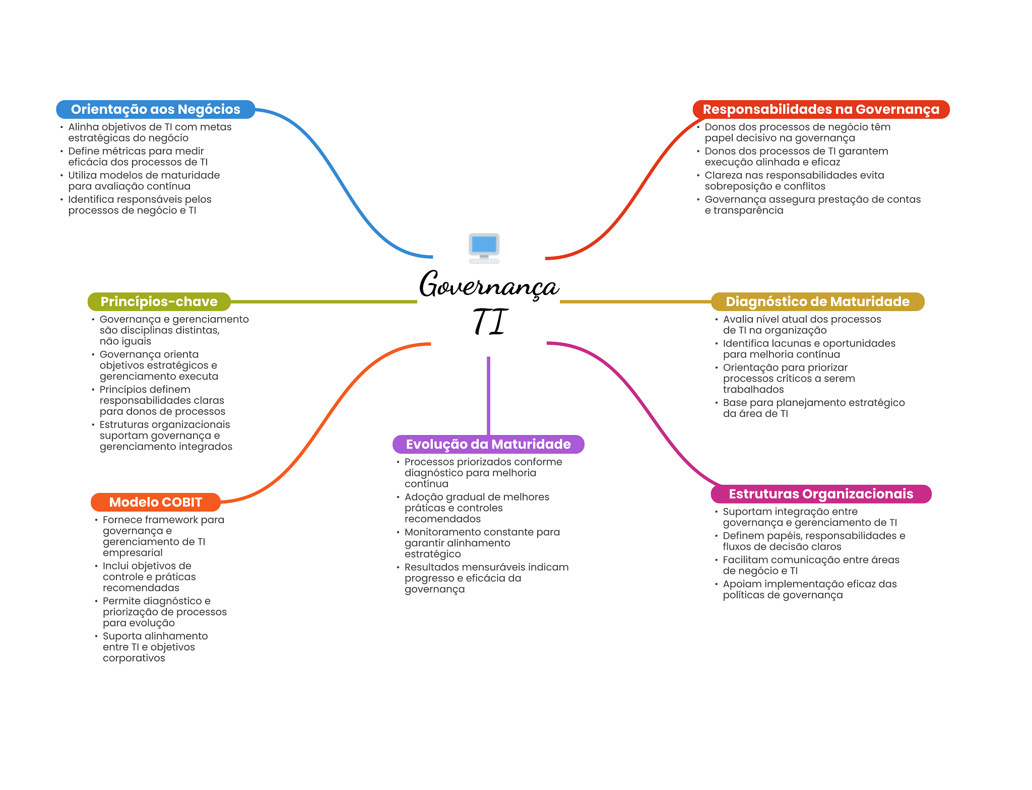 Orientação aos Negócios Responsabilidades na Governança Alinha objetivos de TI com metas Donos dos processos de negócio têm estratégicas do negócio papel decisivo na governança Define métricas para medir Donos dos processos de TI garantem eficácia dos processos de TI execução alinhada e eficaz Utiliza modelos de maturidade Clareza nas responsabilidades evita para avaliação contínua sobreposição e conflitos Identifica responsáveis pelos Governança assegura prestação de contas processos de negócio e TI e transparência Governança Princípios-chave Diagnóstico de Maturidade Governança e gerenciamento TI Avalia nível atual dos processos são disciplinas distintas, de TI na organização não iguais Identifica lacunas e oportunidades Governança orienta para melhoria contínua objetivos estratégicos e Orientação para priorizar gerenciamento executa processos críticos a serem Princípios definem trabalhados responsabilidades claras Base para planejamento estratégico para donos de processos da área de TI Estruturas organizacionais suportam governança e gerenciamento integrados Evolução da Maturidade Processos priorizados conforme diagnóstico para melhoria contínua Modelo Adoção gradual de melhores Estruturas Organizacionais práticas e controles Suportam integração entre Fornece framework para recomendados governança e gerenciamento de TI governança e Monitoramento constante para Definem papéis, responsabilidades e gerenciamento de TI garantir alinhamento fluxos de decisão claros empresarial estratégico Inclui objetivos de Facilitam comunicação entre áreas Resultados mensuráveis indicam de negócio e TI controle e práticas progresso e eficácia da recomendadas Apoiam implementação eficaz das governança Permite diagnóstico e políticas de governança priorização de processos para evolução Suporta alinhamento entre TI e objetivos corporativos