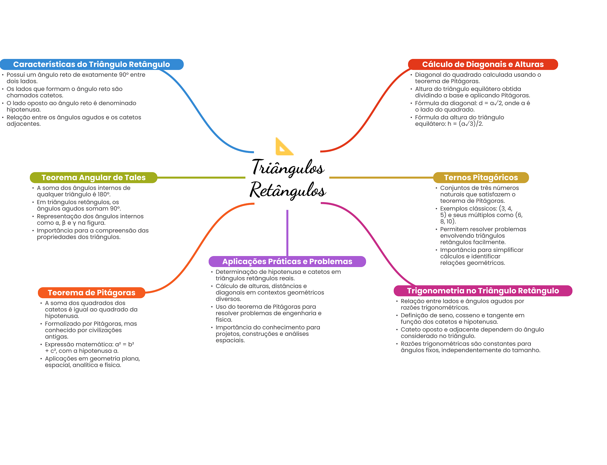 Características do Triângulo Retângulo Cálculo de Diagonais e Alturas Possui um ângulo reto de exatamente 90° entre Diagonal do quadrado calculada usando dois lados. teorema de Pitágoras. Os lados que formam ângulo reto são Altura do triângulo equilátero obtida chamados catetos. dividindo a base e aplicando Pitágoras. lado oposto ao ângulo reto é denominado Fórmula da diagonal: d = a2, onde a é hipotenusa. lado do quadrado. Relação entre OS ângulos agudos e OS catetos Fórmula da altura do triângulo adjacentes. equilátero: h = Triângulos Teorema Angular de Tales Ternos Pitagóricos A soma dos ângulos internos de Retângulos Conjuntos de três números qualquer triângulo é 180°. naturais que satisfazem O Em triângulos retângulos, OS teorema de Pitágoras. ângulos agudos somam 90°. Exemplos clássicos: (3, 4, Representação dos ângulos internos 5) e seus múltiplos como (6, como α, e Y na figura. 8, 10). Importância para a compreensão das Permitem resolver problemas propriedades dos triângulos. envolvendo triângulos retângulos facilmente. Importância para simplificar cálculos e identificar Aplicações Práticas e Problemas relações geométricas. Determinação de hipotenusa e catetos em triângulos retângulos reais. Cálculo de alturas, distâncias e Teorema de Pitágoras diagonais em contextos geométricos Trigonometria no Triângulo Retângulo diversos. A soma dos quadrados dos Relação entre lados e ângulos agudos por catetos é igual ao quadrado da Uso do teorema de Pitágoras para razões trigonométricas. hipotenusa. resolver problemas de engenharia e Definição de seno, cosseno e tangente em física. Formalizado por Pitágoras, mas função dos catetos e hipotenusa. conhecido por civilizações Importância do conhecimento para Cateto oposto e adjacente dependem do ângulo antigas. projetos, construções e análises considerado no triângulo. espaciais. Expressão matemática: = Razões são constantes para + com a hipotenusa a. ângulos fixos, independentemente do tamanho. Aplicações em geometria plana, espacial, analítica e física.