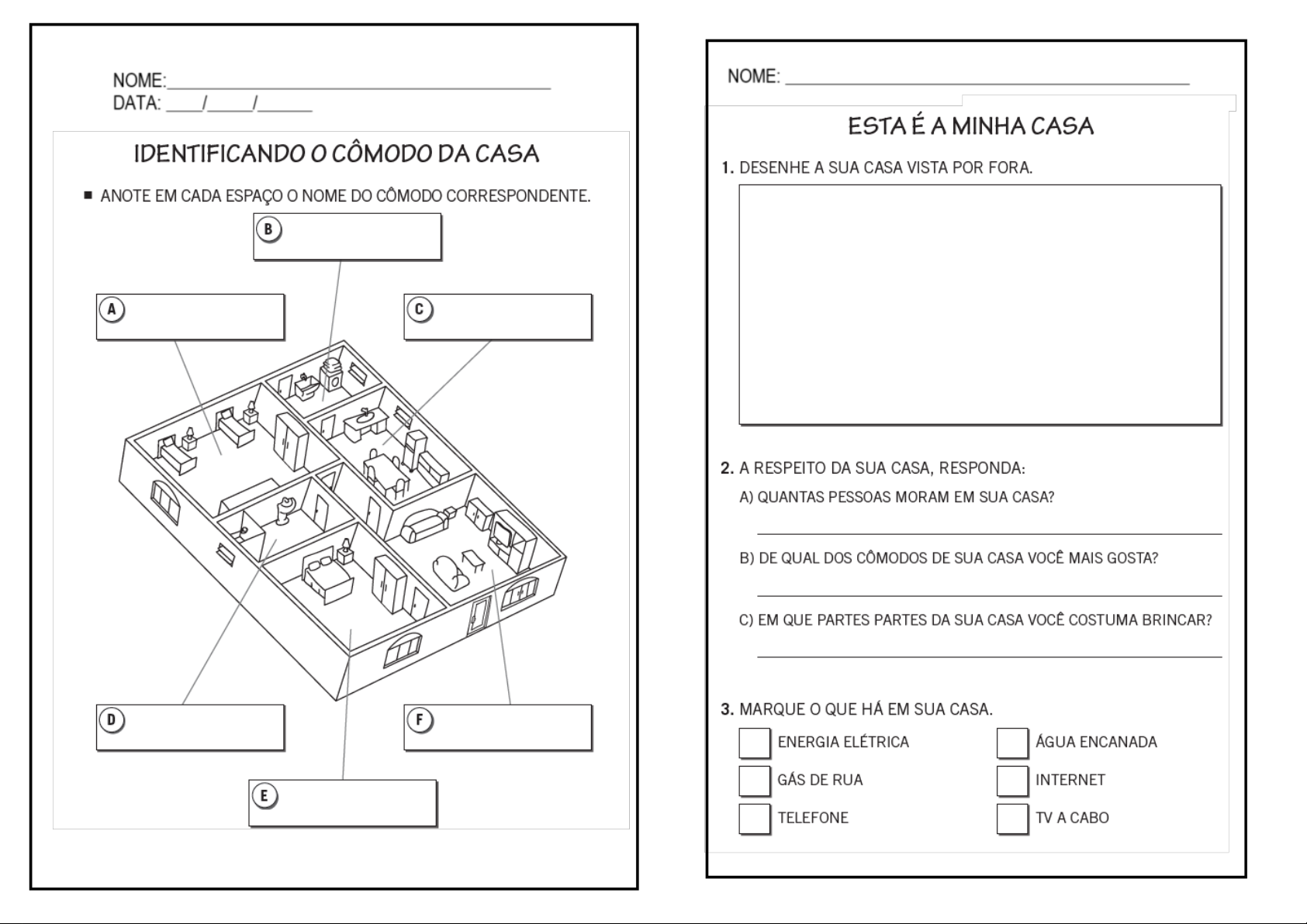 NOME: NOME: DATA: / / A MINHA CASA IDENTIFICANDO CÔMODO DA CASA 1. DESENHE A SUA CASA VISTA POR FORA. ANOTE EM CADA ESPAÇO NOME DO CÔMODO CORRESPONDENTE B A 2. A RESPEITO DA SUA CASA, RESPONDA: A) QUANTAS PESSOAS MORAM EM SUA CASA? B) DE QUAL DOS CÔMODOS DE SUA CASA VOCÊ MAIS GOSTA? C) EM QUE PARTES PARTES DA SUA CASA VOCÊ COSTUMA BRINCAR? 3. MARQUE QUE HÁ EM SUA CASA. D F ENERGIA ELÉTRICA ÁGUA ENCANADA GÁS DE RUA INTERNET E TELEFONE TV A CABO