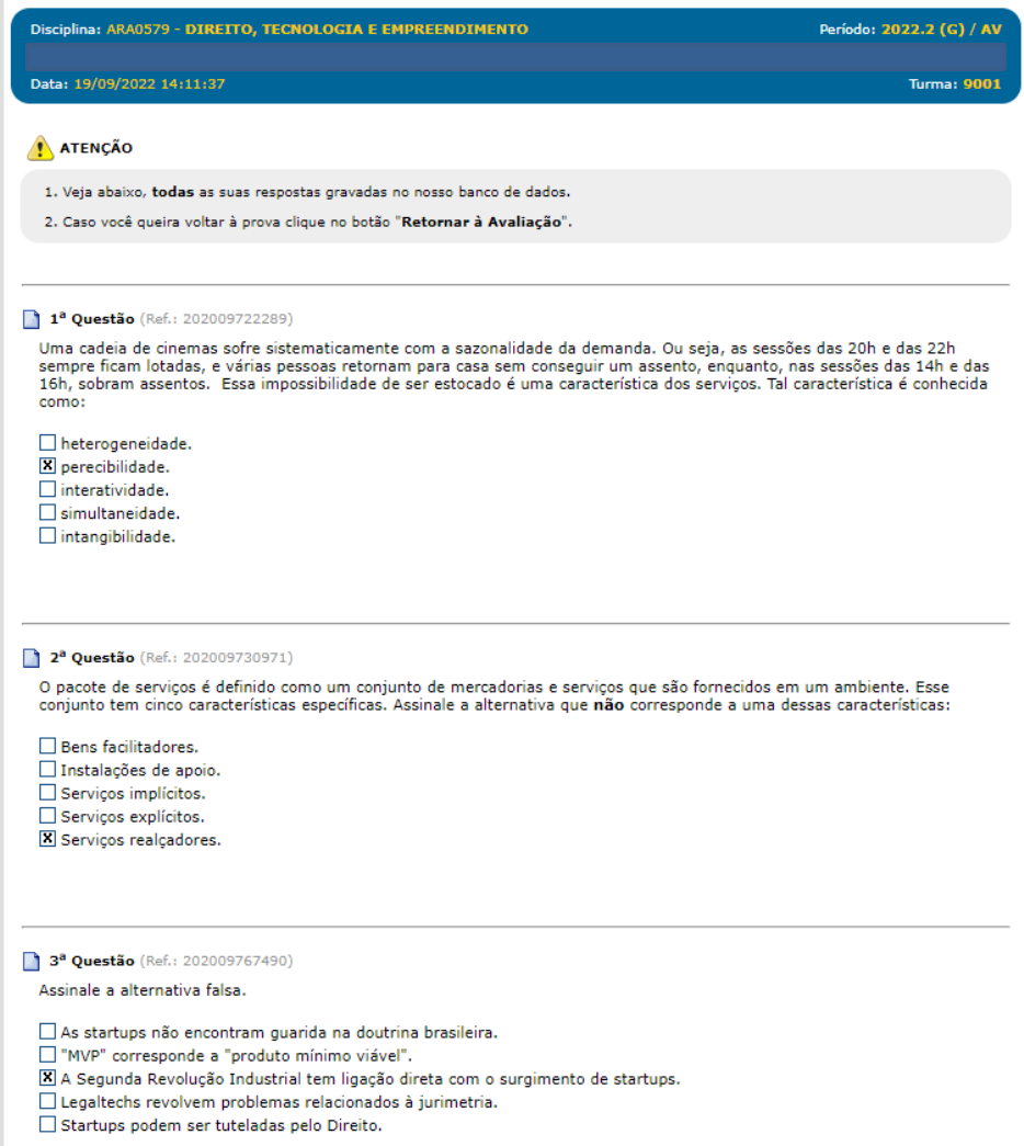 Disciplina: ARA0579 DIREITO, TECNOLOGIA E EMPREENDIMENTO Período: 2022.2 (G) / AV Data: 19/09/2022 14:11:37 Turma: 9001 ATENÇÃO 1. Veja abaixo, todas as suas respostas gravadas no nosso banco de dados. 2. Caso você queira voltar à prova clique no botão "Retornar à Avaliação". Questão (Ref.: 202009722289) Uma cadeia de cinemas sofre sistematicamente com a sazonalidade da demanda. Ou seja, as sessões das 20h e das 22h sempre ficam lotadas, e várias pessoas retornam para casa sem conseguir um assento, enquanto, nas sessões das 14h e das 16h, sobram assentos. Essa impossibilidade de ser estocado é uma característica dos serviços. Tal característica é conhecida como: heterogeneidade. perecibilidade. interatividade. simultaneidade. intangibilidade. Questão (Ref.: 202009730971) O pacote de serviços é definido como um conjunto de mercadorias e serviços que são fornecidos em um ambiente. Esse conjunto tem cinco características Assinale a alternativa que não corresponde a uma dessas características: Bens facilitadores. Instalações de apoio. Serviços Serviços Serviços realçadores. Questão (Ref.: 202009767490) Assinale a alternativa falsa. As startups não encontram guarida na doutrina brasileira. "MVP" corresponde a "produto mínimo viável". A Segunda Revolução Industrial tem ligação direta com 0 surgimento de startups. Legaltechs revolvem problemas relacionados à jurimetria. Startups podem ser tuteladas pelo Direito.