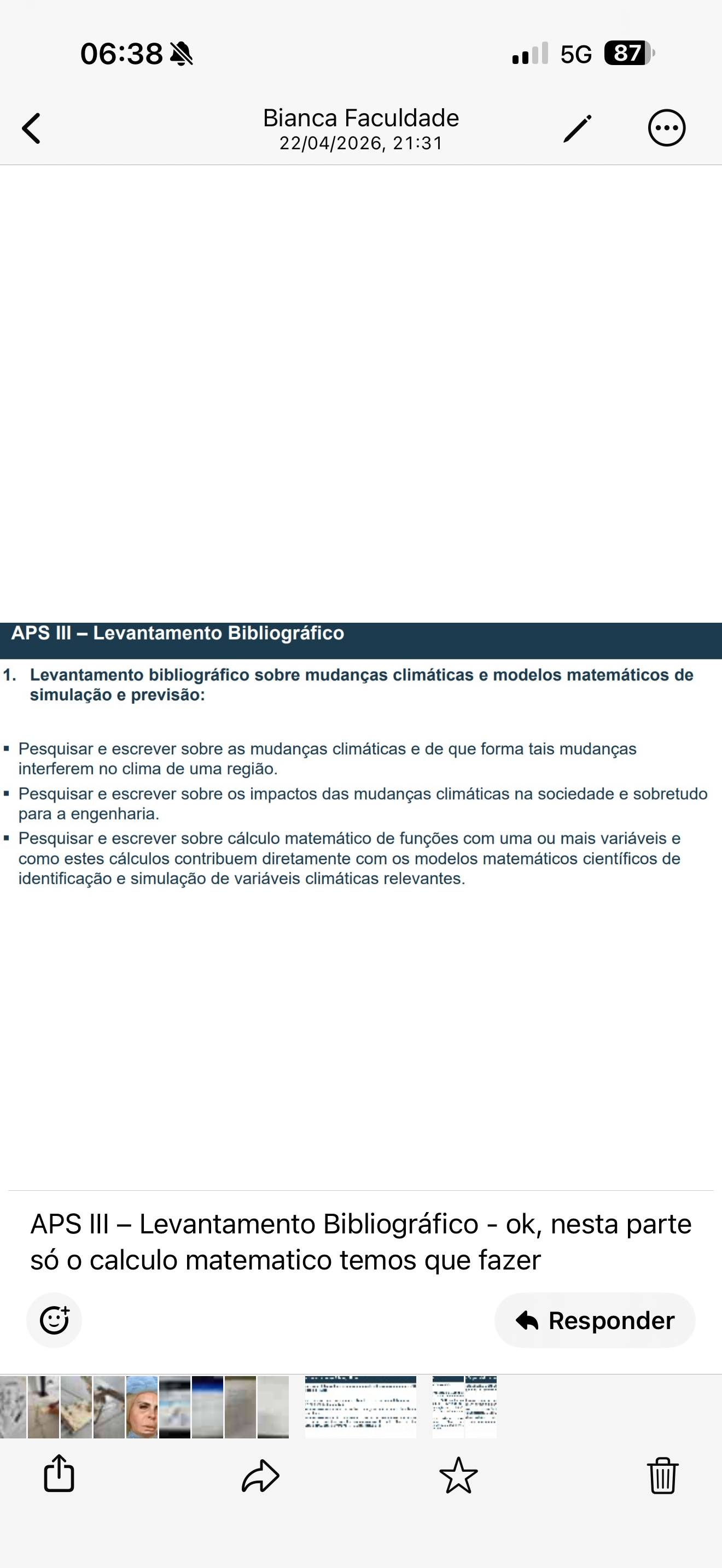 06:38 5G 87 Bianca Faculdade 22/04/2026, 21:31 APS III Levantamento Bibliográfico 1. Levantamento bibliográfico sobre mudanças climáticas e modelos matemáticos de simulação e previsão: Pesquisar e escrever sobre as mudanças climáticas e de que forma tais mudanças interferem no clima de uma região. Pesquisar e escrever sobre os impactos das mudanças climáticas na sociedade e sobretudo para a engenharia. Pesquisar e escrever sobre cálculo matemático de funções com uma ou mais variáveis e como estes cálculos contribuem diretamente com os modelos matemáticos científicos de identificação e simulação de variáveis climáticas relevantes. APS III Levantamento Bibliográfico - ok, nesta parte só calculo matematico temos que fazer Responder