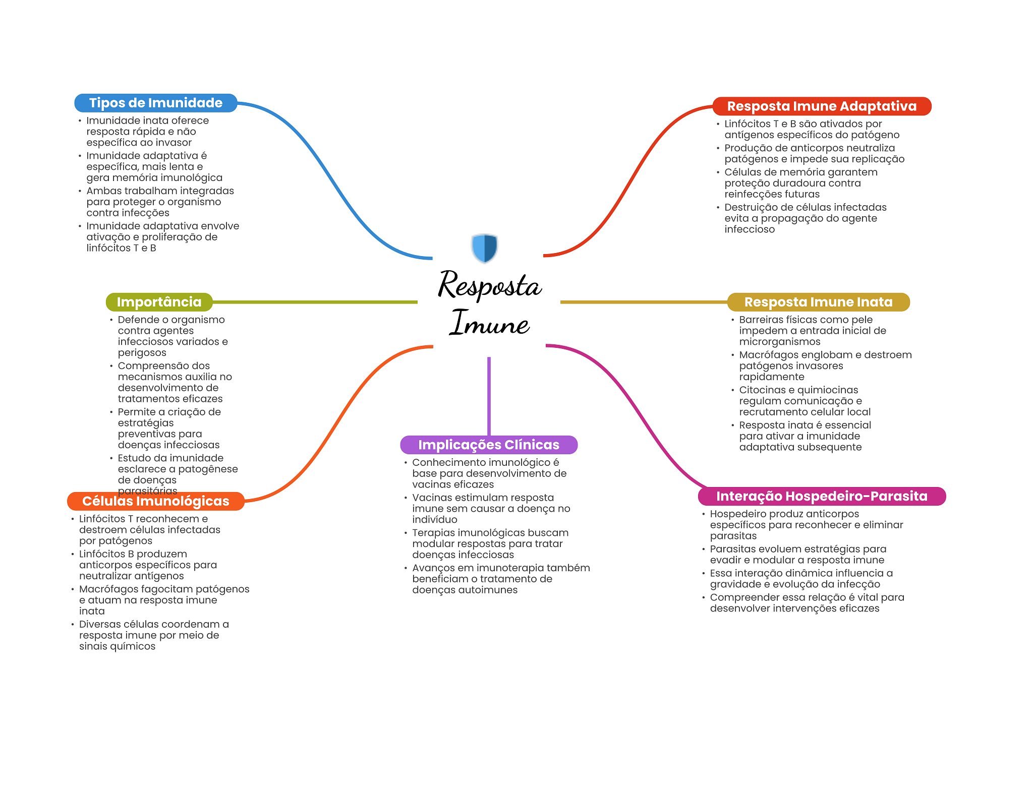 Tipos de Imunidade Resposta Imune Adaptativa Imunidade inata oferece Linfócitos T e são ativados por resposta rápida e não antígenos específicos do patógeno específica ao invasor Produção de anticorpos neutraliza Imunidade adaptativa é patógenos e impede sua replicação específica, mais lenta e gera memória imunológica Células de memória garantem proteção duradoura contra Ambas trabalham integradas reinfecções futuras para proteger organismo contra infecções Destruição de células infectadas evita a propagação do agente Imunidade adaptativa envolve infeccioso ativação e proliferação de linfócitos T e Resposta Importância Resposta Imune Inata Defende organismo Imune Barreiras físicas como pele contra agentes impedem a entrada inicial de infecciosos variados e microrganismos perigosos Macrófagos englobam e destroem Compreensão dos patógenos invasores mecanismos auxilia no rapidamente desenvolvimento de Citocinas e quimiocinas tratamentos eficazes regulam comunicação e Permite a criação de recrutamento celular local estratégias Resposta inata é essencial preventivas para para ativar a imunidade doenças infecciosas Implicações Clínicas adaptativa subsequente Estudo da imunidade Conhecimento imunológico é esclarece a patogênese base para desenvolvimento de de doenças vacinas eficazes parasitárias Células Imunológicas Vacinas estimulam resposta Interação imune sem causar a doença no Linfócitos T reconhecem e indivíduo Hospedeiro produz anticorpos destroem células infectadas específicos para reconhecer e eliminar Terapias imunológicas buscam por patógenos parasitas modular respostas para tratar Linfócitos produzem doenças infecciosas Parasitas evoluem estratégias para anticorpos específicos para evadir e modular a resposta imune Avanços em imunoterapia também neutralizar antígenos beneficiam tratamento de Essa interação dinâmica influencia a Macrófagos fagocitam patógenos doenças autoimunes gravidade e evolução da infecção e atuam na resposta imune Compreender essa relação é vital para inata desenvolver intervenções eficazes Diversas células coordenam a resposta imune por meio de sinais químicos