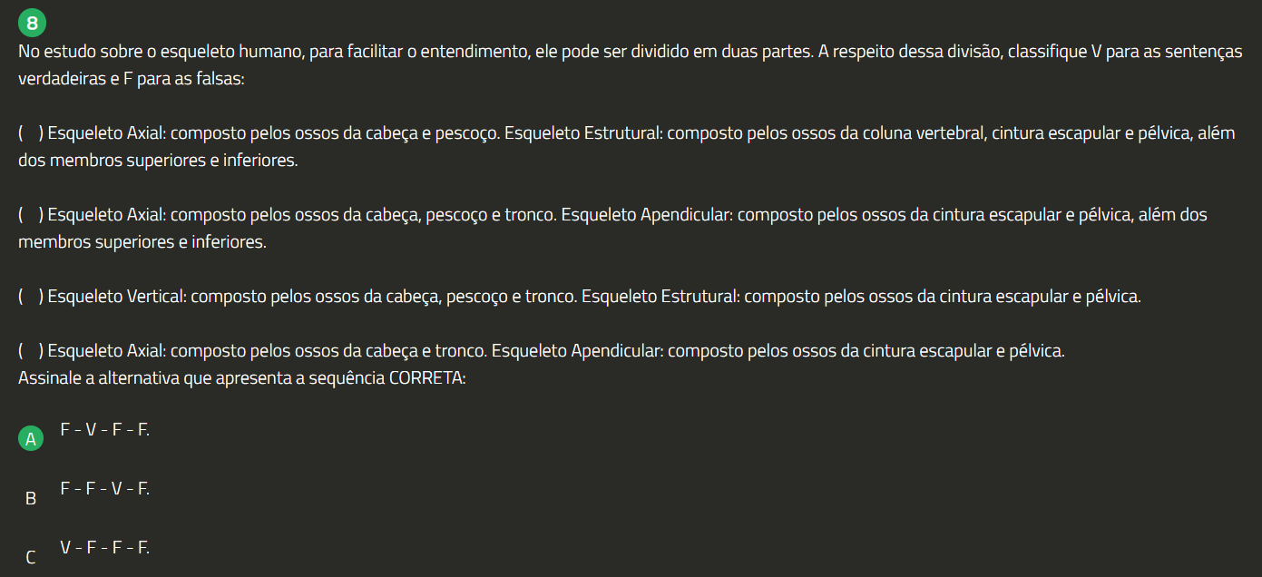 8 No estudo sobre 0 esqueleto humano, para facilitar 0 entendimento, ele pode ser dividido em duas partes. A respeito dessa divisão, classifique V para as sentenças verdadeiras e F para as falsas: Esqueleto Axial: composto pelos OSSOS da cabeça e pescoço. Esqueleto Estrutural: composto pelos OSSOS da coluna vertebral, cintura escapular e pélvica, além dos membros superiores e inferiores. Esqueleto Axial: composto pelos OSSOS da cabeça, pescoço e tronco. Esqueleto Apendicular: composto pelos OSSOS da cintura escapular e pélvica, além dos membros superiores e inferiores. Esqueleto Vertical: composto pelos OSSOS da cabeça, pescoço e tronco. Esqueleto Estrutural: composto pelos OSSOS da cintura escapular e pélvica. Esqueleto Axial: composto pelos OSSOS da cabeça e tronco. Esqueleto Apendicular: composto pelos OSSOS da cintura escapular e pélvica. Assinale a alternativa que apresenta a sequência CORRETA: F-V-F-F. A F-F-V-F. B V-F-F-F.