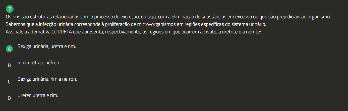 7 Os rins são estruturas relacionadas com 0 processo de excreção, ou seja, com a eliminação de substâncias em excesso ou que são prejudiciais ao organismo. Sabemos que a infecção urinária corresponde à proliferação de micro-organismos em regiões específicas do sistema urinário. Assinale a alternativa CORRETA que apresenta, respectivamente, as regiões em que ocorrem a cistite, a uretrite e a nefrite: A Bexiga urinária, uretra e rim. Rim, uretra e néfron. B Bexiga urinária, rim e néfron. D Ureter, uretra e rim.