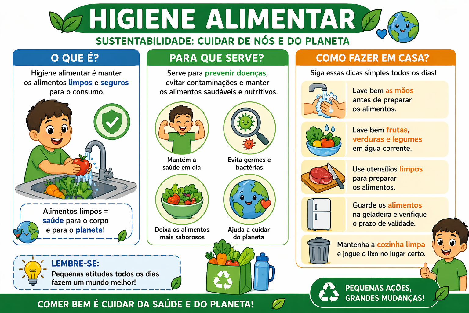 HIGIENE ALIMENTAR SUSTENTABILIDADE: CUIDAR DE NÓS E DO PLANETA QUE É? PARA QUE SERVE? COMO FAZER EM CASA? Higiene alimentar é manter Serve para prevenir doenças, Siga essas dicas simples todos os dias! os alimentos limpos e seguros evitar contaminações e manter para consumo. os alimentos saudáveis e nutritivos. Lave bem as mãos antes de preparar os alimentos. Lave bem frutas, verduras e legumes em água corrente. Mantém a Evita germes e saúde em dia bactérias Use utensílios limpos para preparar os alimentos. Guarde os alimentos Alimentos limpos = na geladeira e verifique saúde para corpo prazo de validade. e para o planeta! Deixa os alimentos Ajuda a cuidar mais saborosos do planeta Mantenha a cozinha limpa e jogue lixo no lugar certo. LEMBRE-SE: Pequenas atitudes todos os dias fazem um mundo melhor! PEQUENAS AÇÕES, COMER É CUIDAR DA SAÚDE E DO PLANETA! GRANDES MUDANÇAS!