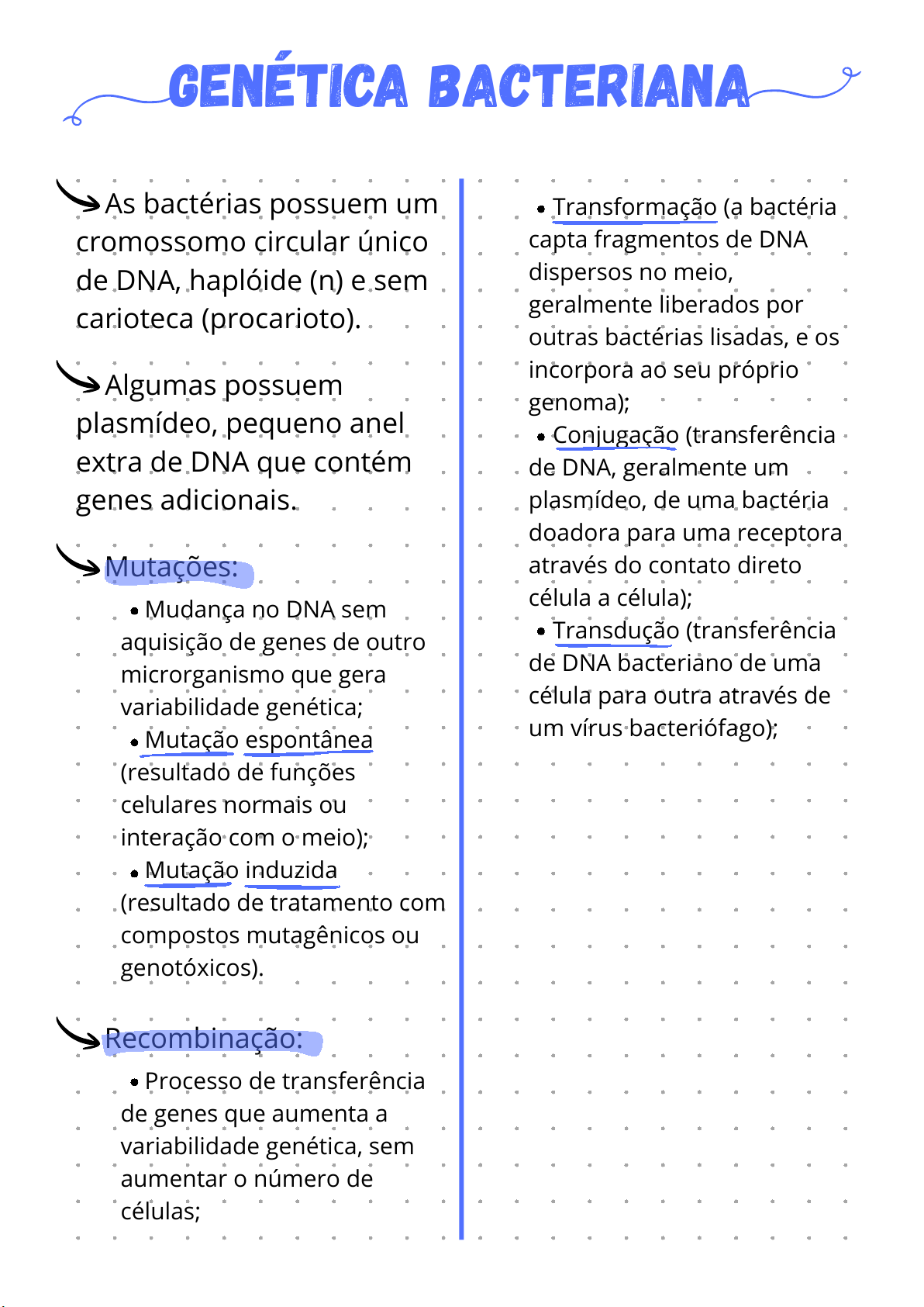 Algumas possuem plasmídeo, pequeno anel extra de DNA que contém genes adicionais. Mutações: Mudança no DNA sem aquisição de genes de outro microrganismo que gera variabilidade genética; Mutação espontânea (resultado de funções celulares normais ou interação com o meio); Mutação induzida (resultado de tratamento com compostos mutagênicos ou genotóxicos). Recombinação: Processo de transferência de genes que aumenta a variabilidade genética, sem aumentar o número de células; Transformação (a bactéria capta fragmentos de DNA dispersos no meio, geralmente liberados por outras bactérias lisadas, e os incorpora ao seu próprio genoma); Conjugação (transferência de DNA, geralmente um plasmídeo, de uma bactéria doadora para uma receptora através do contato direto célula a célula); Transdução (transferência de DNA bacteriano de uma célula para outra através de um vírus bacteriófago); genética bacteriana As bactérias possuem um cromossomo circular único de DNA, haplóide (n) e sem carioteca (procarioto). genética bacteriana genética bacteriana As bactérias possuem um cromossomo circular único de DNA, haplóide (n) e sem carioteca (procarioto). Algumas possuem plasmídeo, pequeno anel extra de DNA que contém genes adicionais. Mutações: Recombinação: genética bacteriana