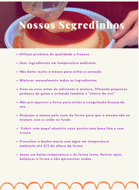 Nossos Segredinhos Utilizar produtos de qualidade e frescos Usar ingredientes em temperatura ambiente Não bater muito a massa para evitar a aeração Misturar manualmente todos ingredientes Coar ovos antes de adicionar à mistura, filtrando pequenos pedaços de gema e evitando também "cheiro de ovo" Não pré-aquecer forno para evitar a coagulação brusca do ovo Despejar a massa pelo cone da forma para que a mesma não se misture com a calda no fundo Cobrir com papel alumínio caso queira uma base lisa e sem crosta Preencher banho-maria com água em temperatura ambiente até 2/3 da altura da forma Assar em baixa temperatura e de forma lenta. Retirar após balançar a forma e não apresentar ondas
