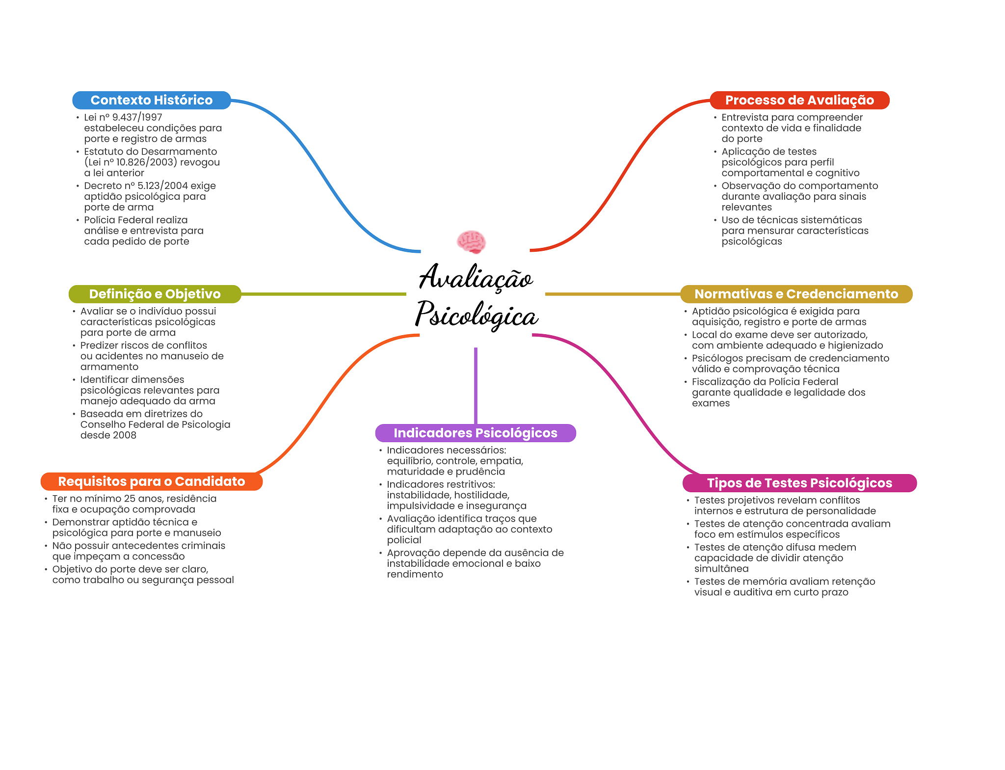 Contexto Histórico Processo de Avaliação Lei n° 9.437/1997 Entrevista para compreender estabeleceu condições para contexto de vida e finalidade porte e registro de armas do porte Estatuto do Desarmamento Aplicação de testes (Lei n° 10.826/2003) revogou psicológicos para perfil a lei anterior comportamental e cognitivo Decreto n° 5.123/2004 exige Observação do comportamento aptidão psicológica para durante avaliação para sinais porte de arma relevantes Polícia Federal realiza Uso de técnicas sistemáticas análise e entrevista para para mensurar características cada pedido de porte psicológicas Avaliação Definição e Objetivo Normativas e Credenciamento Avaliar se indivíduo possui características psicológicas Psicológica Aptidão psicológica é exigida para aquisição, registro e porte de armas para porte de arma Local do exame deve ser autorizado, Predizer riscos de conflitos com ambiente adequado e higienizado ou acidentes no manuseio de Psicólogos precisam de credenciamento armamento válido e comprovação técnica Identificar dimensões Fiscalização da Polícia Federal psicológicas relevantes para garante qualidade e legalidade dos manejo adequado da arma exames Baseada em diretrizes do Conselho Federal de Psicologia desde 2008 Indicadores Psicológicos Indicadores necessários: equilíbrio, controle, empatia, maturidade e prudência Requisitos para Candidato Indicadores restritivos: Tipos de Testes Psicológicos Ter no mínimo 25 anos, residência instabilidade, hostilidade, fixa e ocupação comprovada impulsividade e insegurança Testes projetivos revelam conflitos internos e estrutura de personalidade Demonstrar aptidão técnica e Avaliação identifica traços que dificultam adaptação ao contexto Testes de atenção concentrada avaliam psicológica para porte e manuseio policial foco em estímulos específicos Não possuir antecedentes criminais que impeçam a concessão Aprovação depende da ausência de Testes de atenção difusa medem instabilidade emocional e baixo capacidade de dividir atenção Objetivo do porte deve ser claro, simultânea rendimento como trabalho ou segurança pessoal Testes de memória avaliam retenção visual e auditiva em curto prazo