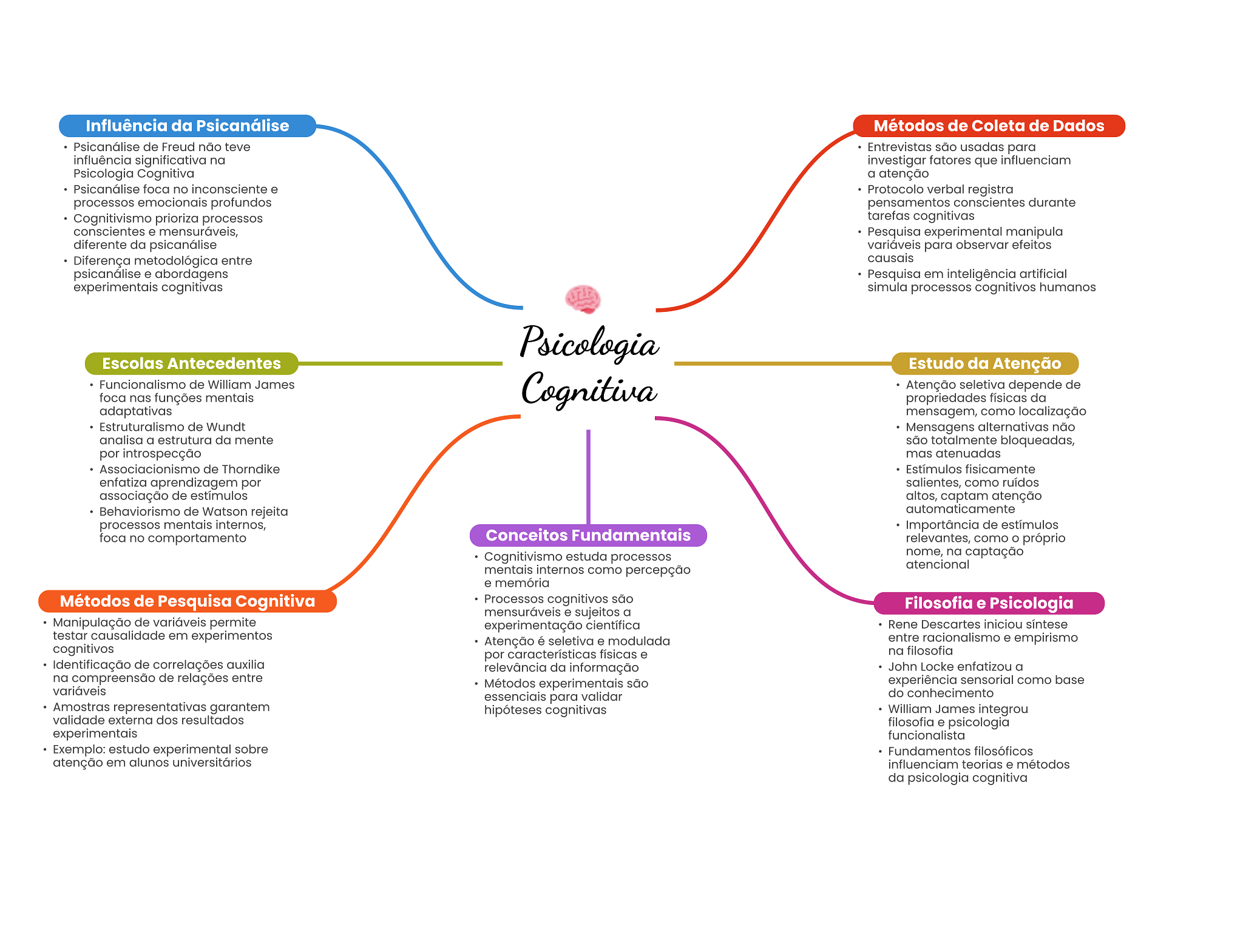 Influência da Psicanálise Métodos de Coleta de Dados Psicanálise de Freud não teve Entrevistas são usadas para influência significativa na investigar fatores que influenciam Psicologia Cognitiva a atenção Psicanálise foca no inconsciente e Protocolo verbal registra processos emocionais profundos pensamentos conscientes durante Cognitivismo prioriza processos tarefas cognitivas conscientes e mensuráveis, Pesquisa experimental manipula diferente da psicanálise variáveis para observar efeitos Diferença metodológica entre causais psicanálise e abordagens Pesquisa em inteligência artificial experimentais cognitivas simula processos cognitivos humanos Psicologia Escolas Antecedentes Estudo da Atenção Funcionalismo de William James Cognitiva Atenção seletiva depende de foca nas funções mentais propriedades físicas da adaptativas mensagem, como localização Estruturalismo de Wundt Mensagens alternativas não analisa a estrutura da mente são totalmente bloqueadas, por introspecção mas atenuadas Associacionismo de Thorndike Estímulos fisicamente enfatiza aprendizagem por salientes, como ruídos associação de estímulos altos, captam atenção Behaviorismo de Watson rejeita automaticamente processos mentais internos, Importância de estímulos foca no comportamento Conceitos Fundamentais relevantes, como próprio Cognitivismo estuda processos nome, na captação atencional mentais internos como percepção e memória Métodos de Pesquisa Cognitiva Processos cognitivos são Filosofia e Psicologia mensuráveis e sujeitos a Manipulação de variáveis permite experimentação científica Rene Descartes iniciou síntese testar causalidade em experimentos Atenção é seletiva e modulada entre racionalismo e empirismo cognitivos por características físicas e na filosofia Identificação de correlações auxilia relevância da informação John Locke enfatizou a na compreensão de relações entre Métodos experimentais são experiência sensorial como base variáveis essenciais para validar do conhecimento Amostras representativas garantem hipóteses cognitivas William James integrou validade externa dos resultados filosofia e psicologia experimentais funcionalista Exemplo: estudo experimental sobre Fundamentos filosóficos atenção em alunos universitários influenciam teorias e métodos da psicologia cognitiva