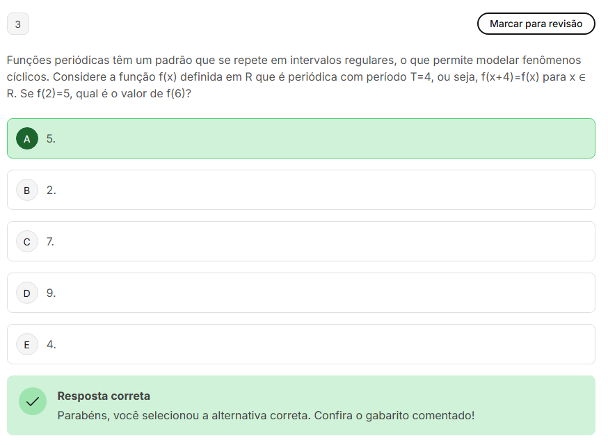 3 Marcar para revisão Funções periódicas têm um padrão que se repete em intervalos regulares, O que permite modelar fenômenos cíclicos. Considere a função f(x) definida em R que é periódica com período T=4, ou seja, f(x+4)=f(x) para X E R. Se f(2)=5, qual é O valor de f(6)? A 5. B 2. C 7. D 9. E 4. Resposta correta Parabéns, você selecionou a alternativa correta. Confira O gabarito comentado!
