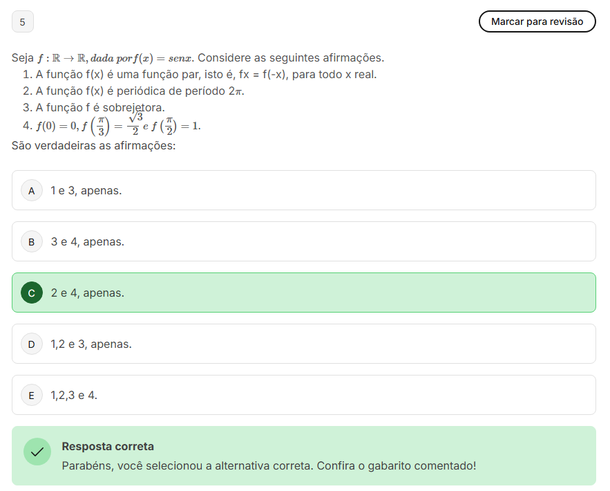 5 Marcar para revisão Seja dada por f(x) = senx. Considere as seguintes afirmações. 1. A função f(x) é uma função par, isto é, fx = f(-x), para todo X real. 2. A função f(x) é periódica de período 2π. 3. A função f é sobrejetora. 4. f(0) = 0, = f 1. São verdadeiras as afirmações: A 1e 3, apenas. B 3 e 4, apenas. C D 1,2 e 3, apenas. E 1,2,3 e 4. Resposta correta Parabéns, você selecionou a alternativa correta. Confira gabarito comentado!