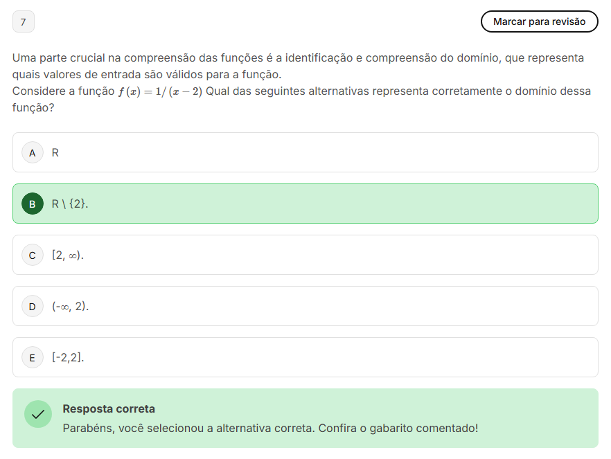 7 Marcar para revisão Uma parte crucial na compreensão das funções é a identificação e compreensão do domínio, que representa quais valores de entrada são válidos para a função. Considere a função f (x) = 1/ (x 2) Qual das seguintes alternativas representa corretamente domínio dessa função? A R B R {2}. C [2, D 2). E [-2,2]. Resposta correta Parabéns, você selecionou a alternativa correta. Confira gabarito comentado!