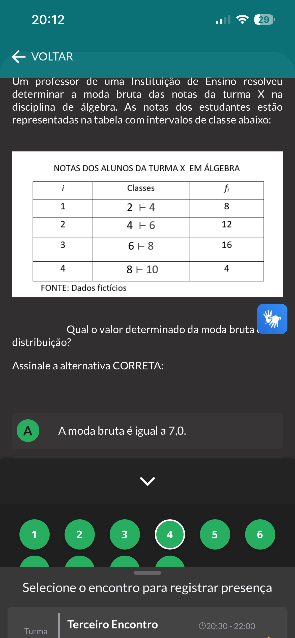 20:12 29 VOLTAR Um professor de uma Instituição de Ensino resolveu determinar a moda bruta das notas da turma X na disciplina de álgebra. As notas dos estudantes estão representadas na tabela com intervalos de classe abaixo: NOTAS DOS ALUNOS DA TURMA X EM ÁLGEBRA i Classes fi 1 2 8 2 4 12 3 6 8 16 4 8 10 4 FONTE: Dados fictícios Qual valor determinado da moda bruta distribuição? Assinale a alternativa CORRETA: A A moda bruta é igual a 7,0. 1 2 3 4 5 6 Selecione encontro para registrar presença Terceiro Encontro ©20:30 - - 22:00 Turma