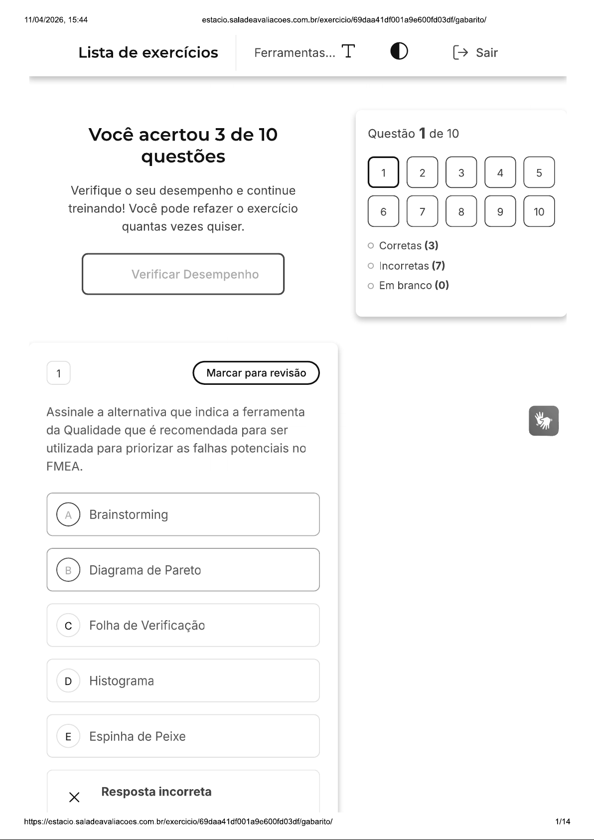 11/04/2026, 15:44 Lista de exercícios Ferramentas... T Sair Você acertou 3 de 10 Questão 1 de 10 questões 1 2 3 4 5 Verifique seu desempenho e continue treinando! Você pode refazer exercício 6 7 8 9 10 quantas vezes quiser. Corretas (3) Incorretas (7) Verificar Desempenho Em branco (0) 1 Marcar para revisão Assinale a alternativa que indica a ferramenta da Qualidade que é recomendada para ser utilizada para priorizar as falhas potenciais no FMEA. A Brainstorming Diagrama de Pareto c Folha de Verificação D Histograma E Espinha de Peixe X Resposta incorreta 1/1411/04/2026, 15:44 estacio.saladeavaliacoes.com.br/exercicio/69daa41df001a9e600fd03dfgabarito/ Opa! A alternativa correta é a letra B. Confira gabarito comentado! Gabarito Comentado Diagrama de Pareto é a ferramenta correta para priorizar as falhas potenciais no FMEA. Esta ferramenta é baseada no princípio de Pareto, também conhecido como a regra 80/20, que afirma que 80% dos problemas são geralmente causados por 20% das causas. Portanto, ao usar Diagrama de Pareto, é possível identificar e priorizar as causas mais significativas de falhas, permitindo que as equipes de qualidade se concentrem nas áreas que proporcionarão maior impacto. 2 Marcar para revisão Uma ferramenta da qualidade utilizada para mapeamento, controle e estabelecimento de ações corretivas foi criada por Ishikawa. Chamada de "diagrama de Causa e Efeito", "diagrama Espinha de Peixe" ou "diagrama de Ishikawa", foi dividida em seis famílias de possíveis causas. São elas: Matéria-prima, manutenção, meio A ambiente, medida, mão de obra e método. Matéria-prima, máquina, meio ambiente, melhoria contínua, mão de obra e método. 2/1411/04/2026, 15:44 Matriz de desempenho, máquina, meio c ambiente, melhoria contínua, mão de obra e método. Matéria-prima, máquina, meio D ambiente, medida, mão de obra e método. Mitigação, máquina, meio ambiente, E melhoria contínua, mão de obra e método. X Resposta incorreta Opa! A alternativa correta é a letra D. Confira gabarito comentado! Gabarito Comentado diagrama de Ishikawa, também conhecido como "diagrama de Causa e Efeito" ou "diagrama Espinha de Peixe", é uma ferramenta de qualidade que foi dividida em seis famílias de possíveis causas para um problema. Essas famílias são: Matéria-prima, máquina, meio ambiente, medida, mão de obra e método. Portanto, a alternativa correta é a letra D, que apresenta exatamente essas seis categorias. 3 Marcar para revisão Os objetivos principais da adoção de Sistemas Integrados de Gestão (ERP) são facilitar a identificação da ação dos concorrentes e acompanhar os principais índices de atividade 3/1411/04/2026, 15:44 econômica da área de atuação da empresa adotante. PORQUE Os Sistemas Integrados de Gestão são construídos com as melhores características dos sistemas de informação executiva e dos sistemas especialistas. Analisando-se as afirmações anteriores, conclui-se que: As duas afirmações são verdadeiras e A a segunda justifica a primeira. As duas afirmações são verdadeiras e a segunda não justifica a primeira. A primeira afirmação é verdadeira e a c segunda é falsa. A primeira afirmação é falsa e a D segunda é verdadeira. E As duas afirmações são falsas. X Resposta incorreta Opa! A alternativa correta é a letra E. Confira gabarito comentado! Gabarito Comentado As duas afirmações são falsas. objetivo principal da adoção de Sistemas Integrados de Gestão (ERP) não é facilitar a identificação da ação dos concorrentes e acompanhar os principais índices de atividade econômica da área de atuação da empresa adotante. O ERP é um sistema de informação que integra todos os dados e https://estacio.saladeavaliacoes.com.br/exercicio/69daa41df001a9e600fd03df/gabarito/ 4/1411/04/2026, 15:44 processos de uma organização em um único sistema. A integração pode ser vista sob a perspectiva funcional (sistemas de: finanças, contabilidade, recursos humanos, fabricação, marketing, vendas, compras etc) e sob a perspectiva sistêmica (sistema de processamento de transações, sistemas de informações gerenciais, sistemas de apoio à decisão etc). Além disso, os Sistemas Integrados de Gestão não são necessariamente construídos com as melhores características dos sistemas de informação executiva e dos sistemas especialistas. Cada ERP é construído de acordo com as necessidades e especificidades de cada organização. 4 Marcar para revisão As ferramentas da qualidade são importantes para a implantação de sistemas de gestão. Assinale a alternativa que indica motivo dessa importância. Porque são exclusivamente utilizadas A para análise de falhas em equipamentos. Porque foram criadas para aprimorar apenas os processos empresariais japoneses. Porque fazem parte de métodos c estatísticos avançados e complexos. https://estacio.saladeavaliacoes.com.br/exercicio/69daa41df001a9e600fd03dfgabarito/ 5/1411/04/2026, 15:44 Porque contribuem para a melhoria da D qualidade de produtos e processos. Porque são ferramentas mágicas sem E embasamento teórico. X Resposta incorreta Opa! A alternativa correta é a letra D. Confira gabarito comentado! Gabarito Comentado As ferramentas da qualidade são essenciais para a implantação de sistemas de gestão devido à sua contribuição significativa para a melhoria da qualidade de produtos e processos. Elas são baseadas em métodos estatísticos elementares e são amplamente utilizadas em diversas organizações. 5 Marcar para revisão As ferramentas da qualidade ajudam a determinar como processos podem ser melhorados ou analisados. A ferramenta da qualidade que está relacionada ao princípio de Pareto é: A Curva ABC. 5 Porquês. 6/1411/04/2026, 15:44 c Matriz GUT. D FMEA. E Diagrama de Ishikawa. Resposta correta Parabéns, você selecionou a alternativa correta. Confira gabarito comentado! Gabarito Comentado A Curva ABC é uma ferramenta de qualidad