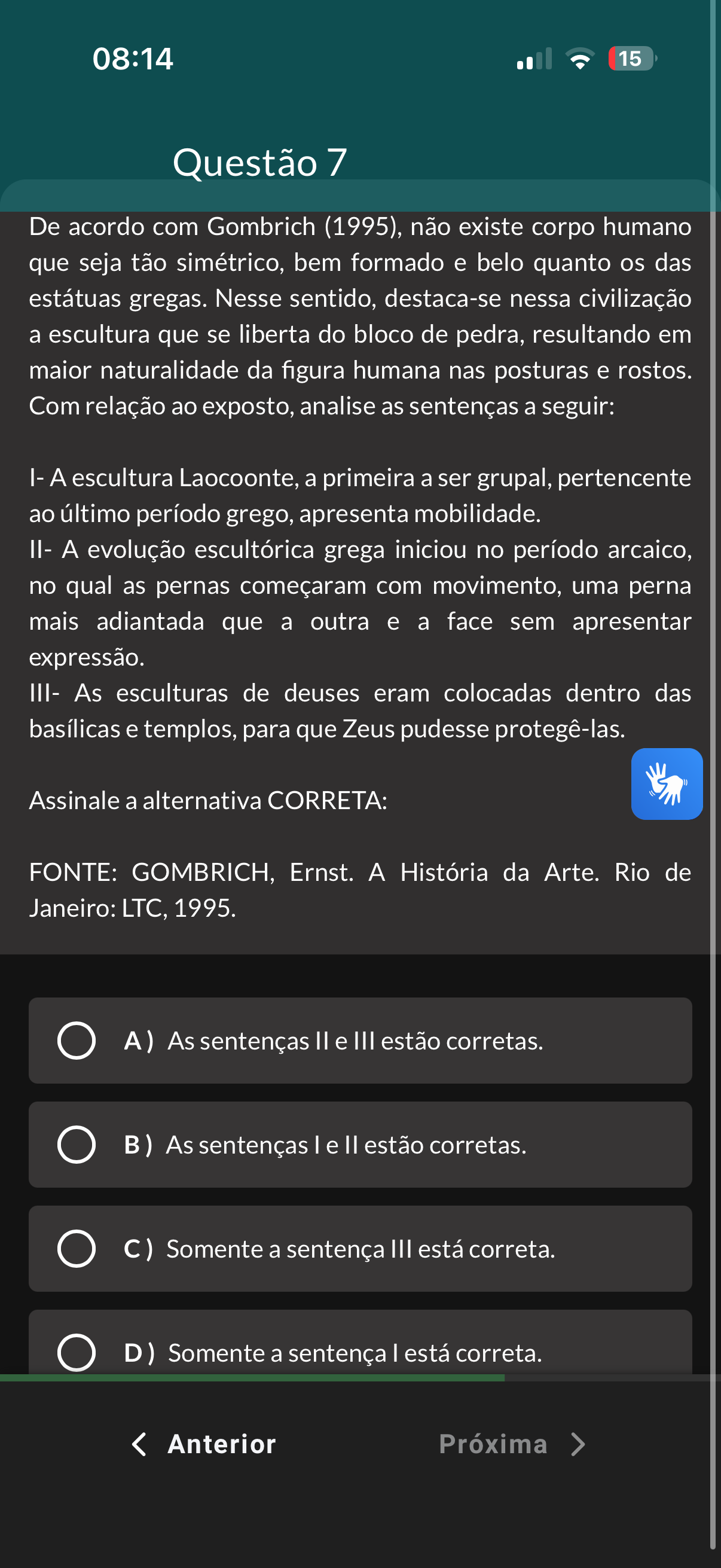 08:14 15 Questão 7 De acordo com Gombrich (1995), não existe corpo humano que seja tão simétrico, bem formado e belo quanto os das estátuas gregas. Nesse sentido, destaca-se nessa civilização a escultura que se liberta do bloco de pedra, resultando em maior naturalidade da figura humana nas posturas e rostos. Com relação ao exposto, analise as sentenças a seguir: I- A escultura Laocoonte, a primeira a ser grupal, pertencente ao último período grego, apresenta mobilidade. II- A evolução escultórica grega iniciou no período arcaico, no qual as pernas começaram com movimento, uma perna mais adiantada que a outra e a face sem apresentar expressão. III- As esculturas de deuses eram colocadas dentro das basílicas e templos, para que Zeus pudesse protegê-las. Assinale a alternativa CORRETA: FONTE: GOMBRICH, Ernst. A História da Arte. Rio de Janeiro: LTC, 1995. A) As sentenças e III estão corretas. B) As sentenças I e II estão corretas. C) Somente a sentença III está correta. D) Somente a sentença I está correta.