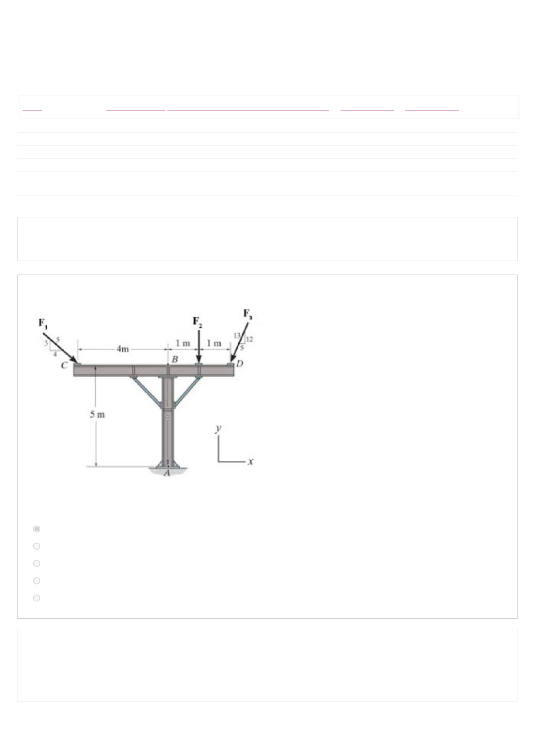 16/05/2023, 21:07 Prova de Grau B: Revisão da tentativa https://antigoeadgraduacao.ftec.com.br/mod/quiz/review.php?attempt=747255&cmid=352794 1/8 Painel / Meus cursos / 2022ED - Introdução a Resistência dos Materiais - G91-1453EAD1A / Grau B e Grau C / Prova de Grau B Iniciado em sexta, 13 Mai 2022, 12:29 Estado Finalizada Concluída em sexta, 13 Mai 2022, 14:24 Tempo empregado 1 hora 54 minutos Avaliar 8,00 de um máximo de 10,00(80%) Questão 1 Correto Atingiu 1,00 de 1,00 Tendo em vista o conjunto de vigas representado pela figura abaixo, precisa-se compreender qual o momento resultante no ponto de apoio A de modo a possibilitar o dimensionamento do seu sistema de fixação. Para tanto, admita que F1=18 kN, F2=14kN e F3=13kN. OBS: Tenha em mente que o momento é dado pela equação M = F.d onde F é a força em N e d é a distância em metros. Escolha uma opção: a. 41,8 N.m b. 34 N.m c. 21 N.m d. 16,6 N.m e. 8,3 N.m Sua resposta está correta. Estando o sistema em equilíbrio, temos: somatório de MA = 0 --- MA + 18.(3/5).4 -18.(4/5).5 - 14.1 - 13.(12/13).2 + 13.(5/13).5 = 0 --- MA = -41,8 N.m A resposta correta é: 41,8 N.m https://antigoeadgraduacao.ftec.com.br/course/view.php?id=4768 https://antigoeadgraduacao.ftec.com.br/my/ https://antigoeadgraduacao.ftec.com.br/course/view.php?id=4768 https://antigoeadgraduacao.ftec.com.br/course/view.php?id=4768§ion=8 https://antigoeadgraduacao.ftec.com.br/mod/quiz/view.php?id=352794 16/05/2023, 21:07 Prova de Grau B: Revisão da tentativa https://antigoeadgraduacao.ftec.com.br/mod/quiz/review.php?attempt=747255&cmid=352794 2/8 Questão 2 Correto Atingiu 1,00 de 1,00 Uma barra de aço em específico tem um comprimento de 2500 mm e área de seção transversal de 215 mm2. Determine o comprimento da barra se esta estiver sujeita a uma tensão axial de 20 kN. O material tem comportamento linear elástico. Dados: E = 200 GPa OBS: tenha em mente que a tensão é resultado de F/A e, pela lei de Hooke σ = ε.E onde ε representa o alongamento linear na direção da aplicação da tensão. Escolha uma opção: a. 2501,16mm b. 2511,63mm c. 2500mm d. 2498,84mm e. 2500,12m Sua resposta está correta. Se entendermos que σ = P/A então temos que σ = 20/215 --- σ = 93,02GPa Então, se σ = ε.E, temos que ε = 93,02/200, então ε = 0,0004651 Com isso, podemos entender que L = Lo + Lo. Ε, então L = 2500 + 2500.0,0004651 --- L = 2501,16mm A resposta correta é: 2501,16mm 16/05/2023, 21:07 Prova de Grau B: Revisão da tentativa https://antigoeadgraduacao.ftec.com.br/mod/quiz/review.php?attempt=747255&cmid=352794 3/8 Questão 3 Completo Atingiu 4,00 de 4,00 Supondo uma viga fixada em um ponto na parede (lado esquerdo) e em um outro ponto não rígido no eixo x (lado direito) conforme demonstra a figura abaixo, a qual está submetida à os carregamentos demonstrados de 100, 400 e 600N contando com as dimensões indicadas. OBS: lembre-se que o momento pode ser definido pela equação M = F.d onde F é a força em N e d é a distância em m. a) Qual a força resultante dos carregamentos aplicados? (2 pontos) b) Qual o ângulo de atuação desta força resultante definida no item a)? (1,0 ponto) c) Qual o momento resultante no ponto A? (1,0 ponto) a) FRx=-100-400cos45º=382,8N FRy= -600-400sen45º=882,8N FR=√(382,8)²+(882,8)²=962N b) Φ=tg -¹ (882,8/382,8)= 66º c) Ma=100 . 0 - 600 . 0,4 - 400 . sen 45º . 0,8 - 400 . cos 45º . 0,3 = 551 N.m 16/05/2023, 21:07 Prova de Grau B: Revisão da tentativa https://antigoeadgraduacao.ftec.com.br/mod/quiz/review.php?attempt=747255&cmid=352794 4/8 a) Qual a força resultante dos carregamentos aplicados? (2 pontos) Somatório de Forças em x --- Fx = -100 - 400.cos45º --- Fx = 382,8N Somatório de Forças em y --- Fy = -600 - 400.sen45º --- Fx = 882,8N Força resultante FR = RAIZ (Fx^2 + Fy^2) --- FR = RAIZ (382,8^2 + 882,9^2) --- FR = 962N b) Qual o ângulo de atuação desta força resultante definida no item a)? (1,0 ponto) Angulo h ---- h = arctan (Fy/Fx) --- h = arctan(882,8/382,8) ---- h = 66,6º c) Qual o momento resultante no ponto A? (1,0 ponto) Somatório de momentos em A --- MA = 100.0 - 600.0,4 - (400.sen45).0,8 - (400.cos45).0,3 ---- MA = 551 N.m Comentário: a) correto b) correto c) correto 16/05/2023, 21:07 Prova de Grau B: Revisão da tentativa https://antigoeadgraduacao.ftec.com.br/mod/quiz/review.php?attempt=747255&cmid=352794 5/8 Questão 4 Incorreto Atingiu 0,00 de 1,00 Se duas tensões iguais T geram força de 5 kN, conforme demonstra a figura abaixo, qual o valor da tensão T? OBS: tenha como base as seguintes equações: Escolha uma opção: a. 2,5 kN b. 5,0 kN c. 1,44 kN d. 2,89 kN e. 5,78 kN Sua resposta está incorreta. Pela lei dos senos temos: 5/sen120° = T/sen30° --- T = 2,89kN A resposta correta é: 2,89 kN 16/05/2023, 21:07 Prova de Grau B: Revisão da tentativa https://antigoeadgraduacao.ftec.com.br/mod/quiz/review.php?attempt=747255&cmid=352794 6/8 Questão 5 Correto Atingiu 1,00 de 1,00 O diagrama tensão deformação para uma liga de alumínio utilizada na fabricação de peças de aeronaves é mostrado na figura abaixo. Sendo um corpo de prova desse material submetido à tensão de tração de 600 MPa, determine a quantidade % de deformação permanente no corpo de prova quando a carga é retirada. Considere que a tensão pode ser determinada pela equação σ = ε.E onde ε é a deformação do material e E é o seu módulo de elasticidade. Escolha uma opção: a. 1,5% b. 0,6% c. 1,7% d. 1% e. 2,3% Sua resposta está correta. Entendendo-se que a deformação % permanente do corpo é denotada pelo ponto B do gráfico onde ε = 0,023 e a deformação elástica é denotada pelo ponto A do gráfico onde ε = 0,006 então a quantidade % de deformação permanente pode ser entendida por εB - εA, sendo assim, 0,023 - 0,006 = 0,017 mm/mm ou 1,7% A resposta correta é: 1,7% 16/05/2023, 21:07 Prova de Grau B: Revisão da tentativa https://antigoeadgraduacao.ftec.com.br/mod/qui